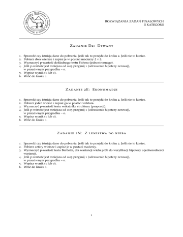 ROZWIAZANIA ˛ ZADAŃ FINAŁOWYCH II KATEGORII Z adanie D 2: D ywany Sprawdź czy istnieja˛ dane do pobrania. Jeśli tak to przejdź do kroku 2. Jeśli nie to koniec. Pobierz dwa wiersze i zapisz je w postaci macierzy 2 × 2. Wyznaczyć p-wartość dokładnego testu Fishera (jednostronnego). Jeśli p-wartość jest mniejsza od 0.05 przyjmij 1 (odrzucenie hipotezy zerowej), w przeciwnym przypadku – 0. 5. Wypisz wynik (1 lub 0). 6. Wróć do kroku 1. 1. 2. 3. 4. Zadanie 2 E: E konomadzi Sprawdź czy istnieja˛ dane do pobrania. Jeśli tak to przejdź do kroku 2. Jeśli nie to koniec. Pobierz jeden wiersz i zapisz go w postaci wektora. Wyznaczyć p-wartość testu wskaźnika struktury (proporcji). Jeśli p-wartość jest mniejsza od 0.05 przyjmij 1 (odrzucenie hipotezy zerowej), w przeciwnym przypadku – 0. 5. Wypisz wynik (1 lub 0). 6. Wróć do kroku 1. 1. 2. 3. 4. Zadanie 2 N: Z lenistwa do nieba 1. Sprawdź czy istnieja˛ dane do pobrania. Jeśli tak to przejdź do kroku 2. Jeśli nie to koniec. 2. Pobierz cztery wiersze i zapisz je w postaci macierzy. 3. Wyznaczyć p-wartość testu Bartletta, dla wariancji wielu prób do weryfikacji hipotezy o jednorodności wariancji. 4. Jeśli p-wartość jest mniejsza od 0.05 przyjmij 1 (odrzucenie hipotezy zerowej), w przeciwnym przypadku – 0. 5. Wypisz wynik (1 lub 0). 6. Wróć do kroku 1. 1 ROZWIAZANIA ˛ ZADAŃ FINAŁOWYCH III KATEGORII Z adanie 2 P: D ruga połówka Sprawdź czy istnieja˛ dane do pobrania. Jeśli tak to przejdź do kroku 2. Jeśli nie to koniec. Pobierz pierwszy wiersz i zapisz go w postaci wektora prawdopodobieństw. Pobierz drugi i zapisz go w postaci zmiennej n. Pobierz kolejne n wierszy i zapisz je w postaci macierzy 2 × n. Wyznaczyć macierz kontyngencji na podstawie macierzy. Elementy z wiersza "A" pomnóż przez wektor prawdopodobieństw i podziel przez liczbe˛ wszystkich elementów w danej kategorii. 7. Zsumuj elementy otrzymanego wektora. 8. Wypisz wynik. 9. Wróć do kroku 1. 1. 2. 3. 4. 5. 6. Zadanie 2 Z: Z egarkowe Eldorado 1. 2. 3. 4. 5. Sprawdź czy istnieja˛ dane do pobrania. Jeśli tak to przejdź do kroku 2. Jeśli nie to koniec. Pobierz jeden wiersz i zapisz go w postaci wektora. Wyznacz średnia. ˛ Wypisz wynik. Wróć do kroku 1. 2