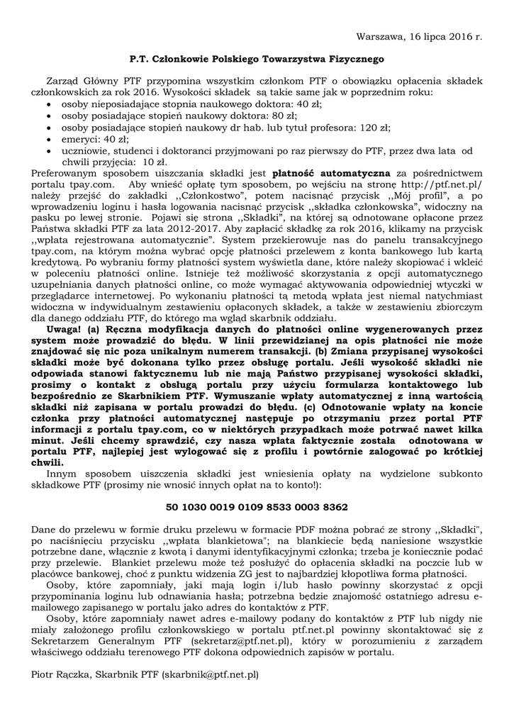 Warszawa, 16 lipca 2016 r. P.T. Członkowie Polskiego Towarzystwa Fizycznego Zarząd Główny PTF przypomina wszystkim członkom PTF o obowiązku opłacenia składek członkowskich za rok 2016. Wysokości składek są takie same jak w poprzednim roku: osoby nieposiadające stopnia naukowego doktora: 40 zł; osoby posiadające stopień naukowy doktora: 80 zł; osoby posiadające stopień naukowy dr hab. lub tytuł profesora: 120 zł; emeryci: 40 zł; uczniowie, studenci i doktoranci przyjmowani po raz pierwszy do PTF, przez dwa lata od chwili przyjęcia: 10 zł. Preferowanym sposobem uiszczania składki jest płatność automatyczna za pośrednictwem portalu tpay.com. Aby wnieść opłatę tym sposobem, po wejściu na stronę http://ptf.net.pl/ należy przejść do zakładki ,,Członkostwo”, potem nacisnąć przycisk ,,Mój profil”, a po wprowadzeniu loginu i hasła logowania nacisnąć przycisk ,,składka członkowska”, widoczny na pasku po lewej stronie. Pojawi się strona ,,Składki”, na której są odnotowane opłacone przez Państwa składki PTF za lata 2012-2017. Aby zapłacić składkę za rok 2016, klikamy na przycisk ,,wpłata rejestrowana automatycznie”. System przekierowuje nas do panelu transakcyjnego tpay.com, na którym można wybrać opcję płatności przelewem z konta bankowego lub kartą kredytową. Po wybraniu formy płatności system wyświetla dane, które należy skopiować i wkleić w poleceniu płatności online. Istnieje też możliwość skorzystania z opcji automatycznego uzupełniania danych płatności online, co może wymagać aktywowania odpowiedniej wtyczki w przeglądarce internetowej. Po wykonaniu płatności tą metodą wpłata jest niemal natychmiast widoczna w indywidualnym zestawieniu opłaconych składek, a także w zestawieniu zbiorczym dla danego oddziału PTF, do którego ma wgląd skarbnik oddziału. Uwaga! (a) Ręczna modyfikacja danych do płatności online wygenerowanych przez system może prowadzić do błędu. W linii przewidzianej na opis płatności nie może znajdować się nic poza unikalnym numerem transakcji. (b) Zmiana przypisanej wysokości składki może być dokonana tylko przez obsługę portalu. Jeśli wysokość składki nie odpowiada stanowi faktycznemu lub nie mają Państwo przypisanej wysokości składki, prosimy o kontakt z obsługą portalu przy użyciu formularza kontaktowego lub bezpośrednio ze Skarbnikiem PTF. Wymuszanie wpłaty automatycznej z inną wartością składki niż zapisana w portalu prowadzi do błędu. (c) Odnotowanie wpłaty na koncie członka przy płatności automatycznej następuje po otrzymaniu przez portal PTF informacji z portalu tpay.com, co w niektórych przypadkach może potrwać nawet kilka minut. Jeśli chcemy sprawdzić, czy nasza wpłata faktycznie została odnotowana w portalu PTF, najlepiej jest wylogować się z profilu i powtórnie zalogować po krótkiej chwili. Innym sposobem uiszczenia składki jest wniesienia opłaty na wydzielone subkonto składkowe PTF (prosimy nie wnosić innych opłat na to konto!): 50 1030 0019 0109 8533 0003 8362 Dane do przelewu w formie druku przelewu w formacie PDF można pobrać ze strony ,,Składki", po naciśnięciu przycisku ,,wpłata blankietowa"; na blankiecie będą naniesione wszystkie potrzebne dane, włącznie z kwotą i danymi identyfikacyjnymi członka; trzeba je koniecznie podać przy przelewie. Blankiet przelewu może też posłużyć do opłacenia składki na poczcie lub w placówce bankowej, choć z punktu widzenia ZG jest to najbardziej kłopotliwa forma płatności. Osoby, które zapomniały, jaki mają login i/lub hasło powinny skorzystać z opcji przypominania loginu lub odnawiania hasła; potrzebna będzie znajomość ostatniego adresu emailowego zapisanego w portalu jako adres do kontaktów z PTF. Osoby, które zapomniały nawet adres e-mailowy podany do kontaktów z PTF lub nigdy nie miały założonego profilu członkowskiego w portalu ptf.net.pl powinny skontaktować się z Sekretarzem Generalnym PTF ([email protected]), który w porozumieniu z zarządem właściwego oddziału terenowego PTF dokona odpowiednich zapisów w portalu. Piotr Rączka, Skarbnik PTF ([email protected])