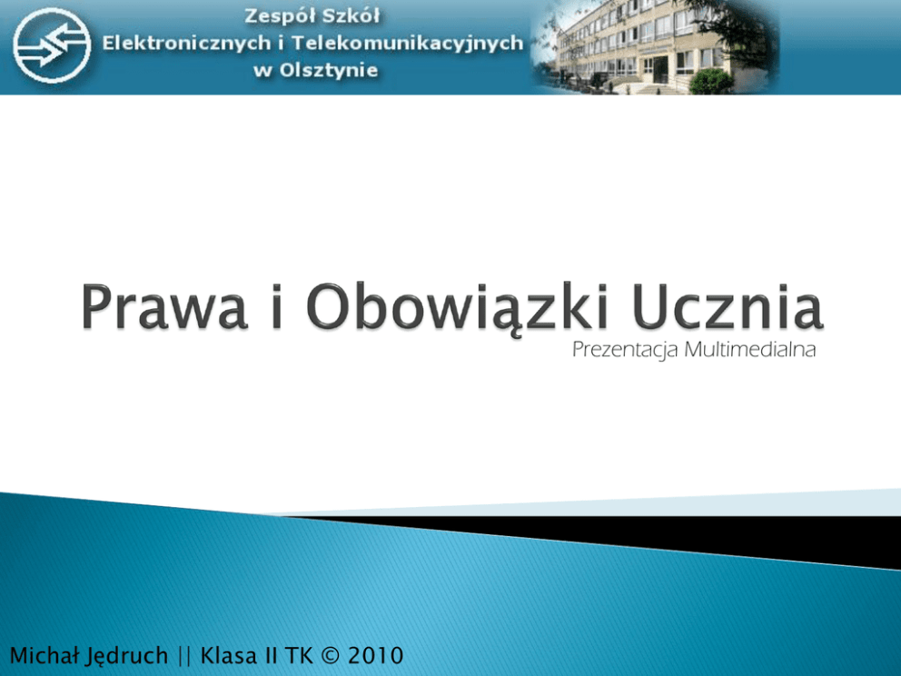 Prezentacja Multimedialna Michał Jędruch || Klasa II TK © 2010 Prawa Obowiązki •Kliknij •Klinkij PRAWA UCZNIA § 40 Uczeń ma prawo do: 1. Właściwie zorganizowanego procesu kształcenia zgodnie z zasadami higieny pracy Umysłowej 2. Opieki wychowawczej i warunków pobytu w szkole zapewniających bezpieczeństwo, ochronę przed wszelkimi formami przemocy fizycznej bądź psychicznej oraz ochrony i poszanowania jego godności, 3. Korzystania z pomocy stypendialnej bądź doraźnej, zgodnie z odrębnymi przepisami /w miarę posiadanych przez szkołę środków/ 4. Życzliwego, podmiotowego traktowania w procesie dydaktyczno – wychowawczym 5. Swobodnego wyrażania myśli, przekonań, w szczególności dotyczących życia szkoły a także światopoglądowych i religijnych, jeżeli nie narusza tym dobra innych osób 6. Rozwijania zainteresowań, zdolności i talentów poprzez swobodny wybór zajęć nadobowiązkowych, kół zainteresowań i innych form zajęć pozalekcyjnych; reprezentowania szkoły w olimpiadach, konkursach itp., 7. Sprawiedliwej, obiektywnej i jawnej oceny oraz ustalonych sposobów kontroli postępów w nauce, 8. Zapoznania się z programem nauczania, z jego treściami i celami oraz stawianymi wymaganiami Powrót do Spisu Treści Prawa: 9-16 PRAWA UCZNIA § 40 Uczeń ma prawo do: 9. Uzyskiwanej informacji o terminie i zakresie materiału pisemnych sprawdzianów trwających co najmniej 1 godzinę lekcyjną z wyprzedzeniem tygodniowym; w danym dniu może być przeprowadzony tylko jeden taki sprawdzian; wynik sprawdzianu powinien być podany do 2 tygodni, a kolejny sprawdzian z danego przedmiotu nie może odbyć się przed poinformowaniem o wynikach sprawdzianu poprzedniego 10. Zwolnienia z pisemnego sprawdzianu w przypadku dłuższej, usprawiedliwionej nieobecności – termin uzupełnienia braków ustala nauczyciel 11. Zwolnienia z odpowiedzi ustnej w dniu, w którym został wylosowany jego numer z dziennika, tzw. „szczęśliwy numerek” (nie zwalnia to ucznia z pracy na lekcji oraz wcześniej zapowiedzianego sprawdzianu) 12. Uczeń klasy pierwszej na początku pierwszego semestru ma prawo do dwutygodniowego tzw. okresu ochronnego, w którym nauczyciel nie ma prawa wstawić uczniowi oceny niedostatecznej 13. Korzystania z pomieszczeń szkolnych, sprzętu, środków dydaktycznych, księgozbioru biblioteki podczas zajęć pozalekcyjnych 14. Korzystania z poradnictwa psychologiczno – pedagogicznego i zawodowego 15. Wypoczynku świątecznego, wakacyjnego i podczas ferii 16. Swobodnej wypowiedzi oraz otrzymywania i przekazywania informacji Prawa: 1-8 Prawa: 17-24 PRAWA UCZNIA § 40 Uczeń ma prawo do: 17. Uzyskiwania różnych informacji oraz ochrony przed szkodliwymi informacjami 18. Wolności od poniżającego traktowania i karania 19. Wyrażania poglądów w sprawach jego dotyczących 20. Prywatności korespondencji i Ŝycia rodzinnego oraz prawo do ochrony prawnej 21. uczeń ma prawo do pomocy ze strony nauczyciela w przypadku trudności w nauce, 22. Uczeń ma prawo do pomocy ze strony wychowawcy i samorządu klasowego w opanowaniu materiału, który sprawia mu trudności, między innymi poprzez właściwe zorganizowanie samopomocy koleŜeńskiej, 23. uczeń ma prawo wpływania na Ŝycie szkoły przez działalność samorządową, zrzeszanie się w organizacjach działających w szkole, 24. W sytuacjach naruszenia prawa uczeń moŜe zwrócić się z prośbą do dyrektora o udzielenie informacji o sposobie dalszego postępowania. Dyrektor szkoły ma obowiązek poinformować ucznia o instytucjach, do których moŜe składać odwołanie. Prawa: 9-16 Prawa: Spis Treści 1-8 OBOWIĄZKI UCZNIA § 41 Uczeń ma obowiązek: 1. Uczeń ma obowiązek przestrzegania postanowień zawartych w statucie szkoły. 2. Uczeń szkoły ma obowiązek: Kliknij, aby pokazać pełną liste… 3. Uczeń zobowiązany jest do usprawiedliwienia kaŜdej swojej nieobecności z podaniem przyczyny. Usprawiedliwienia nieobecności na zajęciach lekcyjnych uczeń powinien dokonać w pierwszym dniu pobytu w szkole po nieobecności. 4. W przypadku nieprzestrzegania obowiązków ucznia, uczeń moŜe poprzez podjęcie pracy społecznej na rzecz szkoły minimalizować stopień represji karnej (obniŜenie stopnia kary, skrócenie okresu działania kary...). Powrót do Spisu Treści Obowiązki: 5-9 OBOWIĄZKI UCZNIA § 41 Uczeń ma obowiązek: 5. Uczeń przestrzega ogólnie przyjętych zasad norm współŜycia społecznego, postępuje uczciwie, jest prawdomówny. W razie sporów między uczniami mediatorem jest wychowawca klasy, a w razie konfliktów między uczniem a nauczycielem mediatorem jest dyrektor szkoły. Wszelkie spory rozstrzygane są na zasadach negocjacji, porozumienia i wzajemnego poszanowania stron. 6. Ucznia obwiązuje zmiana obuwia na terenie szkoły, w sali gimnastycznej - obuwie sportowe miękkie, na boiskach – obuwie wskazane przez nauczyciela. 7. Uczeń ma obowiązek bezwzględnego przestrzegania regulaminów poszczególnych pracowni, świetlicy, biblioteki, multimedialnego centrum informacji, sali kinowej, sali gimnastycznej i szatni szkolnej. 8. Uczniowie są zobowiązani nadrobić stracone zajęcia w dniu ustawowo wolnym od nauki wyznaczonym przez dyrekcję szkoły, jeśli dyrektor będzie zmuszony odwołać lub przerwać zajęcia spowodowane przewinieniem uczniów. 9. Uczeń powinien przestrzegać ustaleń organów szkoły oraz władz oświatowych. Obowiązki: 1-4 Spis Treści OBOWIĄZKI UCZNIA § 41 pkt. 2 Uczeń ma obowiązek: a) Wykorzystania w pełni czasu przeznaczonego na naukę b) Uczęszczania na zajęcia wynikające z planu zajęć i przybywania na nie punktualnie. W razie spóźnienia na zajęcia, uczeń zobowiązany jest udać się do sali, w której się one odbywają. c) Przestrzegania zakazu opuszczania terenu szkoły w czasie godzin lekcyjnych d) Systematycznego przygotowywania się do zajęć i odrabiania prac domowych e) Zachowywać należytą uwagę w czasie 