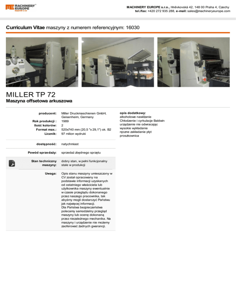MACHINERY EUROPE s.r.o., Hněvkovská 42, 148 00 Praha 4, Czechy tel./fax: +420 272 935 288, e-mail: [email protected] Curriculum Vitae maszyny z numerem referencyjnym: 16030 MILLER TP 72 Maszyna offsetowa arkuszowa producent: Rok produkcji : Ilość kolorów: Format max.: Licznik: dostępność: Powód sprzedaży: Stan techniczny maszyny: Uwaga: Miller Druckmaschienen GmbH, Geisenheim, Germany 1989 2 520x740 mm (20,5 "x 29,1") ok. B2 97 milion wydruki natychmiast sprzedaż zbędnego sprzętu dobry stan, w pełni funkcjonalny stale w produkcji Opis stanu maszyny umieszczony w CV został opracowany na podstawie informacji uzyskanych od ostatniego właściciela lub użytkownika maszyny ewentualnie w czasie przeglądu dokonanego przez naszego pracownika, tak abyśmy mogli dostarczyć Państwu jak najwięcej informacji. Dla Państwa bezpieczeństwa polecamy samodzielny przegląd maszyny lub ocenę dokonaną przez niezależnego mechanika. Na maszyny i urządzenie nie możemy zaoferować żadnych gwarancji. opis dodatkowy: alkoholowe nawilżanie Chłodzenie i cyrkulacje Baldwin urządzenie nie odwracając wysokie wykładanie ręczne zakładanie płyt proszkownica