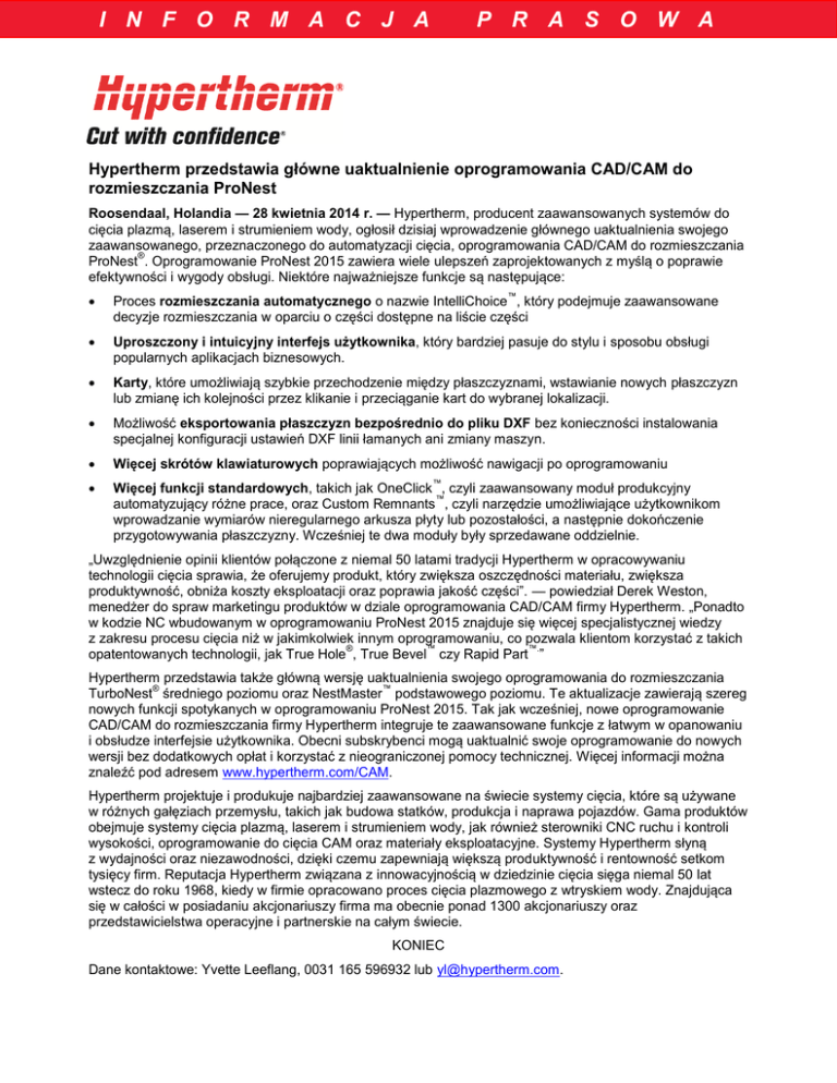 I N F O R M A C J A P R A S O W A Hypertherm przedstawia główne uaktualnienie oprogramowania CAD/CAM do rozmieszczania ProNest Roosendaal, Holandia — 28 kwietnia 2014 r. — Hypertherm, producent zaawansowanych systemów do cięcia plazmą, laserem i strumieniem wody, ogłosił dzisiaj wprowadzenie głównego uaktualnienia swojego zaawansowanego, przeznaczonego do automatyzacji cięcia, oprogramowania CAD/CAM do rozmieszczania ® ProNest . Oprogramowanie ProNest 2015 zawiera wiele ulepszeń zaprojektowanych z myślą o poprawie efektywności i wygody obsługi. Niektóre najważniejsze funkcje są następujące: ™ Proces rozmieszczania automatycznego o nazwie IntelliChoice , który podejmuje zaawansowane decyzje rozmieszczania w oparciu o części dostępne na liście części Uproszczony i intuicyjny interfejs użytkownika, który bardziej pasuje do stylu i sposobu obsługi popularnych aplikacjach biznesowych. Karty, które umożliwiają szybkie przechodzenie między płaszczyznami, wstawianie nowych płaszczyzn lub zmianę ich kolejności przez klikanie i przeciąganie kart do wybranej lokalizacji. Możliwość eksportowania płaszczyzn bezpośrednio do pliku DXF bez konieczności instalowania specjalnej konfiguracji ustawień DXF linii łamanych ani zmiany maszyn. Więcej skrótów klawiaturowych poprawiających możliwość nawigacji po oprogramowaniu Więcej funkcji standardowych, takich jak OneClick , czyli zaawansowany moduł produkcyjny ™ automatyzujący różne prace, oraz Custom Remnants , czyli narzędzie umożliwiające użytkownikom wprowadzanie wymiarów nieregularnego arkusza płyty lub pozostałości, a następnie dokończenie przygotowywania płaszczyzny. Wcześniej te dwa moduły były sprzedawane oddzielnie. ™ „Uwzględnienie opinii klientów połączone z niemal 50 latami tradycji Hypertherm w opracowywaniu technologii cięcia sprawia, że oferujemy produkt, który zwiększa oszczędności materiału, zwiększa produktywność, obniża koszty eksploatacji oraz poprawia jakość części”. — powiedział Derek Weston, menedżer do spraw marketingu produktów w dziale oprogramowania CAD/CAM firmy Hypertherm. „Ponadto w kodzie NC wbudowanym w oprogramowaniu ProNest 2015 znajduje się więcej specjalistycznej wiedzy z zakresu procesu cięcia niż w jakimkolwiek innym oprogramowaniu, co pozwala klientom korzystać z takich ® ™ ™. opatentowanych technologii, jak True Hole , True Bevel czy Rapid Part ” Hypertherm przedstawia także główną wersję uaktualnienia swojego oprogramowania do rozmieszczania ® ™ TurboNest średniego poziomu oraz NestMaster podstawowego poziomu. Te aktualizacje zawierają szereg nowych funkcji spotykanych w oprogramowaniu ProNest 2015. Tak jak wcześniej, nowe oprogramowanie CAD/CAM do rozmieszczania firmy Hypertherm integruje te zaawansowane funkcje z łatwym w opanowaniu i obsłudze interfejsie użytkownika. Obecni subskrybenci mogą uaktualnić swoje oprogramowanie do nowych wersji bez dodatkowych opłat i korzystać z nieograniczonej pomocy technicznej. Więcej informacji można znaleźć pod adresem www.hypertherm.com/CAM. Hypertherm projektuje i produkuje najbardziej zaawansowane na świecie systemy cięcia, które są używane w różnych gałęziach przemysłu, takich jak budowa statków, produkcja i naprawa pojazdów. Gama produktów obejmuje systemy cięcia plazmą, laserem i strumieniem wody, jak również sterowniki CNC ruchu i kontroli wysokości, oprogramowanie do cięcia CAM oraz materiały eksploatacyjne. Systemy Hypertherm słyną z wydajności oraz niezawodności, dzięki czemu zapewniają większą produktywność i rentowność setkom tysięcy firm. Reputacja Hypertherm związana z innowacyjnością w dziedzinie cięcia sięga niemal 50 lat wstecz do roku 1968, kiedy w firmie opracowano proces cięcia plazmowego z wtryskiem wody. Znajdująca się w całości w posiadaniu akcjonariuszy firma ma obecnie ponad 1300 akcjonariuszy oraz przedstawicielstwa operacyjne i partnerskie na całym świecie. KONIEC Dane kontaktowe: Yvette Leeflang, 0031 165 596932 lub [email protected].