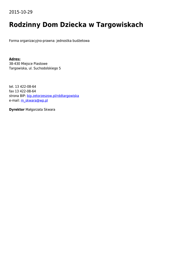 2015-10-29 Rodzinny Dom Dziecka w Targowiskach Forma organizacyjno-prawna: jednostka budżetowa Adres: 38-430 Miejsce Piastowe Targowiska, ul. Suchodolskiego 5 tel. 13 422-08-64 fax 13 422-08-64 strona BIP: bip.zetorzeszow.pl/rddtargowiska e-mail: [email protected] Dyrektor Małgorzata Skwara