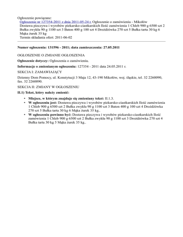 Ogłoszenie powiązane: Ogłoszenie nr 127354-2011 z dnia 2011-05-24 r. Ogłoszenie o zamówieniu - Mikołów Dostawa pieczywa i wyrobów piekarsko-ciastkarskich Ilość zamówienia 1 Chleb 900 g 6500 szt 2 Bułka zwykła 90 g 1100 szt 3 Baton 400 g 100 szt 4 Drożdżówka 270 szt 5 Bułka tarta 30 kg 6 Mąka żurek 35 kg Termin składania ofert: 2011-06-02 Numer ogłoszenia: 131596 - 2011; data zamieszczenia: 27.05.2011 OGŁOSZENIE O ZMIANIE OGŁOSZENIA Ogłoszenie dotyczy: Ogłoszenia o zamówieniu. Informacje o zmienianym ogłoszeniu: 127354 - 2011 data 24.05.2011 r. SEKCJA I: ZAMAWIAJĄCY Dzienny Dom Pomocy, ul. Konstytucji 3 Maja 12, 43-190 Mikołów, woj. śląskie, tel. 32 2260090, fax. 32 2260090. SEKCJA II: ZMIANY W OGŁOSZENIU II.1) Tekst, który należy zmienić: • Miejsce, w którym znajduje się zmieniany tekst: II.1.3. • W ogłoszeniu jest: Dostawa pieczywa i wyrobów piekarsko-ciastkarskich Ilość zamówienia 1 Chleb 900 g 6500 szt 2 Bułka zwykła 90 g 1100 szt 3 Baton 400 g 100 szt 4 Drożdżówka 270 szt 5 Bułka tarta 30 kg 6 Mąka żurek 35 kg.. • W ogłoszeniu powinno być: Dostawa pieczywa i wyrobów piekarsko-ciastkarskich Ilość zamówienia 1 Chleb 900 g 6500 szt 2 Bułka zwykła 90 g 1100 szt 3 Drożdżówka 270 szt 4 Bułka tarta 30 kg 5 Mąka żurek 35 kg..