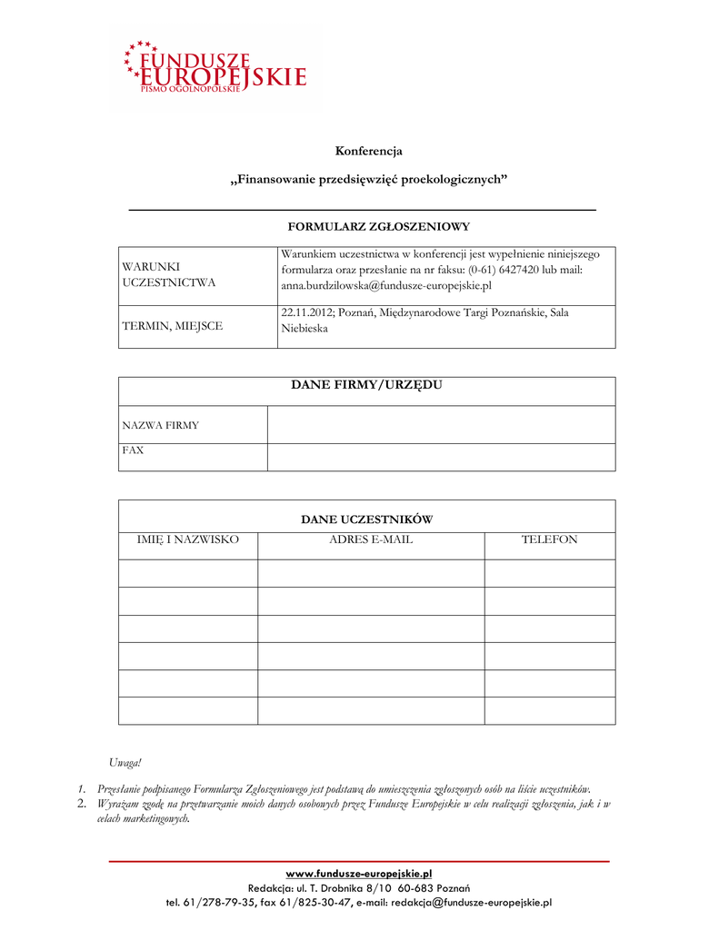 Konferencja ,,Finansowanie przedsięwzięć proekologicznych” FORMULARZ ZGŁOSZENIOWY WARUNKI UCZESTNICTWA Warunkiem uczestnictwa w konferencji jest wypełnienie niniejszego formularza oraz przesłanie na nr faksu: (0-61) 6427420 lub mail: [email protected] TERMIN, MIEJSCE 22.11.2012; Poznań, Międzynarodowe Targi Poznańskie, Sala Niebieska DANE FIRMY/URZĘDU NAZWA FIRMY FAX DANE UCZESTNIKÓW IMIĘ I NAZWISKO ADRES E-MAIL TELEFON Uwaga! 1. Przesłanie podpisanego Formularza Zgłoszeniowego jest podstawą do umieszczenia zgłoszonych osób na liście uczestników. 2. Wyrażam zgodę na przetwarzanie moich danych osobowych przez Fundusze Europejskie w celu realizacji zgłoszenia, jak i w celach marketingowych. www.fundusze-europejskie.pl Redakcja: ul. T. Drobnika 8/10 60-683 Poznań tel. 61/278-79-35, fax 61/825-30-47, e-mail: [email protected]