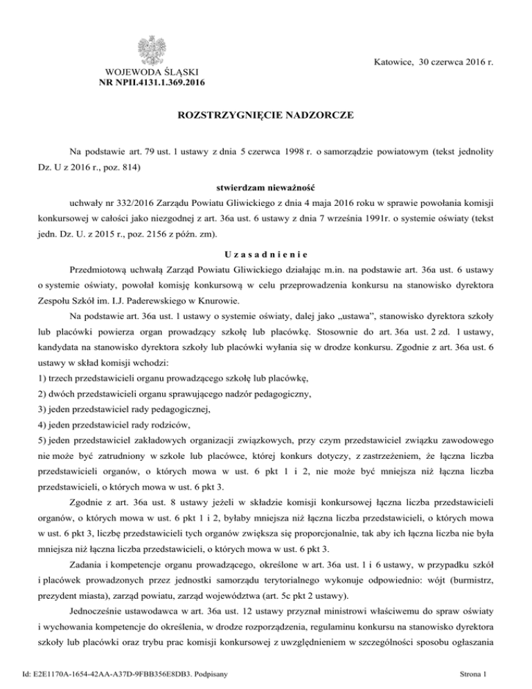 Katowice, 30 czerwca 2016 r. WOJEWODA ŚLĄSKI NR NPII.4131.1.369.2016 ROZSTRZYGNIĘCIE NADZORCZE Na podstawie art. 79 ust. 1 ustawy z dnia 5 czerwca 1998 r. o samorządzie powiatowym (tekst jednolity Dz. U z 2016 r., poz. 814) stwierdzam nieważność uchwały nr 332/2016 Zarządu Powiatu Gliwickiego z dnia 4 maja 2016 roku w sprawie powołania komisji konkursowej w całości jako niezgodnej z art. 36a ust. 6 ustawy z dnia 7 września 1991r. o systemie oświaty (tekst jedn. Dz. U. z 2015 r., poz. 2156 z późn. zm). Uzasadnienie Przedmiotową uchwałą Zarząd Powiatu Gliwickiego działając m.in. na podstawie art. 36a ust. 6 ustawy o systemie oświaty, powołał komisję konkursową w celu przeprowadzenia konkursu na stanowisko dyrektora Zespołu Szkół im. I.J. Paderewskiego w Knurowie. Na podstawie art. 36a ust. 1 ustawy o systemie oświaty, dalej jako „ustawa”, stanowisko dyrektora szkoły lub placówki powierza organ prowadzący szkołę lub placówkę. Stosownie do art. 36a ust. 2 zd. 1 ustawy, kandydata na stanowisko dyrektora szkoły lub placówki wyłania się w drodze konkursu. Zgodnie z art. 36a ust. 6 ustawy w skład komisji wchodzi: 1) trzech przedstawicieli organu prowadzącego szkołę lub placówkę, 2) dwóch przedstawicieli organu sprawującego nadzór pedagogiczny, 3) jeden przedstawiciel rady pedagogicznej, 4) jeden przedstawiciel rady rodziców, 5) jeden przedstawiciel zakładowych organizacji związkowych, przy czym przedstawiciel związku zawodowego nie może być zatrudniony w szkole lub placówce, której konkurs dotyczy, z zastrzeżeniem, że łączna liczba przedstawicieli organów, o których mowa w ust. 6 pkt 1 i 2, nie może być mniejsza niż łączna liczba przedstawicieli, o których mowa w ust. 6 pkt 3. Zgodnie z art. 36a ust. 8 ustawy jeżeli w składzie komisji konkursowej łączna liczba przedstawicieli organów, o których mowa w ust. 6 pkt 1 i 2, byłaby mniejsza niż łączna liczba przedstawicieli, o których mowa w ust. 6 pkt 3, liczbę przedstawicieli tych organów zwiększa się proporcjonalnie, tak aby ich łączna liczba nie była mniejsza niż łączna liczba przedstawicieli, o których mowa w ust. 6 pkt 3. Zadania i kompetencje organu prowadzącego, określone w art. 36a ust. 1 i 6 ustawy, w przypadku szkół i placówek prowadzonych przez jednostki samorządu terytorialnego wykonuje odpowiednio: wójt (burmistrz, prezydent miasta), zarząd powiatu, zarząd województwa (art. 5c pkt 2 ustawy). Jednocześnie ustawodawca w art. 36a ust. 12 ustawy przyznał ministrowi właściwemu do spraw oświaty i wychowania kompetencje do określenia, w drodze rozporządzenia, regulaminu konkursu na stanowisko dyrektora szkoły lub placówki oraz trybu prac komisji konkursowej z uwzględnieniem w szczególności sposobu ogłaszania Id: E2E1170A-1654-42AA-A37D-9FBB356E8DB3. Podpisany Strona 1 konkursu oraz sposobu nadzorowania prawidłowości postępowania konkursowego przez organ prowadzący szkołę lub placówkę. Minister Edukacji Narodowej, realizując delegację ustawową, wydał w dniu 8 kwietnia 2010r. rozporządzenie w sprawie regulaminu konkursu na stanowisko dyrektora publicznej szkoły lub publicznej placówki oraz trybu prac komisji konkursowej (Dz. U. z 2010r. Nr 60, poz. 373 ze zm.). Przepis § 2 przywołanego rozporządzenia stanowi, iż "organ prowadzący publiczne przedszkole, publiczną szkołę lub publiczną placówkę wyznacza przewodniczącego komisji konkursowej (…), który kieruje jej pracami". Do wyłącznych kompetencji organu prowadzącego publiczne przedszkole, publiczną szkołę lub publiczną placówkę należy również zatwierdzenie konkursu albo unieważnienie konkursu i zarządzenie ponownego jego przeprowadzenia, w przypadku stwierdzenia nieprawidłowości, o których mowa w § 8 ust. 2 rozporządzenia. Działając w oparciu o ww. przepisy ustawowe i wykonawcze Zarząd Powiatu Gliwickiego określił w § 1 przedmiotowej uchwały skład komisji konkursowej powołanej w celu przeprowadzenia konkursu na stanowisko dyrektora Zespołu Szkół im. I.J. Paderewskiego w Knurowie. Po analizie przedmiotowej uchwały organ nadzoru stwierdził, że narusza ona obowiązujące przepisy prawa. W skład komisji zostali bowiem powołani członkowie Zarządu Powiatu Gliwickiego: Pan Jacek Zarzycki oraz Pani Ewa Jurczyga (Wicestarosta) – jako przewodnicząca komisji. Taki skład komisji konkursowej jest niezgodny, zdaniem organu nadzoru, z przepisem art. 36a ust. 6 pkt 1 ustawy. W opinii organu nadzoru analiza przepisów ustawy o systemie oświaty prowadzi do wniosku, iż osoba pełniąca funkcję organu prowadzącego szkołę nie może być członkiem komisji powołanej celem przeprowadzenia konkursu na dyrektora szkoły (placówki). Jak wskazano w wyroku Naczelnego Sądu Administracyjnego z dnia 25 listopada 2014 r. (sygn. akt I OSK 2185/14, Centralna Baza Orzeczeń Sądów Administracyjnych) "komisja konkursowa ma przyznaną kompetencję wyłonienia kandydata na stanowisko dyrektora szkoły lub placówki. Działa we własnym imieniu, a jej działanie podlega nadzorowi organu prowadzącego szkołę lub placówkę. Rozdzielenie kompetencji organu prowadzącego szkołę lub placówkę od kompetencji komisji konkursowej wyłącza powołanie w skład komisji konkursowej organu prowadzącego szkołę (wójta, burmistrza, prezydenta miasta), jak i przyjęcie, że powołani przedstawiciele organu prowadzącego szkołę działają na zasadzie przedstawicielstwa w rozumieniu przepisów Kodeksu cywilnego, co oznaczałoby dopuszczalność zamiast powołania przedstawiciela wejścia w skład komisji konkursowej, organu prowadzącego szkołę lub placówkę." Tym samym, jak podkreślił Wojewódzki Sąd Administracyjny w wyroku z dnia 6 kwietnia 2016 r. (sygn. akt IV SA/Gl 118/16, Centralna Baza Orzeczeń Sądów Administracyjnych) "prawidłowa wykładnia treści art. 36a ust. 6 ustawy o systemie oświaty nakazuje przyjąć, iż podmiot stw
