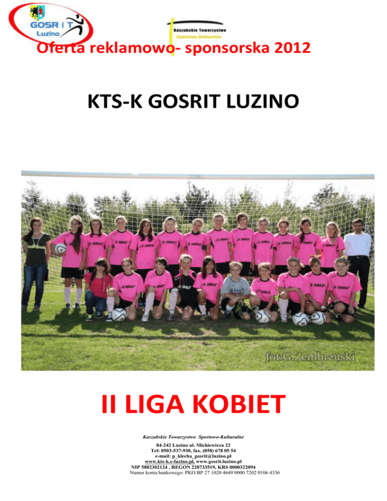 Oferta reklamowo- sponsorska 2012 KTS-K GOSRIT LUZINO II LIGA KOBIET Kaszubskie Towarzystwo Sportowo-Kulturalne 84-242 Luzino ul. Mickiewicza 22 Tel: 0503-537-930, fax. (058) 678 05 54 e-mail: [email protected] www.kts-k.e-luzino.pl, www.gosrit.luzino.pl NIP 5882302124 , REGON 220733519, KRS 0000322094 Numer konta bankowego: PKO BP 27 1020 4649 0000 7202 0106 4336 Oferta reklamowo- sponsorska 2012 Witamy na Kaszubach Mamy zaszczyt przedstawić Państwu idee Kaszubskiego Towarzystwa SportowoKulturalnego (KTS-K).Jesteśmy inicjatorami powstania wielu inicjatyw sportowych na terenie całych Kaszub. Najważniejsze z nich : KTS-K GOSRiT Luzino – sekcja piłki nożnej zrzesza 12 dziecięcych i młodzieżowych drużyn piłkarskich chłopców i dziewcząt oraz V ligową drużynę Wikęd Luzino. Drużyna Kobiet awansowała w tym sezonie do II ligi Kaszubskie Towarzystwo Sportowo-Kulturalne 84-242 Luzino ul. Mickiewicza 22 Tel: 0503-537-930, fax. (058) 678 05 54 e-mail: [email protected] www.kts-k.e-luzino.pl, www.gosrit.luzino.pl NIP 5882302124 , REGON 220733519, KRS 0000322094 Numer konta bankowego: PKO BP 27 1020 4649 0000 7202 0106 4336 Oferta reklamowo- sponsorska 2012 KTS-K Taniec – sekcja tańca towarzyskiego prowadząca zajęcia w Luzinie uczestniczy w licznych turniach na terenie całego kraju KTS-K Lew Lębork – sekcja piłki nożnej prowadzi zespół rocznik 1999 Świetlica Integracyjna „Skrzydła Anioła”, która organizuję m in. zajęcia sportowo –rekreacyjne i manualne oraz Kaszubską Paraolimpiadę W swoim biurze w Lęborku KTS-K prowadzi grupę wsparcia dla kobiet „po…”. Prowadzimy kampanie informacyjną, bezpłatne zajęcia z jezyka anglieskiego, naukę gry na gitarze oraz treningi nordic walking. W naszej bibliotece mamy ponad 250 pozycji o tematyce kobiecej Kaszubskie Towarzystwo Sportowo-Kulturalne 84-242 Luzino ul. Mickiewicza 22 Tel: 0503-537-930, fax. (058) 678 05 54 e-mail: [email protected] www.kts-k.e-luzino.pl, www.gosrit.luzino.pl NIP 5882302124 , REGON 220733519, KRS 0000322094 Numer konta bankowego: PKO BP 27 1020 4649 0000 7202 0106 4336 Oferta reklamowo- sponsorska 2012 Na terenie gminy Luzino prowadzimy zajęcia sportowo – profilaktyczne oraz zajęcia świetlicowe Nasze Stowarzyszenie jest organizatorem wielu cyklicznych turniejów sportowych. Cykl Międzynarodowych Turniejów Kaszub Cup dla najlepszych ośrodków szkolenia młodych piłkarzy z całego kraju. W tym turnieju uczestniczyło już ponad 120 drużyn z 75 klubów z terenu całego kraju. Kaszubska Amatorska Liga Piłki Siatkowej o Mistrzostwo Kaszub. W rozgrywkach uczestniczy 14 drużyn z terenu całych Północnych Kaszub Cykl Diecezjalnych Turniejów oraz Mistrzostwa Polski w Halową Piłkę Nożna dla Liturgicznej Służby. W każdym turnieju uczestniczy ponad 500 sportowców ministrantów. Kaszubskie Towarzystwo Sportowo-Kulturalne 84-242 Luzino ul. Mickiewicza 22 Tel: 0503-537-930, fax. (058) 678 05 54 e-mail: [email protected] www.kts-k.e-luzino.pl, www.gosrit.luzino.pl NIP 5882302124 , REGON 220733519, KRS 0000322094 Numer konta bankowego: PKO BP 27 1020 4649 0000 7202 0106 4336 Oferta reklamowo- sponsorska 2012 Kaszubska Paraolimpiada, wielka impreza integracyjna w której rywalizują młodzi niepełnosprawni sportowcy oraz pełnosprawni biegacze w Biegu Charytatywnym „Skrzydła Anioła” Promocja w lokalnych mediach. Wszystkie nasze działania nagłaśniane są w lokalnych mediach. Specjalnym patronatem objęli nas: Dziennik Bałtycki, TTM Chopin, sportowe kaszuby.pl, portal amato sport, Gazeta Wyborcza Trójmiasto, Panorama Powiatu Wejherowskiego i Express Powiatu. Pakiety sponsorskie Kaszubskiego Towarzystwa Sportowo -Kulturalnego Sponsor Główny Klubu Sponsor jednej sekcji Sponsor jednej imprezy Sponsor sprzętu sportowego Kaszubskie Towarzystwo Sportowo-Kulturalne 84-242 Luzino ul. Mickiewicza 22 Tel: 0503-537-930, fax. (058) 678 05 54 e-mail: [email protected] www.kts-k.e-luzino.pl, www.gosrit.luzino.pl NIP 5882302124 , REGON 220733519, KRS 0000322094 Numer konta bankowego: PKO BP 27 1020 4649 0000 7202 0106 4336 Oferta reklamowo- sponsorska 2012 Sponsor Główny Klubu Głównemu Sponsorowi Klubu przysługuje: - Tytuł Głównego Przyjaciela KTS-K - Umieszczenie loga firmy na wszystkich materiałach Stowarzyszenia ( strona internetowa, dyplomy, plakaty, materiały informacyjne itp.) - Umieszczenie baneru reklamowego na wszystkich zawodach organizowanych przez KTS-K - Promocja firmy w przekazach medialnych - Nazwa sponsora w nazwie imprez sportowych - Logo firmy w centralnym miejscu na koszulkach, dresach, torbach Sponsor jednej sekcji Dzięki nabyciu pakietu sponsora przysługuje: - Tytuł Przyjaciela KTS-K - Nazwa sponsora w nazwie drużyny - Umieszczenie loga firmy na wszystkich materiałach Stowarzyszenia (strona internetowa , dyplomy, plakaty, materiały informacyjne itp.) - Logo firmy w folderach reklamowych - Logo firmy w przekazach medialnych Sponsor jednej imprezy Dzięki nabyciu pakietu sponsora przysługuje: - Tytuł Przyjaciela KTS-K - Nazwa sponsora w nazwie imprezy, np. „Luzino CUP” - Umieszczenie baneru reklamowego w centralnym miejscu w trakcie trwania imprezy - Logo firmy w folderach reklamowych, dyplomach, plakatach, itp. - informacja w przekazach medialnych Pojedyncze nośniki reklamowe- Koszulki meczowe,- Koszulki treningowe, Dresy, - Ortaliony, - Banery reklamowe w trakcie trwania imprezy Kaszubskie Towarzystwo Sportowo-Kulturalne 84-242 Luzino ul. Mickiewicza 22 Tel: 0503-537-930, fax. (058) 678 05 54 e-mail: [email protected] www.kts-k.e-luzino.pl, www.gosrit.luzino.pl NIP 5882302124 , REGON 220733519, KRS 0000322094 Numer konta bankowego: PKO BP 27 1020 4649 0000 7202 0106 4336 Oferta reklamowo- sponsorska 2012 KONTAKT: Wszelkich informacji udzieli Państwu Klecha Piotr - [email protected], Tel: 503 537 930 Kaszubskie Towarzystwo Sportowo-Kulturalne 84-242 Luzino ul. Mickiewicza 22 Tel: 0503-537-930, fax. (058) 678 05 54 e-mail: [email prot