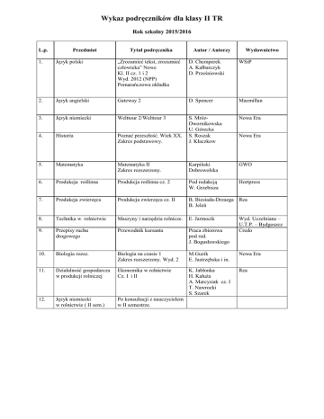 Wykaz podręczników dla klasy II TR Rok szkolny 2015/2016 L.p. Przedmiot Tytuł podręcznika Autor / Autorzy Wydawnictwo 1. Język polski „Zrozumieć tekst, zrozumieć człowieka” Nowe Kl. II cz. 1 i 2 Wyd. 2012 (NPP) Pomarańczowa okładka D. Chemperek A. Kalbarczyk D. Prześniowski WSiP 2. Język angielski Gateway 2 D. Spencer Macmillan 3. Język niemiecki Welttour 2/Welttour 3 Nowa Era 4. Historia Poznać przeszłość. Wiek XX. Zakres podstawowy. S. MrózDwornikowska U. Górecka S. Roszak J. Kłaczkow 5. Matematyka Matematyka II Zakres rozszerzony. Karpiński Dobrowolska GWO 6. Produkcja roślinna Produkcja roślinna cz. 2 Pod redakcją W. Grzebisza Hortpress 7. Produkcja zwierzęca Produkcja zwierzęca cz. II B. Biesiada-Drzazga Rea B. Jeleń 8. Technika w rolnictwie Maszyny i narzędzia rolnicze. E. Jarmocik 9. Przepisy ruchu drogowego Przewodnik kursanta Praca zbiorowa pod red. J. Bogusławskiego 10. Biologia rozsz. Biologia na czasie 1 Zakres rozszerzony. Wyd. 2 M.Guzik E. Jastrzębska i in. Nowa Era 11. Działalność gospodarcza w produkcji rolniczej Ekonomika w rolnictwie Cz. I i II K. Jabłonka H. Kałuża A. Marcysiak cz. I T. Nawrocki S. Szarek Rea 12. Język niemiecki w rolnictwie ( II sem.) Po konsultacji z nauczycielem w II semestrze. Nowa Era Wyd. Uczelniane – U.T.P. – Bydgoszcz Credo