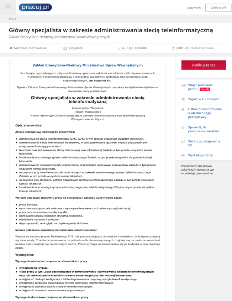 Logowanie Załóż profil Praca Główny specjalista w zakresie administrowania siecią teleinformatyczną Zakład Emerytalno-Rentowy Ministerstwa Spraw Wewnętrznych M Warszawa, mazowieckie q Specjalista p 4 - 6 tys. zł brutto o 0001-01-01 do końca 0 dni Aplikuj teraz Zakład Emerytalno-Rentowy Ministerstwa Spraw Wewnętrznych W miesiącu poprzedzającym datę upublicznienia ogłoszenia wskaźnik zatrudnienia osób niepełnosprawnych w urzędzie, w rozumieniu przepisów o rehabilitacji zawodowej i społecznej oraz zatrudnianiu osób niepełnosprawnych, jest niższy niż 6%. Włącz polecanie profilu n o w o ś ć Dyrektor Zakładu Emerytalno-Rentowego Ministerstwa Spraw Wewnętrznych poszukuje kandydatek/kandydatów na stanowisko pracy w Warszawie: Główny specjalista w zakresie administrowania siecią teleinformatyczną l Zapisz w Ulubionych Miejsce pracy: Warszawa 5 Ustaw powiadomienia o ofertach tego pracodawcy p Sprawdź, ile powinieneś zarabiać m Stwórz profesjonalne CV 7 Wydrukuj ofertę Region: mazowieckie Numer referencyjny: Główny specjalista w zakresie administrowania siecią teleinformatyczną Wynagrodzenie: 4 - 6 tys. zł Opis stanowiska: Zakres szczegółowy obowiązków pracownika: administrowanie siecią teleinformatyczną (LAN, WAN) w tym obsługa aktywnych urządzeń sieciowych, administrowanie siecią internetową i intranetową, w celu zapewnienia łączności między poszczególnymi urządzeniami pracującymi w sieci, tworzenie oraz aktualizowanie strony internetowej oraz intranetowej Zakładu w tym przede wszystkim komisji lekarskich, instalowanie oraz obsługa sprzętu teleinformatycznego Zakładu w tym przede wszystkim dla potrzeb komisji lekarskich, administrowanie serwerami poczty elektronicznej oraz kontami pocztowymi pracowników Zakładu w tym przede wszystkim komisji lekarskich, współpraca przy określaniu potrzeb materiałowych w zakresie serwisowanego sprzętu teleinformatycznego Zakładu w tym przede wszystkim komisji lekarskich, współpraca przy określaniu potrzeb dotyczących sprzętu teleinformatycznego Zakładu w tym przede wszystkim komisji lekarskich, instalowanie oraz obsługa sprzętu informatycznego oraz teleinformatycznego Zakładu w tym przede wszystkim komisji lekarskich, Warunki dotyczące charakteru pracy na stanowisku i sposobu wykonywania zadań: praca biurowa, wymuszona pozycja ciała związana z wykonywaniem większości zadań w pozycji siedzącej, praca przy komputerze powyżej 4 godzin, użytkowane sprzęty: komputer, drukarka, niszczarka, oświetlenie naturalne i sztuczne, dyspozycyjność, ze względu na częste wyjazdy służbowe. Miejsce i otoczenie organizacyjno-techniczne stanowiska pracy: Wejście do budynku przy ul. Pawińskiego 17/21 nie posiada podjazdu dla wózków inwalidzkich. W budynku znajdują się dwie windy. Toaleta przystosowana do potrzeb osób niepełnosprawnych znajduje się na parterze, natomiast miejsce pracy znajduje się na pierwszym piętrze. Praca wymaga przemieszczania się po budynku w celu realizacji zadań. Wymagania: Wymagania niezbędne związane ze stanowiskiem pracy: wykształcenie wyższe, 4 lata pracy w tym: 2 lata doświadczenia w administrowaniu i serwisowaniu sieciami teleinformatycznymi oraz rok doświadczenia w administrowaniu serwerem poczty internetowej/intranetowej, umiejętność obsługi i konfiguracji a także diagnozowania i naprawy sprzętu teleinformatycznego, umiejętność szybkiego przyswajania nowych technologii teleinformatycznych, umiejętność administrowania sieciami teleinformatycznymi, umiejętność administrowania serwerami pocztowymi. Wymagania dodatkowe związane ze stanowiskiem pracy: Pracodawca ma prawo zakończyć rekrutację we wcześniejszym terminie. wykształcenie: studia podyplomowe o profilu informatycznym, 1 rok doświadczenia w administrowaniu i serwisowaniu serwerów i różnych systemów operacyjnych, komunikatywna znajomość języka angielskiego, poświadczenie bezpieczeństwa do klauzuli „tajne" lub oświadczenie o wyrażeniu zgody na przeprowadzenie postępowania sprawdzającego, świadectwo kwalifikacyjne uprawniające do eksploatowania urządzeń elektrycznych do 1 Kv, prawo jazdy kat. B, umiejętność obsługi diagnostycznych programów komputerowych, znajomość narzędziowego oprogramowania do zarządzania siecią teleinformatyczną. Oferujemy: Umowa o pracę na czas określony. Proponowane wynagrodzenie brutto do 5178 zł. Wymagane dokumenty i oświadczenia: życiorys (CV) i list motywacyjny oświadczenie o wyrażeniu zgody na przetwarzanie danych osobowych do celów rekrutacji oświadczenie o korzystaniu z pełni praw publicznych oświadczenie o nieskazaniu prawomocnym wyrokiem za umyślne przestępstwo lub umyślne przestępstwo skarbowe kopie dokumentów potwierdzających wykształcenie kopia dokumentu potwierdzającego posiadanie polskiego obywatelstwa lub oświadczenie o posiadaniu obywatelstwa polskiego kopie świadectw pracy oraz innych dokumentów potwierdzających spełnianie wymagań niezbędnych i dodatkowych (np. świadectwa pracy, zaświadczenia o zatrudnieniu lub wykonywaniu prac zleconych) kopia dokumentu potwierdzającego niepełnosprawność - w przypadku kandydatek/kandydatów, zamierzających skorzystać z pierwszeństwa w zatrudnieniu w przypadku, gdy znajdą się w gronie najlepszych kandydatek/kandydatów Miejsce składania dokumentów: Zakład Emerytalno-Rentowy Ministerstwa Spraw Wewnętrznych ul. Pawińskiego 17/21 02-106 Warszawa Inne informacje: Preferowana forma aplikowania: aplikacja papierowa, wysłana listownie. W przypadku aplikowania przez portal, niezbędne będzie dosłanie lub dostarczenie pozostałych niezbędnych kopii lub skanów dokumentów (zgodnie z informacjami zawartymi w dziale „Wymagane dokumenty i oświadczenia"). Na kopercie oraz w liście motywacyjnym należy zamieścić NAZWĘ STANOWISKA. Wymagane oświadczenia prosimy składać zgodnie ze wzorem zamieszczonym na stronie BIP ZER w