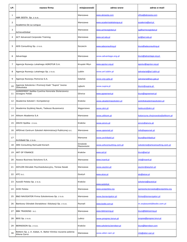 LP. nazwa firmy 1 miejscowość adres www adres e-mail Warszawa www.abrsesta.com [email protected] Warszawa www.academiadelalengua.pl [email protected] Warszawa www.achieveglobal.pl [email protected] ABR SESTA Sp. z o.o. 2 Academia De La Lengua 3 AchieveGlobal 4 ACT Advanced Corporate Training Warszawa www.act.edu.pl [email protected] 5 ADS Consulting Sp. z o.o. Szczecin www.adsconsulting.pl [email protected] 6 Advantage Warszawa www.advantage.org.pl [email protected] 7 Agencja Rozwoju Lokalnego AGROTUR S.A. Krupski Młyn www.agrotur.org.pl [email protected] 8 Agencja Rozwoju Lokalnego Sp. z o.o. Lublin www.arl.lublin.pl [email protected] 9 Agencja Rozwoju Pomorza S.A. Gdańsk www.arp.gda.pl [email protected] Agencja Szkolenia i Promocji Kadr "Supra" Iwona śbikowska Lębork www.supra.pl [email protected] 10 11 AGREEMENT Spółka Cywilna Honorata Stolarzewicz Grzegorz Pollak Gliwice www.agreement.pl [email protected] 12 Akademia Szkoleń i Kompetencji Kraków www.akademiaszkolen.pl [email protected] 13 Akademia Szybkiej Nauki, Tadeusz Buzarewicz Węgorzewo www.akn.pl [email protected] 14 Altkom Akademia S.A Warszawa www.altkom.pl [email protected] 15 ANVIX Spółka z o.o. Kraków www.anvix.pl [email protected] 16 APEXnet Centrum Szkoleń Administracji Publicznej s.c. Warszawa www.apexnet.pl [email protected] Warszwa www.archibald.pl [email protected] 17 Archibald Sp. z o.o. 18 ARK Consulting Romuald Korach Grodzisk Mazowiecki www.arkconsulting.com.pl [email protected] 19 ART OF FINANCE Kraków www.aof.pl [email protected] 20 Asseco Business Solutions S.A. Warszawa www.incenti.pl [email protected] 21 ASYLON Ośrodek Psychoedukacyjny, Teresa Sasak Warszawa www.asylon.pl [email protected] 22 ATC s.c. Gostyń www.atcsc.pl [email protected] 23 AutoID Polska Sp. z o.o. Kraków [email protected] www.autoid.pl 24 AVSI Polska Warszawa www.avsipolska.org [email protected] 25 B&O NAVIGATOR Firma Szkoleniowa Sp. z o.o. Warszawa www.bonavigator.pl [email protected] 26 Bankowy Ośrodek Doradztwa i Edukacji Sp. z o.o. Poznań www.bodie.com.pl [email protected] 27 BBK TRAINING s.c. Warszawa www.bbktraining.pl [email protected] 28 BDG Sp. z o.o. Lubicz www.progres.torun.pl [email protected] 29 BERNDSON Sp. z o.o. Kraków www.szkolenia.berndson.pl [email protected] 30 Betters Sp. j. A .Kabat, K. Balter Klinika rzucania palenia Allena Carra Warszawa www.allen-carr.pl [email protected] www.vt.com.pl [email protected] 31 Biznes Edukator Sp. z o.o. Warszawa 32 Bright Team Sp. z o.o. Długa Szlachecka www.brightteam.pl 33 BRITISH CENTRE BoŜena Ziemniewicz, Marian Mikuś sp.j. Łódź www.british-centre.pl [email protected] 34 Business Center 1.Anna Kępka (BC1) Katowice www.bc1.pl [email protected] 35 C.L. Consulting i Logistyka spółka z ograniczoną odpowiedzialnością Wrocław [email protected] www.cl-consulting.com.pl 36 CADExpert Sp. z o.o. Łódź 37 Catro International Management Consulting Sp z o.o. Łódź 38 www.cadexpert.com.pl [email protected] [email protected] www.catro.pl Lublin www.ce2.pl [email protected] CE2 Centrum Edukacji M. Dziewa, E. Tarnas-Szwed Sp.j. 39 CEGOS Polska sp. z o.o. Warszawa www.cegos.pl [email protected] 40 Centrum CBT Sp. z o.o. Warszawa www.cbt.pl [email protected] 41 Centrum Doradztwa Gospodarczego Sp. z o.o. Rzeszów www.cdgpolska.pl [email protected] 42 Centrum Edukacji Ekspert Warszawa www.cee.pl [email protected] 43 Centrum Edukacji Grupa ORLEN Płock www.centrumedukacji.pl [email protected] 44 Centrum Edukacji Logistycznej Sp. z o.o. Poznań www.cel.jms.pl [email protected] 45 Centrum Kreowania Liderów S.A. Katowice www.ckl.com.pl [email protected] 46 Centrum Kształcenia i Szkolenia Spółka z ograniczoną odpowiedzialnością Kraków www.ckis.krakow.pl [email protected] 47 Centrum Organizacji Szkoleń MenedŜerskich Warszawa www.szkolenie.waw.pl [email protected] 48 Poznań Centrum Psychoterapii i Szkoleń Psychologicznych [email protected] www.barbaragojzewska.com 49 Centrum Rozwiązań MenedŜerskich S.A. WARSZAWA www.crm.com.pl [email protected] 50 Centrum SUPER-ego K. Fura, K.Ździebło Sp.j. Wrocław www.szkolenia.superego.com.pl [email protected] 51 Centrum Szkolenia Zawodowego Sp. z o.o. Wieliczka [email protected] www.csz.pl 52 Centrum Szkoleniowo-Konsultingowe KONCEPT Krzysztof Wiśniak Kępa k/Opola www.e-koncept.com.pl [email protected] 53 Centrum Wspierania Projektów Europejskich S.A. Wrocław www.cwpe.pl [email protected],[email protected] 54 Certes Sp. z o.o. Warszawa www.certes.pl [email protected] 55 CERTUS Centrum Szkolenia i Doradztwa Sp. z o.o. Warszawa www.szkoleniacertus.com.pl [email protected]. pl 56 Coaching Center Warszawa www.4coaching.pl [email protected] 57 COMARTIN - Szkolenia, Konsulting, Badania Rynku Łomianki www.comartin.pl [email protected] 58 Communication One Consulting Sp. Z o.o. Warszawa www.commone.pl [email protected] 59 COMP SAFE SUPPORT SA Warszawa www.css.pl/edusoft [email protected] www.competirpolska.com.pl [email protected] Competir Polska Sp. z o.o. Poznań www.competitiveskills.pl [email protected] 60 61 Warszawa Competitive Skills sp. z o.o. 62 63 [email protected] Katowice Conart Sp. z o.o CONEX Szkolenia i Doradztwo www.conart.pl [email protected] Olsztyn http://www.conexgroup.pl 64 CS Szkolenia i Doradztwo Sp. z o.o. Warszawa www.csid.pl [email protected], [email protected] 65 Denis' School Sp. z o.o. Warszawa www.denisschool.com.pl [email protected] 66 Development Partners Weinmann Maciej Wrocław www.development-partners.pl [email protected] 67 DGT Sp. z o.o. Straszyn [email protected] www.dgt.com.pl 68 DMD CENTRUM SZKOLENIOWE A. Kempińska i M. Klimontowicz Sp. J Świętochłowice 69 Dobry Doradca Sp. z o.o. Wrocław www.dobrydoradca.pl [email protected], [email protected] 70 Dom Szkoleń i Doradztwa Aleksandra Mykowska Kraków www.domszkolen.com [email protected] 71 DOOR Poland S.A. Warszawa www.door.com.pl [email protected] 72 Doradztwo Gospodarcze "Konsultant" Bielsko-Biała www.konsultant.bielsko.pl 