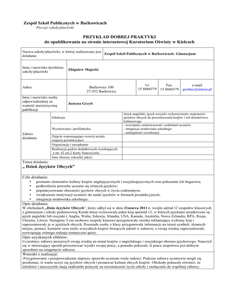 Zespół Szkół Publicznych w Baćkowicach Pieczęć szkoły/placówki PRZYKŁAD DOBREJ PRAKTYKI do opublikowania na stronie internetowej Kuratorium Oświaty w Kielcach Nazwa szkoły/placówki, w której realizowane jest Zespól Szkół Publicznych w Baćkowicach- Gimnazjum działanie Imię i nazwisko dyrektora szkoły/placówki Zbigniew Majecki Adres Baćkowice 100 27-552 Baćkowice Imię i nazwisko osoby odpowiedzialnej za wartość merytoryczną publikacji e-mail [email protected] Justyna Grzyb Edukacja Wychowanie i profilaktyka Zakres działania: Tel. Fax. 15 8686579 15 8686579 Język angielski, język rosyjski-wykorzystanie znajomości języków obcych do prezentowania krajów i ich dziedzictwa kulturowego - rozwijanie zainteresowań i uzdolnień uczniów - integracja środowiska szkolnego - umiejętność rywalizacji Zajęcia wspomagające rozwój ucznia (zajęcia pozalekcyjne) Organizacja i zarządzanie Realizacja godzin dodatkowych wynikających z art. 42 ust.2 Karty Nauczyciela Inne obszary (określić jakie) Temat działania: „ Dzień Języków Obcych” Cele działania: • • • • • poznanie elementów kultury krajów anglojęzycznych i rosyjskojęzycznych oraz pokazanie ich bogactwa; podkreślenie potrzeby uczenia się różnych języków; popularyzowanie obecności języków obcych w życiu codziennym; zwiększenie motywacji uczniów do nauki języków w formach pozalekcyjnych; integracja środowiska szkolnego; Opis działania: W obchodach „Dnia Języków Obcych”, który odbył się w dniu 21marca 2011 r. wzięło udział 12 zespołów klasowych z gimnazjum i szkoły podstawowej Każda klasa wylosowała jeden kraj spośród 12, w których językami urzędowymi są język angielski lub rosyjski ( Anglia, Walia, Szkocja, Irlandia, USA, Kanada, Australia, Nowa Zelandia, RPA, Rosja, Ukraina, Litwa). Następnie 5-cio osobowe zespoły klasowe przygotowały stoiska reklamujące wybrany kraj i zaprezentowały je w językach obcych. Pozostałe osoby z klasy przygotowały informacje na temat symboli, słynnych miejsc, postaci, hymnów oraz stolic wszystkich krajów biorących udział w zabawie, a swoją wiedzę zaprezentowali, rozwiązując różnego rodzaju tematyczne quizy. Opis uzyskanych efektów: Uczestnicy zabawy poszerzyli swoją wiedzę na temat krajów z angielskiego i rosyjskiego obszaru językowego. Nauczyli się w interesujący sposób prezentować wyniki swojej pracy, a ponadto pokazali, iż praca zespołowa jest dobrym sposobem na osiągnięcie sukcesu. Wnioski z realizacji: Przygotowanie i przeprowadzenie imprezy sprawiło uczniom wiele radości. Podczas zabawy uczniowie mogli się przekonać, iż warto uczyć się języków obcych i poznawać kulturę obcych krajów. Obchody pokazały również, że młodzież i nauczyciele mają znakomite pomysły na urozmaicenie życia szkoły i zachęcenie do wspólnej zabawy. Instytucje wspomagające realizację podjętych działań: • • Wydawnictwo Nowa Era Dyrekcja Zespołu Szkół Uzasadnienie zgłoszenia: „Dzień Języków Obcych” na stałe wszedł do kalendarza naszej szkoły i po raz kolejny okazał się sukcesem. Chcielibyśmy podzielić się z innymi naszymi doświadczeniami i zachęcić do podejmowania podobnych działań. Trudności w realizacji: brak Wykaz załączników: prezentacja PowerPoint Wyrażam zgodę na opublikowanie na stronie internetowej Kuratorium Oświaty w Kielcach przedstawionego przykładu dobrej praktyki. Baćkowice 04.04.2011r. Miejscowość, data mgr Zbigniew Majecki Podpis dyrektora szkoły/placówki