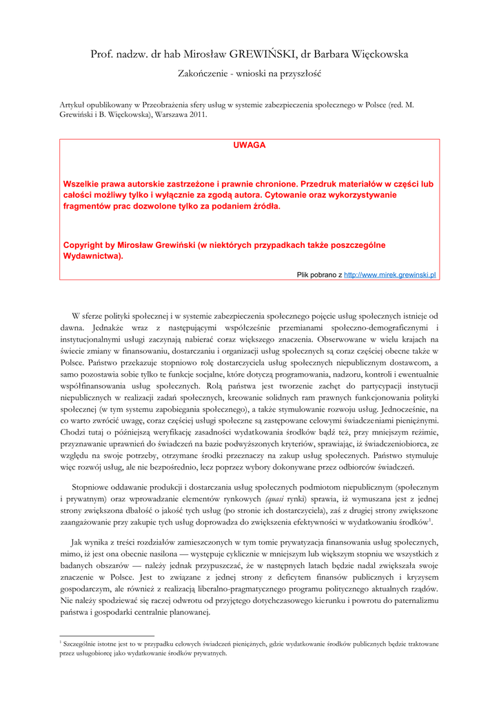 Prof. nadzw. dr hab Mirosław GREWIŃSKI, dr Barbara Więckowska Zakończenie - wnioski na przyszłość Artykuł opublikowany w Przeobrażenia sfery usług w systemie zabezpieczenia społecznego w Polsce (red. M. Grewiński i B. Więckowska), Warszawa 2011. UWAGA Wszelkie prawa autorskie zastrzeżone i prawnie chronione. Przedruk materiałów w części lub całości możliwy tylko i wyłącznie za zgodą autora. Cytowanie oraz wykorzystywanie fragmentów prac dozwolone tylko za podaniem źródła. Copyright by Mirosław Grewiński (w niektórych przypadkach także poszczególne Wydawnictwa). Plik pobrano z http://www.mirek.grewinski.pl W sferze polityki społecznej i w systemie zabezpieczenia społecznego pojęcie usług społecznych istnieje od dawna. Jednakże wraz z następującymi współcześnie przemianami społeczno-demograficznymi i instytucjonalnymi usługi zaczynają nabierać coraz większego znaczenia. Obserwowane w wielu krajach na świecie zmiany w finansowaniu, dostarczaniu i organizacji usług społecznych są coraz częściej obecne także w Polsce. Państwo przekazuje stopniowo rolę dostarczyciela usług społecznych niepublicznym dostawcom, a samo pozostawia sobie tylko te funkcje socjalne, które dotyczą programowania, nadzoru, kontroli i ewentualnie współfinansowania usług społecznych. Rolą państwa jest tworzenie zachęt do partycypacji instytucji niepublicznych w realizacji zadań społecznych, kreowanie solidnych ram prawnych funkcjonowania polityki społecznej (w tym systemu zapobiegania społecznego), a także stymulowanie rozwoju usług. Jednocześnie, na co warto zwrócić uwagę, coraz częściej usługi społeczne są zastępowane celowymi świadczeniami pieniężnymi. Chodzi tutaj o późniejszą weryfikację zasadności wydatkowania środków bądź też, przy mniejszym reżimie, przyznawanie uprawnień do świadczeń na bazie podwyższonych kryteriów, sprawiając, iż świadczeniobiorca, ze względu na swoje potrzeby, otrzymane środki przeznaczy na zakup usług społecznych. Państwo stymuluje więc rozwój usług, ale nie bezpośrednio, lecz poprzez wybory dokonywane przez odbiorców świadczeń. Stopniowe oddawanie produkcji i dostarczania usług społecznych podmiotom niepublicznym (społecznym i prywatnym) oraz wprowadzanie elementów rynkowych (quasi rynki) sprawia, iż wymuszana jest z jednej strony zwiększona dbałość o jakość tych usług (po stronie ich dostarczyciela), zaś z drugiej strony zwiększone zaangażowanie przy zakupie tych usług doprowadza do zwiększenia efektywności w wydatkowaniu środków 1. Jak wynika z treści rozdziałów zamieszczonych w tym tomie prywatyzacja finansowania usług społecznych, mimo, iż jest ona obecnie nasilona — występuje cyklicznie w mniejszym lub większym stopniu we wszystkich z badanych obszarów — należy jednak przypuszczać, że w następnych latach będzie nadal zwiększała swoje znaczenie w Polsce. Jest to związane z jednej strony z deficytem finansów publicznych i kryzysem gospodarczym, ale również z realizacją liberalno-pragmatycznego programu politycznego aktualnych rządów. Nie należy spodziewać się raczej odwrotu od przyjętego dotychczasowego kierunku i powrotu do paternalizmu państwa i gospodarki centralnie planowanej. 1 Szczególnie istotne jest to w przypadku celowych świadczeń pieniężnych, gdzie wydatkowanie środków publicznych będzie traktowane przez usługobiorcę jako wydatkowanie środków prywatnych. Finansowanie większości usług społecznych na bazie bieżących świadczeń 2 sprawia, iż wielkość przeznaczonych środków finansowych jest bardzo czuła na zmiany na rynku pracy. Nakładając na to, obserwowane obecnie, starzenie się ludności Polski oraz niską dynamikę wzrostu przeciętnego wynagrodzenia można stwierdzić, iż bez wprowadzenia mechanizmów finansowania kapitałowego (co można osiągnąć dzięki dodatkowym oszczędnościom bądź ubezpieczeniom długoterminowym) istnieje realne zagrożenie dla pozyskania odpowiednich środków finansowych niezbędnych do utrzymania wolumenu usług społecznych. Dlatego też aktualnie przykłada się duże znaczenie do funkcjonowania instytucji trzeciego sektora oraz budowania zachęt fiskalnych do przekazywania środków na cele społeczne. Podsumowując rozważania, które zostały podjęte na łamach tej książki można stwierdzić, iż usługi społeczne ulegają stałemu przeobrażeniu, a ich potencjał wynika z przyjętego modelu prowadzonej polityki społecznej czy systemu zabezpieczenia społecznego. Wszystkie procesy przemian jakie dotyczyły takiego a nie innego rozwoju usług społecznych obserwowane w krajach Europy Zachodniej mają aktualnie miejsce również w Polsce. Należy tylko zaznaczyć, że konieczność asekuracji materialnej gospodarstw domowych w okresie dwóch pierwszych dekad od transformacji ustrojowej przy ograniczonych możliwościach finansowych dodatkowo spowodował, że stan usług społecznych w Polsce znacznie odbiega od standardów jakie funkcjonują w tradycyjnych welfare states. Tym niemniej większość procesów jest podobna, różni ją tylko skala i różnorodność usług oferowanych w Polsce i na zachodzie Europy. Należy podkreślić, że prywatyzacja usług, zarówno w zakresie finansowania jak i własności, występuje we wszystkich z analizowanych obszarach np: prywatne ubezpieczenia zdrowotne oraz prywatne zakłady opieki zdrowotnej w systemie ochrony zdrowia; współfinansowanie świadczeń oraz prywatne zakłady opiekuńczolecznicze czy prywatne domy pomocy społecznej w opiece długoterminowej; komercyjne usługi opiekuńcze i pielęgnacyjne w pomocy społecznej; rozwiązania trzeciofilarowe oraz otwarte fundusze emerytalne w ubezpieczeniach społecznych. Państwo i instytucje publiczne dopuszczają prywatnych usługodawców oraz organizacje non-profit do świadczenia usług społecznych, gdyż sami nie są w stanie rozwiązać skutec