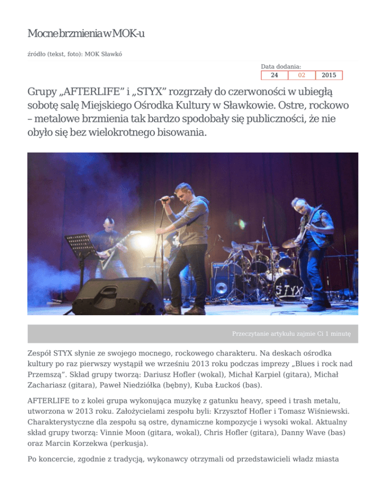 MocnebrzmieniawMOK-u źródło (tekst, foto): MOK Sławkó Data dodania: 24 02 2015 Grupy „AFTERLIFE” i „STYX” rozgrzały do czerwoności w ubiegłą sobotę salę Miejskiego Ośrodka Kultury w Sławkowie. Ostre, rockowo – metalowe brzmienia tak bardzo spodobały się publiczności, że nie obyło się bez wielokrotnego bisowania. Przeczytanie artykułu zajmie Ci 1 minutę Zespół STYX słynie ze swojego mocnego, rockowego charakteru. Na deskach ośrodka kultury po raz pierwszy wystąpił we wrześniu 2013 roku podczas imprezy „Blues i rock nad Przemszą”. Skład grupy tworzą: Dariusz Hofler (wokal), Michał Karpiel (gitara), Michał Zachariasz (gitara), Paweł Niedziółka (bębny), Kuba Łuckoś (bas). AFTERLIFE to z kolei grupa wykonująca muzykę z gatunku heavy, speed i trash metalu, utworzona w 2013 roku. Założycielami zespołu byli: Krzysztof Hofler i Tomasz Wiśniewski. Charakterystyczne dla zespołu są ostre, dynamiczne kompozycje i wysoki wokal. Aktualny skład grupy tworzą: Vinnie Moon (gitara, wokal), Chris Hofler (gitara), Danny Wave (bas) oraz Marcin Korzekwa (perkusja). Po koncercie, zgodnie z tradycją, wykonawcy otrzymali od przedstawicieli władz miasta pamiątkowe dyplomy i upominki. D R U KUJ D RUKUJ DO PDF http://www.slawkow.pl/print.php?pdf=true&unique=mocne-brzmienia-w-mok-u