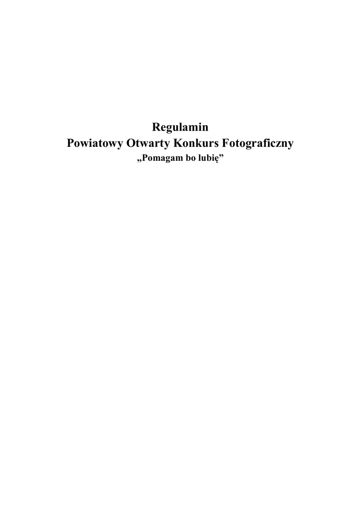 Regulamin Powiatowy Otwarty Konkurs Fotograficzny „Pomagam bo lubię” Regulamin Powiatowego Otwartego Konkursu Fotograficznego „Pomagam bo lubię” ORGANIZATOR 1. Organizatorem konkursu jest Klub Wolontariatu „Warto” mieszczący się w Kartuzach przy ul. Gdańskiej 10 CELE KONKURSU 1. Przybliżenie idei pomagania innym (ludziom, zwierzętom) 2. Kształtowanie wzorcowych postaw zachowania 3. Ukazanie wolontariatu, jako sposobu na piękne życie TEMAT KONKURSU 1. Tematyka pracy zgodna z założeniami konkursu 2. Interpretacja tematu dowolna i dostosowana wieku wykonawcy 3. Tematyka współdziałania i interakcji z drugim człowiekiem ZASADY UCZESTNICTWA 1. Konkurs skierowany jest do mieszkańców Powiatu Kartuskiego. 2. Autorem fotografii może być jedna osoba bez ograniczeń wiekowych 3. Na konkurs każdy uczestnik może przesłać max. 3 fotografie (dotychczas niepublikowane) 4. Prace konkursowe należy składać do 14 lutego 2017r. 5. Prace można dostarczyć poprzez: e-mail: [email protected] 6. Przy ocenie prac będą brane pod uwagę: zgodność fotografii z tematem konkursu; wartość merytoryczna, jasność przekazu; jakość fotografii oraz estetyka wykonania; wartość artystyczna; pomysłowość oraz oryginalność wykonania fotografii. 7. Fotografie należy przekazywać w formacie JPG w formacie min. 1024 x768 px. Fotografia nie może być większa niż 10 MB. Format zdjęć wydrukowanych nie może być mniejszy niż A4 (20 x 30 cm). 8. Do konkursu można zgłaszać zdjęcia kolorowe lub czarno – białe. 9. Zdjęcia mogą zostać poddane obróbce graficznej. 10. Do pracy należy załączyć dane osobowe: imię, nazwisko, wiek, adres do korespondenci, telefon kontaktowy. 11. Wszystkie prace konkursowe pozostają w archiwum Organizatora konkursu. 12. W przypadku zgłoszeń pocztowych liczyć się będzie data stempla pocztowego. 13. Bieżące informacje o konkursie i regulamin konkursu dostępne są na stronie internetowej organizatorów konkursu www.wolontariat.kartuzy.pl 14. Prace spełniające kryteria niniejszego Regulaminu zostaną wybrane i ocenione przez trzyosobowe jury konkursu powołane przez Organizatora. 15. Przewiduje się wyłonienie I, II i III miejsca. Przewidziane są nagrody rzeczowe oraz dyplomy. 16. Ogłoszenie wyników odbędzie się 15.02.2017r. na stronie internetowej www.wolontariat.kartuzy.pl 17. Laureaci o wynikach konkursu zostaną powiadomieni przez Organizatora telefonicznie. PRAWA AUTORSKIE 1. Każdy uczestnik musi posiadać pełne prawa autorskie do wykonanych zdjęć. 2. Praca konkursowa nie może naruszać praw autorskich oraz prawa do prywatności osób trzecich. Prezentowane w niej treści nie mogą przedstawiać zachowań zabronionych przez prawo, niecenzuralnych lub godzących w zasady dobrego wychowania i kultury osobistej. 3. Organizator zastrzega sobie prawo do odtwarzania foto i kopiowania do pokazów konkursowych i ich publicznej emisji w celach promocji. 4. Uczestnik konkursu wyraża zgodę na wykorzystanie swojego wizerunku, wykonanych w związku z realizacją konkursu w materiałach promocyjno-informacyjnych Organizatora. 5. Uczestnicy zgadzają się na posługiwanie się przez Organizatora jego imieniem i nazwiskiem w celach informacyjnych oraz zrzekają się jakiegokolwiek wynagrodzenia za korzystanie ze zdjęć, w tym w szczególności wynagrodzenia za rozpowszechnianie zdjęć na stronie internetowej oraz inne przypadki publicznego udostępniania zdjęć. UWAGI KOŃCOWE 1. Organizator konkursu nie bierze odpowiedzialności za uszkodzenie lub zaginięcie prac w trakcie przesyłki. 2. Organizator zastrzega sobie prawo do przerwania lub unieważnienia konkursu bez podania przyczyn. 3. Nadesłane Prace nie podlegają zwrotowi. 4. Zgłoszenie prac na konkurs uważane będzie za akceptację warunków regulaminu, wyrażenie zgody na publikowanie danych osobowych zgodnie z ustawą o ochronie danych osobowych. 5. W sytuacjach nieobjętych regulaminem rozstrzygają organizatorzy. 6. Kontakt z koordynatorem konkursu w imieniu organizatora: Magdalena Borkowska tel. 539 001 600, [email protected] W imieniu organizatora: Magdalena Borkowska