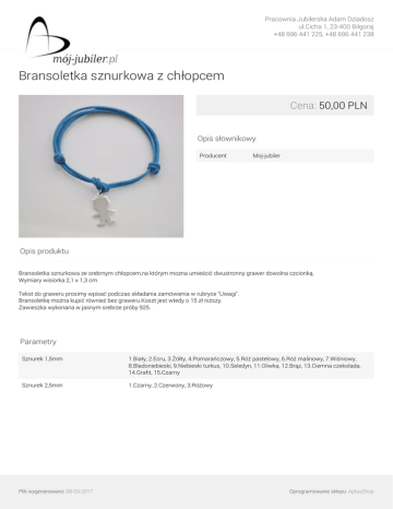 Pracownia Jubilerska Adam Dziadosz ul.Cicha 1, 23-400 Biłgoraj +48 696 441 225, +48 696 441 238 Bransoletka sznurkowa z chłopcem Cena: 50,00 PLN Opis słownikowy Producent Moj-jubiler Opis produktu Bransoletka sznurkowa ze srebrnym chłopcem,na którym mozna umieścić dwustronny grawer dowolna czcionką. Wymiary wisiorka 2,1 x 1,3 cm. Tekst do graweru prosimy wpisać podczas składania zamówienia w rubryce "Uwagi". Bransoletkę można kupić również bez graweru.Koszt jest wtedy o 15 zł niższy. Zawieszka wykonana w jasnym srebrze próby 925. Parametry Sznurek 1,5mm 1.Biały, 2.Ecru, 3.Żółty, 4.Pomarańczowy, 5.Róż pastelowy, 6.Róż malinowy, 7.Wiśniowy, 8.Bladoniebieski, 9.Niebieski turkus, 10.Seledyn, 11.Oliwka, 12.Brąz, 13.Ciemna czekolada, 14.Grafit, 15.Czarny Sznurek 2,5mm 1.Czarny, 2.Czerwony, 3.Różowy Plik wygenerowano: 08-03-2017 Powered by TCPDF (www.tcpdf.org) Oprogramowanie sklepu: AptusShop