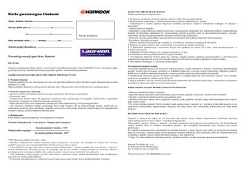 CZEGO NIE OBEJMUJE GWARANCJA Niniejsza gwarancja nie obejmuje opon: Karta gwarancyjna Hankook Marka / Bieżnik / Rozmiar: ………………………………………………………… Numery (DOT) opon: 1.……………………………, 2…………………….…………. 3……………………….........., 4…………………………….. Pieczęć sprzedawcy Data sprzedaży: dzień …………. miesiąc………………. rok .…………….. Czytelny podpis Sprzedawcy ………..…………………………………………. Warunki gwarancji opon firmy Hankook KRYTERIA Niniejsza gwarancja przysługuje nabywcy nowych opon wyprodukowanych przez firmę HANKOOK Tire Co., Ltd. Opony objęte gwarancją muszą być zamontowane na danym pojeździe zgodnie z zaleceniami firmy Hankook. ZAKRES GWARANCJI ORAZ DŁUGOŚĆ OKRESU OBOWIĄZYWANIA 1. Ważność gwarancji Niniejsza gwarancja ma moc obowiązującą do czasu, gdy pozostała głębokość rowków bieżnika osiągnie minimalną dopuszczalną głębokość tj. 1,6mm. Odpowiedzialność Hankook z tytułu gwarancji obejmuje tylko wady powstałe z przyczyn tkwiących w sprzedanej oponie. 2. Warunki rozpatrzenia reklamacji. - Zgłoszenie złożone na formularzu dostarczonym przez producenta lub autoryzowanego dealera. - Dostarczenie opon. - Przedstawienie dowodu kupna lub poprawnie wypełnionej karty gwarancyjnej. W przypadku użytkowników oryginalnego wyposażenia, wymagana jest wyłącznie książeczka gwarancyjna. - Każde zgłoszenie może zostać rozpatrzone wyłącznie przez firmę Hankook lub jej autoryzowanego dealera. - Aby umożliwić dokonanie badania technicznego przez firmę Hankook lub jej autoryzowanego dealera, użytkownik jest zobowiązany dostarczyć opony do jednego z punktów serwisowych, a jeśli usterka opony jest widoczna dopiero po napompowaniu to razem z obręczą, na której eksploatowana była opona. 3. Rekompensata Firma Hankook udzieli rekompensaty na następujących warunkach: Wysokość odszkodowania = Cena dealera × Współczynnik korygujący* Pozostała głębokość bieżnika - TWI* Współczynnik korygujący* = ----------------------------------------------------Oryginalna głębokość bieżnika - TWI* *TWI: Minimalna głębokość bieżnika, 1,6mm. * Wysokość odszkodowania zostanie określona poprzez pomnożenie rzeczywistej ceny sprzedaży do dealera (nie wliczając podatków) przez procent oryginalnej głębokości bieżnika, jaka pozostała na oponie. * Firma Hankook zastrzega sobie prawo wyboru sposobu odszkodowania – wymiana produktu lub zwrot kosztów w oparciu o metodę odszkodowania określoną powyżej. W przypadku, gdy nie jest możliwa wymiana produktu na identyczny, klientowi przysługuje prawo otrzymania produktu o tym samym rozmiarze z innym wzorem bieżnika lub zwrotu kosztów. * Jeśli reklamacja została przyjęta oraz/lub, miało miejsce rozliczenie szkody metodą odszkodowania, dany produkt/opona przechodzi na własność firmy Hankook. * W sprawach nieuregulowanych w niniejszej gwarancji mają zastosowanie przepisy prawa polskiego(kodeksu cywilnego). 1. Po naprawie, niezależnie od metody naprawy, zakresu i osoby, która ją przeprowadziła. 2. Których bieżnik został zużyty w sposób nierównomierny lub opon uszkodzonych w wyniku: - Uszkodzonych w wyniku zagrożeń drogowych (przebicia, przecięcia, rozdarcia, uszkodzenia wynikające od uderzeń o przeszkody). - Działania ognia lub wypadku. - Eksploatacji z nieprawidłowym ciśnieniem powietrza, z przeciążeniem, eksploatacji przy nadmiernej prędkości, nieprawidłowego montażu lub demontażu, eksploatacji bez wystarczającego ciśnienia powietrza, jazdy po nieutwardzonych drogach, wyścigów, wandalizmu, szkody wyrządzonej umyślnie lub innego niewłaściwego użytkowania. - Zniszczeń z powodu nieprawidłowej geometrii kół, niewyważonych kół, wadliwych hamulców lub amortyzatora. - Korzystania z łańcuchów na opony. - Działania substancji chemicznych (np. wypełniaczy, uszczelniaczy, substancji wyważających lub innych). 3. Eksploatowanych po przebiciu lub z za niskim lub z za wysokim niż zalecane ciśnieniem. 4. Z pęknięciami starzeniowymi i ozonowymi, których data produkcji jest starsza niż 4 lata i opon przechowywanych w nieodpowiedni sposób. 5. O głębokości bieżnika mniejszej niż wymagane minimum tj. 1,6 mm. 6. Z uszkodzonym lub nieczytelnym numerem seryjnym lub DOT. 7. Powodujących zakłócenia podczas jazdy (np. wibracje, ściąganie pojazdu, nadmierna generacja hałasu) a spowodowanych uszkodzonymi obręczami lub ze zużyciem bieżnika większym niż 0,8mm od oryginalnej głębokości rowków bieżnika. 8. Bez oznaczeń homologacji “E” na bocznej ścianie opony. Gwarancja nie obejmuje również: 1.Roszczeń odszkodowawczych ani roszczeń o zadośćuczynienie z tytułu opóźnienia w podróży, chwilowego unieruchomienia pojazdu, kosztów oraz niewygody związanych ze składaniem zgłoszenia, wezwania serwisu technicznego, dodatkowej podróży, dodatkowych wydatków, sprowadzenia pojazdu, wynajęcia pojazdu zastępczego bądź przeładowania pojazdu. 2. Jakichkolwiek utraconych korzyści lub innych uszczerbków na majątku takich jak: straty finansowe, utracone zyski, dochody, spodziewane oszczędności, spadek wartości firmy, itd. 3. Innych uszkodzeń, strat oraz obrażeń spowodowanych bezpośrednio lub pośrednio usterką opony, nieprawidłowym montażem, zaniedbaniem bądź nieprawidłowym serwisowaniem opon. PODSTAWOWE ZASADY BEZPIECZNEGO UŻYTKOWANIA • Okresowo sprawdzać ciśnienie w oponach. • Sprawdzać oponę/y pod kątem nierównomiernego zużycia bieżnika, pęknięć, wybrzuszeń, ciał obcych lub uszkodzeń. • Pamiętać o sprawdzeniu indeksu nośności oraz prędkości opon. • Sprawdzać stan opon. Opony należy najpóźniej wymienić, kiedy głębokość bieżnika osiąga minimalną dopuszczalną wartość, która wynosi 1,6mm. • Nie wolno
