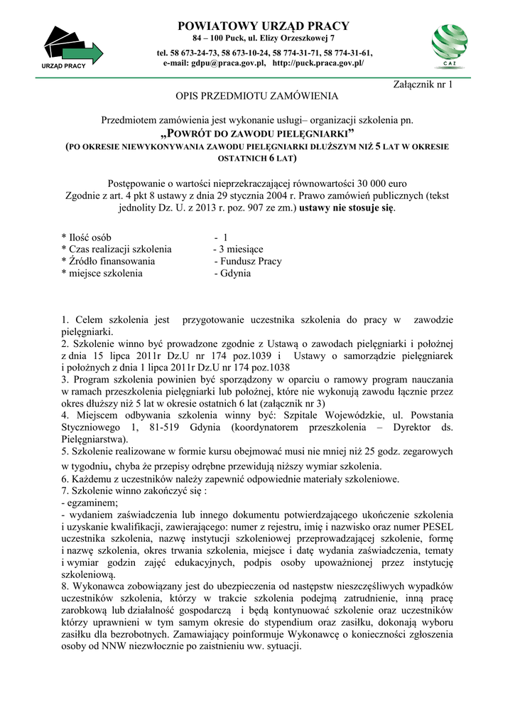 POWIATOWY URZĄD PRACY 84 – 100 Puck, ul. Elizy Orzeszkowej 7 URZĄD PRACY tel. 58 673-24-73, 58 673-10-24, 58 774-31-71, 58 774-31-61, e-mail: [email protected], http://puck.praca.gov.pl/ Załącznik nr 1 OPIS PRZEDMIOTU ZAMÓWIENIA Przedmiotem zamówienia jest wykonanie usługi– organizacji szkolenia pn. „POWRÓT DO ZAWODU PIELĘGNIARKI” (PO OKRESIE NIEWYKONYWANIA ZAWODU PIELĘGNIARKI DŁUŻSZYM NIŻ 5 LAT W OKRESIE OSTATNICH 6 LAT) Postępowanie o wartości nieprzekraczającej równowartości 30 000 euro Zgodnie z art. 4 pkt 8 ustawy z dnia 29 stycznia 2004 r. Prawo zamówień publicznych (tekst jednolity Dz. U. z 2013 r. poz. 907 ze zm.) ustawy nie stosuje się. * Ilość osób * Czas realizacji szkolenia * Źródło finansowania * miejsce szkolenia - 1 - 3 miesiące - Fundusz Pracy - Gdynia 1. Celem szkolenia jest przygotowanie uczestnika szkolenia do pracy w zawodzie pielęgniarki. 2. Szkolenie winno być prowadzone zgodnie z Ustawą o zawodach pielęgniarki i położnej z dnia 15 lipca 2011r Dz.U nr 174 poz.1039 i Ustawy o samorządzie pielęgniarek i położnych z dnia 1 lipca 2011r Dz.U nr 174 poz.1038 3. Program szkolenia powinien być sporządzony w oparciu o ramowy program nauczania w ramach przeszkolenia pielęgniarki lub położnej, które nie wykonują zawodu łącznie przez okres dłuższy niż 5 lat w okresie ostatnich 6 lat (załącznik nr 3) 4. Miejscem odbywania szkolenia winny być: Szpitale Wojewódzkie, ul. Powstania Styczniowego 1, 81-519 Gdynia (koordynatorem przeszkolenia – Dyrektor ds. Pielęgniarstwa). 5. Szkolenie realizowane w formie kursu obejmować musi nie mniej niż 25 godz. zegarowych w tygodniu, chyba że przepisy odrębne przewidują niższy wymiar szkolenia. 6. Każdemu z uczestników należy zapewnić odpowiednie materiały szkoleniowe. 7. Szkolenie winno zakończyć się : - egzaminem; - wydaniem zaświadczenia lub innego dokumentu potwierdzającego ukończenie szkolenia i uzyskanie kwalifikacji, zawierającego: numer z rejestru, imię i nazwisko oraz numer PESEL uczestnika szkolenia, nazwę instytucji szkoleniowej przeprowadzającej szkolenie, formę i nazwę szkolenia, okres trwania szkolenia, miejsce i datę wydania zaświadczenia, tematy i wymiar godzin zajęć edukacyjnych, podpis osoby upoważnionej przez instytucję szkoleniową. 8. Wykonawca zobowiązany jest do ubezpieczenia od następstw nieszczęśliwych wypadków uczestników szkolenia, którzy w trakcie szkolenia podejmą zatrudnienie, inną pracę zarobkową lub działalność gospodarczą i będą kontynuować szkolenie oraz uczestników którzy uprawnieni w tym samym okresie do stypendium oraz zasiłku, dokonają wyboru zasiłku dla bezrobotnych. Zamawiający poinformuje Wykonawcę o konieczności zgłoszenia osoby od NNW niezwłocznie po zaistnieniu ww. sytuacji. 9. Przy wyborze oferty szkoleniowej Zamawiający dokonuje wyboru oferty, biorąc pod uwagę co najmniej pięć spośród poniższych kryteriów: 1) dostosowanie programu szkolenia odpowiednio do identyfikowanego na rynku pracy zapotrzebowania na kwalifikacje, 2) jakość oferowanego programu szkolenia, w tym wykorzystanie standardów kwalifikacji zawodowych i modułowych programów szkoleń zawodowych, dostępnych w bazach danych prowadzonych przez ministra, 3) doświadczenie instytucji szkoleniowej w realizacji szkoleń z obszaru zleconego lub powierzonego szkolenia, 4) certyfikaty jakości usług posiadane przez instytucję szkoleniową, 5) dostosowanie kwalifikacji i doświadczenia kadry dydaktycznej do zakresu szkolenia, 6) dostosowanie wyposażenia dydaktycznego i pomieszczeń do potrzeb szkolenia z uwzględnieniem bezpiecznych i higienicznych warunków realizacji szkolenia, 7) rodzaj dokumentów potwierdzających ukończenie szkolenia i uzyskanie kwalifikacji, 8) koszty szkolenia, 9) sposób organizacji zajęć praktycznych określonych w programie szkolenia, 10) prowadzenie analiz skuteczności i efektywności przeprowadzanych szkoleń. Zamawiający informuje, że złożenie oferty nie będzie wiązało stron oraz, że w trakcie oceny ofert może zwracać się o dodatkowe informacje niezbędne przy dokonywaniu oceny. W przypadku pytań prosimy kontaktować się z pracownikami ds. organizacji szkoleń pod numerem telefonu (58) 673-24-73 wew. 23