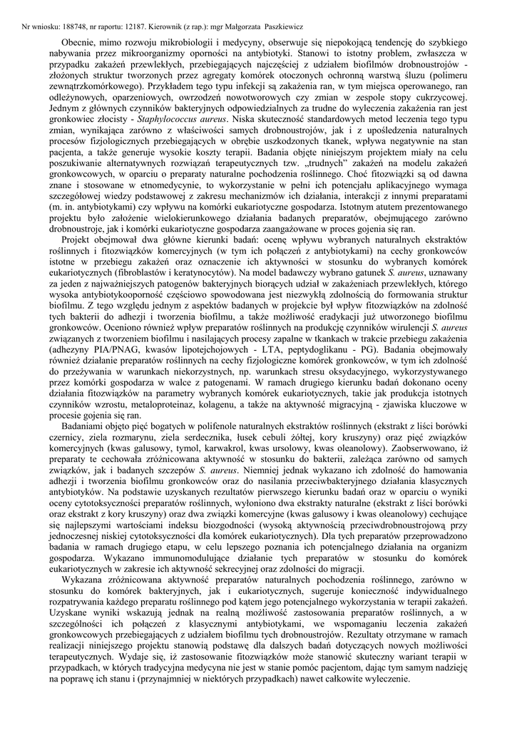 Nr wniosku: 188748, nr raportu: 12187. Kierownik (z rap.): mgr Małgorzata Paszkiewicz Obecnie, mimo rozwoju mikrobiologii i medycyny, obserwuje się niepokojącą tendencję do szybkiego nabywania przez mikroorganizmy oporności na antybiotyki. Stanowi to istotny problem, zwłaszcza w przypadku zakażeń przewlekłych, przebiegających najczęściej z udziałem biofilmów drobnoustrojów złożonych struktur tworzonych przez agregaty komórek otoczonych ochronną warstwą śluzu (polimeru zewnątrzkomórkowego). Przykładem tego typu infekcji są zakażenia ran, w tym miejsca operowanego, ran odleżynowych, oparzeniowych, owrzodzeń nowotworowych czy zmian w zespole stopy cukrzycowej. Jednym z głównych czynników bakteryjnych odpowiedzialnych za trudne do wyleczenia zakażenia ran jest gronkowiec złocisty - Staphylococcus aureus. Niska skuteczność standardowych metod leczenia tego typu zmian, wynikająca zarówno z właściwości samych drobnoustrojów, jak i z upośledzenia naturalnych procesów fizjologicznych przebiegających w obrębie uszkodzonych tkanek, wpływa negatywnie na stan pacjenta, a także generuje wysokie koszty terapii. Badania objęte niniejszym projektem miały na celu poszukiwanie alternatywnych rozwiązań terapeutycznych tzw. „trudnych” zakażeń na modelu zakażeń gronkowcowych, w oparciu o preparaty naturalne pochodzenia roślinnego. Choć fitozwiązki są od dawna znane i stosowane w etnomedycynie, to wykorzystanie w pełni ich potencjału aplikacyjnego wymaga szczegółowej wiedzy podstawowej z zakresu mechanizmów ich działania, interakcji z innymi preparatami (m. in. antybiotykami) czy wpływu na komórki eukariotyczne gospodarza. Istotnym atutem prezentowanego projektu było założenie wielokierunkowego działania badanych preparatów, obejmującego zarówno drobnoustroje, jak i komórki eukariotyczne gospodarza zaangażowane w proces gojenia się ran. Projekt obejmował dwa główne kierunki badań: ocenę wpływu wybranych naturalnych ekstraktów roślinnych i fitozwiązków komercyjnych (w tym ich połączeń z antybiotykami) na cechy gronkowców istotne w przebiegu zakażeń oraz oznaczenie ich aktywności w stosunku do wybranych komórek eukariotycznych (fibroblastów i keratynocytów). Na model badawczy wybrano gatunek S. aureus, uznawany za jeden z najważniejszych patogenów bakteryjnych biorących udział w zakażeniach przewlekłych, którego wysoka antybiotykooporność częściowo spowodowana jest niezwykłą zdolnością do formowania struktur biofilmu. Z tego względu jednym z aspektów badanych w projekcie był wpływ fitozwiązków na zdolność tych bakterii do adhezji i tworzenia biofilmu, a także możliwość eradykacji już utworzonego biofilmu gronkowców. Oceniono również wpływ preparatów roślinnych na produkcję czynników wirulencji S. aureus związanych z tworzeniem biofilmu i nasilających procesy zapalne w tkankach w trakcie przebiegu zakażenia (adhezyny PIA/PNAG, kwasów lipotejchojowych - LTA, peptydoglikanu - PG). Badania obejmowały również działanie preparatów roślinnych na cechy fizjologiczne komórek gronkowców, w tym ich zdolność do przeżywania w warunkach niekorzystnych, np. warunkach stresu oksydacyjnego, wykorzystywanego przez komórki gospodarza w walce z patogenami. W ramach drugiego kierunku badań dokonano oceny działania fitozwiązków na parametry wybranych komórek eukariotycznych, takie jak produkcja istotnych czynników wzrostu, metaloproteinaz, kolagenu, a także na aktywność migracyjną - zjawiska kluczowe w procesie gojenia się ran. Badaniami objęto pięć bogatych w polifenole naturalnych ekstraktów roślinnych (ekstrakt z liści borówki czernicy, ziela rozmarynu, ziela serdecznika, łusek cebuli żółtej, kory kruszyny) oraz pięć związków komercyjnych (kwas galusowy, tymol, karwakrol, kwas ursolowy, kwas oleanolowy). Zaobserwowano, iż preparaty te cechowała zróżnicowana aktywność w stosunku do bakterii, zależąca zarówno od samych związków, jak i badanych szczepów S. aureus. Niemniej jednak wykazano ich zdolność do hamowania adhezji i tworzenia biofilmu gronkowców oraz do nasilania przeciwbakteryjnego działania klasycznych antybiotyków. Na podstawie uzyskanych rezultatów pierwszego kierunku badań oraz w oparciu o wyniki oceny cytotoksyczności preparatów roślinnych, wyłoniono dwa ekstrakty naturalne (ekstrakt z liści borówki oraz ekstrakt z kory kruszyny) oraz dwa związki komercyjne (kwas galusowy i kwas oleanolowy) cechujące się najlepszymi wartościami indeksu biozgodności (wysoką aktywnością przeciwdrobnoustrojową przy jednoczesnej niskiej cytotoksyczności dla komórek eukariotycznych). Dla tych preparatów przeprowadzono badania w ramach drugiego etapu, w celu lepszego poznania ich potencjalnego działania na organizm gospodarza. Wykazano immunomodulujące działanie tych preparatów w stosunku do komórek eukariotycznych w zakresie ich aktywność sekrecyjnej oraz zdolności do migracji. Wykazana zróżnicowana aktywność preparatów naturalnych pochodzenia roślinnego, zarówno w stosunku do komórek bakteryjnych, jak i eukariotycznych, sugeruje konieczność indywidualnego rozpatrywania każdego preparatu roślinnego pod kątem jego potencjalnego wykorzystania w terapii zakażeń. Uzyskane wyniki wskazują jednak na realną możliwość zastosowania preparatów roślinnych, a w szczególności ich połączeń z klasycznymi antybiotykami, we wspomaganiu leczenia zakażeń gronkowcowych przebiegających z udziałem biofilmu tych drobnoustrojów. Rezultaty otrzymane w ramach realizacji niniejszego projektu stanowią podstawę dla dalszych badań dotyczących nowych możliwości terapeutycznych. Wydaje się, iż zastosowanie fitozwiązków może stanowić skuteczny wariant terapii w przypadkach, w których tradycyjna medycyna nie jest w stanie pomóc pacjentom, dając tym samym nadzieję na poprawę ich stanu i (przynajmniej w niek
