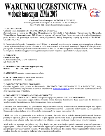 Centrum Tańca Szczepan ODDZIAŁ KOSZALIN Siedziba główna CT Szczepan: ul. Lelewela 17, 81-331 Gdynia tel. 501 285 022 e-mail: [email protected] 1. ORGANIZATOR Centrum Tańca Szczepan S.C. 84-230 RUMIA, ul. Żwirowa 32 Zaświadczenie o wpisie do Rejestru Organizatorów Turystyki i Pośredników Turystycznych Marszałka Województwa Pomorskiego nr 217. Zawarcie umowy z Centrum Tańca Szczepan następuje w chwili podpisania przez rodzica lub prawnego opiekuna Umowy-Zgłoszenia, której integralną częścią są niniejsze WARUNKI UCZESTNICTWA. 2. Organizator informuje, że zgodnie z art. 5 Ustawy o usługach turystycznych, posiada ubezpieczenie na pokrycie zwrotu wpłat wniesionych przez klientów w razie niewykonania zobowiązań umownych. Wysokość ubezpieczenia jest zgodna z Rozporządzeniem Ministra Finansów z dnia 24.12.2004 w sprawie ubezpieczenia na rzecz klientów w związku z działalnością prowadzoną przez organizatorów turystyki i pośredników turystycznych. 3. MIEJSCE: Grand Laola Spa ul. Grunwaldzka 10, 72-346 Pobierowo tel. 91 386 41 75 4. TERMIN: Obóz taneczno-wypoczynkowy turnus: 11– 17.02.2017 r 5. ATRAKCJE: zgodne z zamieszczoną ofertą 6. PRZEJAZD: Przejazd autokarami na trasie: Koszalin – Pobierowo – Koszalin 7. GODZINY WYJAZDU I POWROTU: Godziny wyjazdu będą podane w dokumencie „SZCZEGÓŁOWE INFORMACJE DLA RODZICÓW”, który będzie umieszczony do pobrania na stronie internetowej www.ctszczepan.pl oraz przekazane uczestnikom obozu dwa tygodnie przed wyjazdem. 8. DODATKOWE INFORMACJE DLA RODZICÓW KONTAKT TELEFONICZNY Z DZIEĆMI tylko i wyłącznie podczas CISZY POOBIEDNIEJ! Ze względu na organizację zajęć podczas trwania obozu, telefony komórkowe będą oddawane do depozytu u wychowawców i przekazywane dzieciom podczas ciszy poobiedniej. Uczestnik jest zobowiązany do powierzenia Organizatorowi rzeczy wartościowych pozostawianych bez opieki podczas pobytu oraz w środkach transportu. Rodzice/Opiekunowie Uczestnika zobowiązani są do zgłoszenia Organizatorowi posiadania przez Uczestnika podczas pobytu rzeczy wartościowych. LEKI - w razie przyjmowania przez dziecko (na stałe, doraźnie lub w trakcie obozu) jakichkolwiek lekarstw prosimy o spisanie, jakie są to lekarstwa i w jaki sposób dziecko ma mieć je podawane. Informacja musi być podpisana przez lekarza. Cały opis na kartce wraz z lekami proszę przekazać wychowawcy przed wyjazdem. Jeżeli dziecko wymaga specjalistycznej diety konieczne jest wcześniejsze poinformowanie o tym Organizatora wypoczynku. Dziecko może być uczestnikiem wypoczynku po sprawdzeniu czy wskazana specjalistyczna dieta jest przygotowywana w danym ośrodku. W przypadku dostarczania do ośrodka własnych produktów spożywczych opiekun dziecka nie ma prawa żądać zwrotu poniesionych kosztów. Jeżeli dziecko zostanie osobiście zawiezione lub/i osobiście odebrane z obozu prosimy o pisemną informację na adres e-mail [email protected] do dnia 1 lutego 2017 r. Zabrać dziecko z obozów (nawet na dwugodzinne odwiedziny) może tylko rodzic, prawny opiekun lub osoba posiadająca pisemne upoważnienie od rodziców (musi mieć przy sobie dowód osobisty oraz podpisać kartę wyjścia). Jeśli po przyjeździe z obozu nie będzie mogło być odebrane osobiście przez rodzica lub prawnych opiekunów, konieczne jest wcześniejsze, osobiste zgłoszenie tego faktu na piśmie na adres e-mail [email protected]. Należy podać dane osoby (nazwisko, imię i numer dowodu tożsamości), którą upoważnią Państwo do odbioru dziecka. BAGAŻ - w celu ułatwienia transportu bagażu prosimy, aby dziecko spakowane było w jedną torbę, najlepiej walizkę na kółkach. Bagaż ten musi mieć przyczepioną zawieszkę bagażową zawierającą: imię i nazwisko, adres, telefon. Po przybyciu na miejsce zbiórki należy odnaleźć grupę, do której zostało przydzielone dziecko. Informacje o grupach będą ujęte na listach wywieszonych na autokarach. Następnie należy znaleźć wychowawcę danej grupy. 9. ORGANIZATOR ZAPEWNIA: wykwalifikowanych opiekunów i wychowawców grup; nauczycieli tańca; opiekę lekarską w ramach świadczeń opieki zdrowotnej udzielanych na zasadach określonych w ustawie z dnia 27.07.2004 r. o świadczeniach opieki zdrowotnej finansowanych ze środków publicznych; wyżywienie: 4 posiłki dziennie, tj. śniadanie, obiad, podwieczorek, kolacja; zakwaterowanie: w pokojach 2,3-osobowych (typu studio) z pełnym węzłem sanitarnym – bez możliwości wyboru pokoju; przejazd na miejsce wypoczynku i z powrotem zgodnie z pkt. 6. PRZEJAZD. 10. UBEZPIECZENIE: Wszyscy uczestnicy po podpisaniu karty kwalifikacyjnej uczestnika obozu, o której mowa w pkt 11 oraz kadra, będą ubezpieczeni od Następstw Nieszczęśliwych Wypadków w AXA S.A. 11. KARTĘ KWALIFIKACYJNĄ UCZESTNIKA OBOZU, Umowę oraz Warunki można pobrać ze strony internetowej www.ctszczepan.pl lub w biurze Centrum Tańca Szczepan. Kartę kwalifikacyjną uczestnika obozu należy oddać uzupełnioną do dnia 1 lutego 2017 r. nauczycielowi tańca w szkole. UWAGA!!! Karta kwalifikacyjna jest niezbędnym dokumentem do ubezpieczenia dziecka. Prosimy o przestrzeganie daty złożenia jej w biurze Centrum Tańca Szczepan. 12. PŁATNOŚĆ I REZERWACJA Rezerwacji dokonujemy poprzez wpłatę zadatku na konto i oddanie uzupełnionego zgłoszenia/umowy nauczycielowi tańca w szkole, do której dziecko uczęszcza. Integralną częścią rezerwacji jest opłata, którą dokonujemy wyłącznie przelewem na Centrum Tańca Szczepan (z dopiskiem: „Obóz zimowy, imię i nazwisko dziecka”). konto ALIOR BANK nr konta 53 2490 0005 0000 4600 9682 6715 TURNUS ZADATEK płatny przy zgłoszeniu 100,00 zł (koszt rezerwacji) I RATA 400,00 zł – należy wpłacić do 06.01.2017 (zaliczka) II RATA 349,00 zł – należy wpłacić do 01.02.2017 KOSZT CAŁKOWITY OBOZU 849,00 zł UWAGA! We wszystkich przypadkach koszt rezerwacji w wysokości 100 zł będzie zaliczony na pocz