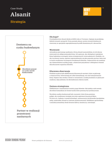Case Study Alsanit Strategia Dla kogo? Przedsiębiorstwo Alsanit działa od 2004 roku w Trzciance. Zajmuje się produkcją lekkich ścianek i przegród. Firma posiada własny system ścianek działowych, Dostawca na rynku budowlanym stworzony ze specjalnie zaprojektowanych profili aluminiowych i akcesoriów. Wyzwanie Już podczas pierwszego spotkania z firmą Alsanit zauważyliśmy, że ich obecny wizerunek nie oddaje potencjału firmy. Ich aspiracje, aby obsługiwać największe firmy budowlane wymagały zmian strategicznych i wizerunkowych. Chodziło o to, aby wyrównać szanse, poprzez zaprezentowanie się jako poważny partner, który jest w stanie zrealizować wymagania świadomych klientów. Jednocześnie nie zamknąć się z komunikatem na jedną grupę, a skutecznie pozyskiwać i obsługiwać również dotychczasowe segmenty klientów. Określenie pozycji na rynku wsród konkurentów Kluczowa obserwacja Punktem wyjścia było zdefiniowanie kluczowych wartości, które wypływają z wnętrza firmy i determinują nie tylko komunikację, ale całe funkcjonowanie firmy. Dopiero taka wiedza o firmie w zestawieniu z analizą kontekstu w jakim jest osadzona, daje podstawy do sformułowania rdzenia marki. Zmiana strategiczna Zdefiniowane i zanalizowane zostały grupy klientów. Dla każdej z nich zostały określone komunikaty (w formie haseł), które powinny być przekazywane. Wynikiem analizy konkurencji były czynności, które firma powinna podjąć, aby zrealizować strategię oraz móc aspirować do pozycji lidera. W tym m.in.: badania i rozwój technologii, umieszczenie użytkownika (produktów, usług, materiałów Alsanit w centrum zainteresowania). Dodatkowo uprościliśmy i ustandaryzowaliśmy druki firmowe (oferty, kosztorysy, instrukcje). Partner w realizacji przestrzeni sanitarnych Nowe podejście do biznesu www.dt-poznan.pl Case Study Alsanit Wizerunek Decyzje wizerunkowe Aby wzmocnić przekaz, zaprojektowany został nowoczesny, prosty wizerunek z hasłem: „Tworzymy przestrzeń”. Dodatkowo został zaproponowany charakterystyczny element wstęgi, który w pośredni sposób komunikuje przedmiot działalności firmy i nawiązuje do hasła. Elementy charakterystyczne • motyw wstęgi • charakterystyczny odcień niebieskiego • piktogramy Narzędzia budowania marki • prezentacja oferty • produkty uzupełniające – seria środków do pielęgnacji • materiały wspierające sprzedaż (katalogi produktowe, oferta) Nowe podejście do biznesu www.dt-poznan.pl