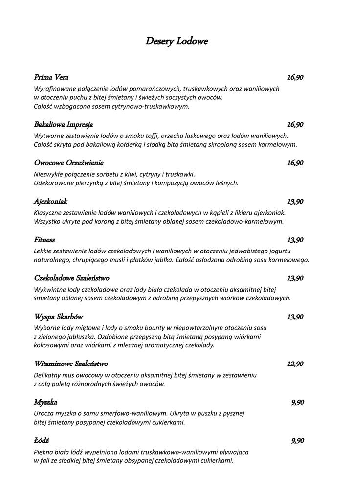 Desery Lodowe Prima Vera 16,90 Bakaliowa Impresja 16,90 Owocowe Orzeźwienie 16,90 Ajerkoniak 13,90 Fitness 13,90 Czekoladowe Szaleństwo 13,90 Wyspa Skarbów 13,90 Witaminowe Szaleństwo 12,90 Wyrafinowane połączenie lodów pomarańczowych, truskawkowych oraz waniliowych w otoczeniu puchu z bitej śmietany i świeżych soczystych owoców. Całość wzbogacona sosem cytrynowo-truskawkowym. Wytworne zestawienie lodów o smaku toffi, orzecha laskowego oraz lodów waniliowych. Całość skryta pod bakaliową kołderką i słodką bitą śmietaną skropioną sosem karmelowym. Niezwykłe połączenie sorbetu z kiwi, cytryny i truskawki. Udekorowane pierzynką z bitej śmietany i kompozycją owoców leśnych. Klasyczne zestawienie lodów waniliowych i czekoladowych w kąpieli z likieru ajerkoniak. Wszystko ukryte pod koroną z bitej śmietany oblanej sosem czekoladowo-karmelowym. Lekkie zestawienie lodów czekoladowych i waniliowych w otoczeniu jedwabistego jogurtu naturalnego, chrupiącego musli i płatków jabłka. Całość osłodzona odrobiną sosu karmelowego. Wykwintne lody czekoladowe oraz lody biała czekolada w otoczeniu aksamitnej bitej śmietany oblanej sosem czekoladowym z odrobiną przepysznych wiórków czekoladowych. Wyborne lody miętowe i lody o smaku bounty w niepowtarzalnym otoczeniu sosu z zielonego jabłuszka. Ozdobione przepyszną bitą śmietaną posypaną wiórkami kokosowymi oraz wiórkami z mlecznej aromatycznej czekolady. Delikatny mus owocowy w otoczeniu aksamitnej bitej śmietany w zestawieniu z całą paletą różnorodnych świeżych owoców. Myszka 9,90 Łódź 9,90 Urocza myszka o samu smerfowo-waniliowym. Ukryta w puszku z pysznej bitej śmietany posypanej czekoladowymi cukierkami. Piękna biała łódź wypełniona lodami truskawkowo-waniliowymi pływająca w fali ze słodkiej bitej śmietany obsypanej czekoladowymi cukierkami.