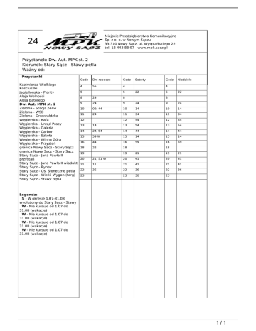 Miejskie Przedsiębiorstwo Komunikacyjne Sp. z o. o. w Nowym Sączu 33-310 Nowy Sącz, ul. Wyspiańskiego 22 tel. 18 443 88 97 www.mpk.sacz.pl 24 Przystanek: Dw. Aut. MPK st. 2 Kierunek: Stary Sącz - Stawy pętla Ważny od: Przystanki Kazimierza Wielkiego Kościuszki Jagiellońska - Planty Aleja Wolności Aleja Batorego Dw. Aut. MPK st. 2 Zielona - Stacja paliw Zielona - WSB Zielona - Grunwaldzka Węgierska - Rafa Węgierska - Urząd Pracy Węgierska - Galeria Węgierska - Carbon Węgierska - Szkoła Węgierska - Winna Góra Węgierska - Przystań granica Nowy Sącz - Stary Sącz granica Nowy Sącz - Stary Sącz Stary Sącz - Jana Pawła II przystań Stary Sącz - Jana Pawła II wiadukt Stary Sącz - Rynek Stary Sącz - Os. Słoneczne pętla Stary Sącz - Wielki Wygon (targ) Stary Sącz - Stawy pętla Godz Dni robocze Godz 4 55 4 6 6 Soboty Godz Niedziele 4 22 6 22 8 24 8 9 24 9 24 9 24 10 09, 44 10 14 10 14 11 24 11 34 11 34 12 54 12 54 12 8 13 14 13 54 13 54 14 24, 54 14 44 14 44 15 59 W 15 14 15 14 16 44 16 59 16 59 18 22 18 19 18 19 21 19 21 20 21, 51 W 20 41 20 41 21 11 21 41 21 41 22 36 22 36 22 36 23 30 23 23 Legenda: S - W okresie 1.07-31.08 wydłużony do Stary Sącz - Stawy W - Nie kursuje od 1.07 do 31.08 (wakacje) W - Nie kursuje od 1.07 do 31.08 (wakacje) W - Nie kursuje od 1.07 do 31.08 (wakacje) W - Nie kursuje od 1.07 do 31.08 (wakacje) 1/1 Powered by TCPDF (www.tcpdf.org)