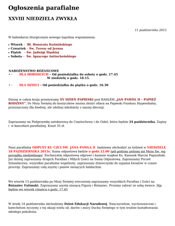 Ogłoszenia parafialne XXVIII NIEDZIELA ZWYKŁA 11 października 2015 W kalendarzu liturgicznym nowego tygodnia wspomnienia: ● ● ● ● Wtorek – Bł. Honorata Koźmińskiego Czwartek – Św. Teresy od Jezusa Piątek – Św. Jadwigi Śląskiej Sobota – Św. Ignacego Antiocheńskiego NABOŻEŃSTWO RÓŻAŃCOWE •· DLA DOROSŁYCH – Od poniedziałku do soboty o godz. 17.45 W niedzielę o godz. 18.15. •· DLA DZIECI – Od poniedziałku do piątku o godz. 16.30 Dzisiaj w całym kraju przeżywamy XV DZIEŃ PAPIESKI pod HASŁEM „JAN PAWEŁ II – PAPIEŻ RODZINY”. Po Mszy Świętej do koszyczków można złożyć ofiarę na Papieski Fundusz Stypendialny, przeznaczony dla biednej, ale zdolnej młodzieży z naszej diecezji. Zapraszamy na Pielgrzymkę autokarową do Częstochowy i do Gidel, która będzie 24 października. Zapisy i w kancelarii parafialnej. Koszt 35 zł. Nasz parafialny ODPUST KU CZCI ŚW. JANA PAWŁA II będziemy obchodzić za tydzień w NIEDZIELĘ 18 PAŹDZIERNIKA 2015r. Suma odpustowa będzie o godz.12.00 /pół godziny później niż Msza Św. wg porządku niedzielnego/. Eucharystię odpustową odprawi i kazanie wygłosi Ks. Kanonik Marcin Papuziński. Już dzisiaj zapraszamy drogich Parafian i Miłych Gości na Sumę Odpustową. Zapraszamy Poczet Sztandarowy, wszystkie parafialne wspólnoty, zapraszamy dziewczynki do sypania kwiatów w czasie procesji. Zapraszamy całą asystę i panów niosących baldachim. We wtorek 13 października po Mszy Świętej wieczornej zapraszamy wszystkich Parafian i Gości na Różaniec Fatimski. Zapraszamy asystę niosącą Figurę i Różaniec. Prosimy zabrać ze sobą świece. Nie będzie we wtorek różańca o godz. 17.45 W środę 14 października obchodzimy Dzień Edukacji Narodowej. Nauczycielom, wychowawcom i katechetom życzymy z tej okazji wielu sił, darów i mocy Ducha Świętego w tym trudzie kształtowania młodego pokolenia. W piątek 16 października będziemy obchodzić rocznicę wyboru Św. Jana Pawła II na Stolicę Piotrową. W tym także dniu będziemy obchodzić 4 ROCZNICĘ NAWIEDZENIA NASZEJ PARAFII PRZEZ MATKĘ BOŻĄ W KOPII JASNOGÓRSKIEGO OBRAZU. Zapraszamy na Mszę św. o godz. 18.30. Dziękujemy wszystkim ofiarodawcom i darczyńcom, którzy wspierają nas swoja modlitwą, pracą a także ofiarą. Dziękujemy trzem rodzinom za dar serca złożony na budowę kościoła, na rozwój naszej parafii. Dziękujemy za dzisiejsze ofiary złożone na TACĘ INWESTYCYJNO – BUDOWLANĄ. Z naszej wspólnoty Pan Bóg odwołał do wieczności Śp. Bożenę Cichorek z ul. Marii Koszutskiej, która przeżyła 72 lata, jej pogrzeb odbył się w sobotę. Módlmy się w jej intencji: Wieczny odpoczynek racz jej dać Panie…… Zapraszamy do czytania prasy katolickiej. Jest już nowy „Opiekun”, w którym polecamy szczególnie artykuł: „Cud w prezencie urodzinowym” - o Bł. Ks. Jerzym Popiełuszce, przez którego wstawiennictwo dokonało się uzdrowienie z białaczki. Jest też wiele ciekawych informacji z życia naszej diecezji. Jest także „Przewodnik Katolicki”, i Tygodnik „Niedziela” w których jest także wiele dobrych artykułów. Wszystkim, którzy w najbliższym tygodniu obchodzą imieniny czy urodziny, składamy z serca płynące życzenia. Zbliża się miesiąc listopad, miesiąc pamięci o zmarłych. W tym miesiącu jak również przez cały rok, tradycyjnie modlimy się za naszych krewnych, przyjaciół i znajomych, którzy uprzedzili nas w drodze do domu Ojca. Między innymi czynimy to w tzw. Wypominkach rocznych i oktawalnych. W rocznych wypominkach modlimy się za naszych zmarłych przed cały rok przed Mszą Świętą w sobotę o godz. 18.30 i w każdą niedziele przed Mszą św. o godz. 8.00 i 10.00, 11.30 , 16.30 i 19.00. Natomiast w wypominkach oktawalnych, będziemy modlić się codziennie na Różańcu za naszych zmarłych, przez całą oktawę Wszystkich Świętych - od 1 do 8 listopada. Przy wyjściu z kościoła można zabrać sobie gotowe kartki, gdzie możemy wpisać naszych zmarłych Zostały wywieszone nowe zapowiedzi przedślubne, prosimy się z nimi zapoznać. Drogim naszym Parafianom, miłym Gościom na ten nowy tydzień życzymy obfitych Łask Bożych przez wstawiennictwo Św. Jana Pawła II.