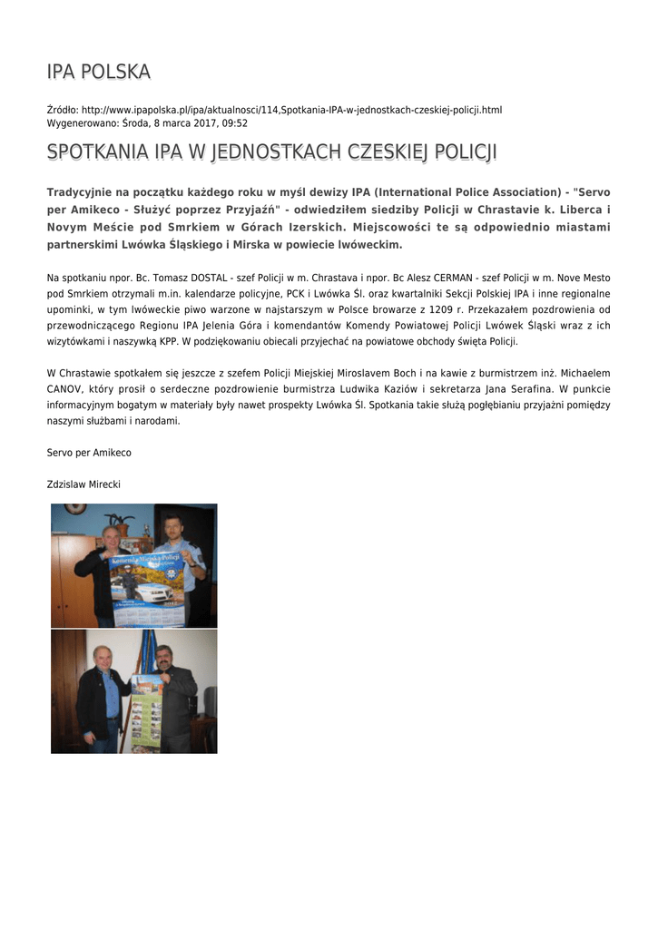 IPA POLSKA Źródło: http://www.ipapolska.pl/ipa/aktualnosci/114,Spotkania-IPA-w-jednostkach-czeskiej-policji.html Wygenerowano: Środa, 8 marca 2017, 09:52 SPOTKANIA IPA W JEDNOSTKACH CZESKIEJ POLICJI Tradycyjnie na początku każdego roku w myśl dewizy IPA (International Police Association) - "Servo per Amikeco - Służyć poprzez Przyjaźń" - odwiedziłem siedziby Policji w Chrastavie k. Liberca i Novym Meście pod Smrkiem w Górach Izerskich. Miejscowości te są odpowiednio miastami partnerskimi Lwówka Śląskiego i Mirska w powiecie lwóweckim. Na spotkaniu npor. Bc. Tomasz DOSTAL - szef Policji w m. Chrastava i npor. Bc Alesz CERMAN - szef Policji w m. Nove Mesto pod Smrkiem otrzymali m.in. kalendarze policyjne, PCK i Lwówka Śl. oraz kwartalniki Sekcji Polskiej IPA i inne regionalne upominki, w tym lwóweckie piwo warzone w najstarszym w Polsce browarze z 1209 r. Przekazałem pozdrowienia od przewodniczącego Regionu IPA Jelenia Góra i komendantów Komendy Powiatowej Policji Lwówek Śląski wraz z ich wizytówkami i naszywką KPP. W podziękowaniu obiecali przyjechać na powiatowe obchody święta Policji. W Chrastawie spotkałem się jeszcze z szefem Policji Miejskiej Miroslavem Boch i na kawie z burmistrzem inż. Michaelem CANOV, który prosił o serdeczne pozdrowienie burmistrza Ludwika Kaziów i sekretarza Jana Serafina. W punkcie informacyjnym bogatym w materiały były nawet prospekty Lwówka Śl. Spotkania takie służą pogłębianiu przyjażni pomiędzy naszymi służbami i narodami. Servo per Amikeco Zdzislaw Mirecki Ocena: 1/5 (1) Tweetnij Dolnośląska Grupa Wojewódzka IPA, IPA Czechy