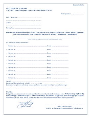 Załącznik Nr 4 a ZESTAWIENIE KOSZTÓW – KOSZTY DIAGNOSTYKI, LECZENIA I REHABILITACJI Data wysłania: ............................... Imię i Nazwisko: ........................................................ .................................................................................... Adres: ........................................................................ .................................................................................... Nr telefonu: ............................................................... Oświadczam, że zapoznałem się z treścią Załącznika nr 1–Wykazem wydatków w ramach pomocy społecznej i zwracam się z prośbą o zwrot kosztów diagnostyki, leczenia i rehabilitacji Podopiecznego .................................................................................................................................................................. (numer ewidencyjny Podopiecznego, nazwisko i imię Podopiecznego Fundacji) wg przedstawionego zestawienia: - faktura nr ............................................................................ kwota ........................................ - faktura nr ............................................................................ kwota ........................................ - faktura nr ............................................................................ kwota ........................................ - faktura nr ............................................................................ kwota ........................................ - faktura nr ............................................................................ kwota ........................................ - faktura nr ............................................................................ kwota ........................................ - faktura nr ............................................................................ kwota ........................................ - faktura nr ............................................................................ kwota ........................................ - faktura nr ............................................................................ kwota ........................................ - faktura nr ............................................................................ kwota ........................................ SUMA: ............................................................................................................................... Załączam faktury/rachunki w ilości: .....................egz. Zaakceptowaną kwotę refundacji proszę przekazać na podany poniżej nr konta bankowego: ........................................................................................................................................................ UWAGI: Przypominamy, że celowość poniesionych kosztów musi być dokładnie opisana przez Podopiecznego bądź osoby reprezentujące Podopiecznego na odwrocie każdego dokumentu księgowego potwierdzającego wydatki , a dokumenty te nie mogą budzić żadnych wątpliwości pod względem rzetelności oraz oryginalności. Stanisław Kowalski prezes Zarządu ……………………………………………………….......... Podpis Podopiecznego/ Rodzica lub innego prawnego opiekuna Podopiecznego