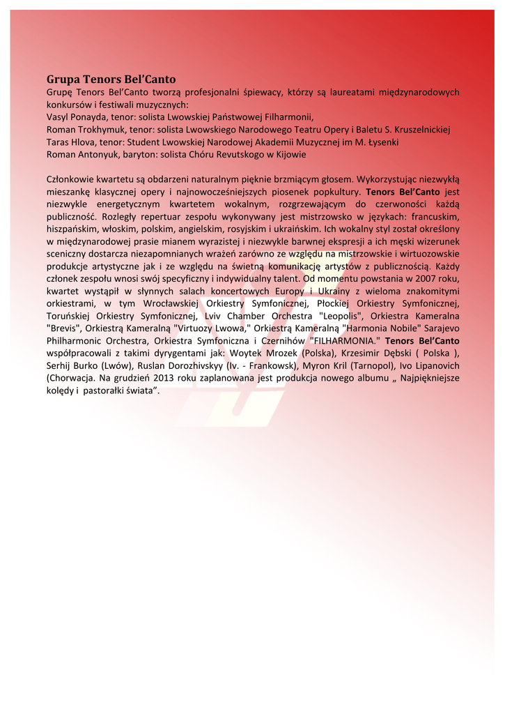 Grupa Tenors Bel’Canto Grupę Tenors Bel’Canto tworzą profesjonalni śpiewacy, którzy są laureatami międzynarodowych konkursów i festiwali muzycznych: Vasyl Ponayda, tenor: solista Lwowskiej Państwowej Filharmonii, Roman Trokhymuk, tenor: solista Lwowskiego Narodowego Teatru Opery i Baletu S. Kruszelnickiej Taras Hlova, tenor: Student Lwowskiej Narodowej Akademii Muzycznej im M. Łysenki Roman Antonyuk, baryton: solista Chóru Revutskogo w Kijowie Członkowie kwartetu są obdarzeni naturalnym pięknie brzmiącym głosem. Wykorzystując niezwykłą mieszankę klasycznej opery i najnowocześniejszych piosenek popkultury. Tenors Bel’Canto jest niezwykle energetycznym kwartetem wokalnym, rozgrzewającym do czerwoności każdą publiczność. Rozległy repertuar zespołu wykonywany jest mistrzowsko w językach: francuskim, hiszpańskim, włoskim, polskim, angielskim, rosyjskim i ukraińskim. Ich wokalny styl został określony w międzynarodowej prasie mianem wyrazistej i niezwykle barwnej ekspresji a ich męski wizerunek sceniczny dostarcza niezapomnianych wrażeń zarówno ze względu na mistrzowskie i wirtuozowskie produkcje artystyczne jak i ze względu na świetną komunikację artystów z publicznością. Każdy członek zespołu wnosi swój specyficzny i indywidualny talent. Od momentu powstania w 2007 roku, kwartet wystąpił w słynnych salach koncertowych Europy i Ukrainy z wieloma znakomitymi orkiestrami, w tym Wrocławskiej Orkiestry Symfonicznej, Płockiej Orkiestry Symfonicznej, Toruńskiej Orkiestry Symfonicznej, Lviv Chamber Orchestra "Leopolis", Orkiestra Kameralna "Brevis", Orkiestrą Kameralną "Virtuozy Lwowa," Orkiestrą Kameralną "Harmonia Nobile" Sarajevo Philharmonic Orchestra, Orkiestra Symfoniczna i Czernihów "FILHARMONIA." Tenors Bel’Canto współpracowali z takimi dyrygentami jak: Woytek Mrozek (Polska), Krzesimir Dębski ( Polska ), Serhij Burko (Lwów), Ruslan Dorozhivskyy (Iv. -‐ Frankowsk), Myron Kril (Tarnopol), Ivo Lipanovich (Chorwacja. Na grudzień 2013 roku zaplanowana jest produkcja nowego albumu „ Najpiękniejsze kolędy i pastorałki świata”.