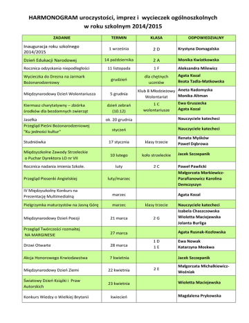 HARMONOGRAM uroczystości, imprez i wycieczek ogólnoszkolnych w roku szkolnym 2014/2015 ZADANIE TERMIN KLASA Inauguracja roku szkolnego 2014/2015 1 września 2D Krystyna Domagalska Dzień Edukacji Narodowej 14 października 2A Monika Kwiatkowska 11 listopada 1F Aleksandra Milewicz Wycieczka do Drezna na Jarmark Bożonarodzeniowy grudzień dla chętnych uczniów Międzynarodowy Dzień Wolontariusza 5 grudnia Rocznica odzyskania niepodległości ODPOWIEDZIALNY Agata Kozal Beata Tadla-Matkowska Klub 8 Młodzieżowy Aneta Radomyska Monika Altman Wolontariat Ewa Gruszecka 1C Agata Kozal wolontariusze Kiermasz charytatywny – zbiórka środków dla bezdomnych zwierząt dzień zebrań (10.12) Jasełka Przegląd Pieśni Bożonarodzeniowej "Ku jedności kultur" ok. 20 grudnia Nauczyciele katecheci styczeń Nauczyciele katecheci Studniówka Międzyszkolne Zawody Strzeleckie o Puchar Dyrektora LO nr VII Rocznica nadania imienia Szkole. 17 stycznia klasy trzecie Renata Myśków Paweł Dąbrowa 10 lutego koło strzeleckie Jacek Szczepanik luty 2C Przegląd Piosenki Angielskiej luty/marzec IV Międzyszkolny Konkurs na Prezentację Multimedialną marzec Pielgrzymka maturzystów na Jasną Górę marzec klasy trzecie Międzynarodowy Dzień Poezji 21 marca 2G Przegląd Twórczości rozmaitej NA MARGINESIE 27 marca Drzwi Otwarte 28 marca Akcja Honorowego Krwiodawstwa 7 kwietnia Paweł Pawlicki Małgorzata MarkiewiczParafianowicz Karolina Demczyszyn Agata Kozal Nauczyciele katecheci Izabela Chaszczowska Wioletta Maciejewska Jolanta Burliga Agata Rusnak-Kozłowska 1D 1E Ewa Nowak Katarzyna Moskwa Jacek Szczepanik 2E Małgorzata MichalkiewiczWoźniak Międzynarodowy Dzień Ziemi 22 kwietnia Światowy Dzień Książki i Praw Autorskich 23 kwietnia Wioletta Maciejewska kwiecień Magdalena Prykowska Konkurs Wiedzy o Wielkiej Brytanii Wycieczka do Berlina „Ostatni dzwonek” Rocznica uchwalenia Konstytucji 3 Maja kwiecień dla chętnych uczniów 24 kwietnia 2H Marta Drewniowska 3 maja 1G Agata Kozal Dzień Sportu czerwiec Koncert chóru Concordia czerwiec chórzyści 26 czerwca 2I Uroczyste zakończenie roku szkolnego Uroczystość wręczenia świadectw dojrzałości czerwiec Agata Kozal Beata Tadla-Matkowska Nauczyciele wychowania fizycznego Agnieszka Jóźwik Natalia Kozik Agata Zarzycka Wychowawcy klas 3 Szkolne igrzyska sportowe cały rok szkolny Nauczyciele wychowania fizycznego Liga klas cały rok szkolny Ewa Nowak Kronika szkolna cały rok szkolny 1J Beata Wojasiewicz Inauguracja roku szkolnego 2015/2016 wrzesień 2015 1A Justyna Mielniczek