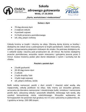 Szkoła zdrowego gotowania Wisła, 17.10.2016 „Dynia, wartościowa i niedoceniana” Gulasz z dyni 70 dag obranej dyni 2 większe cebule 4 parówki sojowe 3-4 łyżki przecieru pomidorowego sól, olej, pieprz ziołowy Cebulę kroimy w krążki i dusimy na oleju. Obraną dynię kroimy w kostkę i dodajemy do cebuli wraz z pokrojonymi w krążki parówkami. Całość mieszamy, solimy i przyprawiamy pieprzem ziołowym do smaku. Do potrawy dodajemy ok. 1 szklanki wody i dusimy pod przykryciem ok. 20 minut. Na koniec dodajemy przecier pomidorowy, wszystko razem mieszamy i gotujemy jeszcze przez 5 minut. Gulasz możemy podać jako danie obiadowe z ryżem i surówką lub do chleba. Pasztet z pestek dyni 2 bułki grahamki 20-30 dag ziaren dyni 2 cebule 2 łyżki drożdży Tebi 3 łyżki mąki sojowej sól, pieprz ziołowy, woda Bułki należy namoczyć, pestki z dyni zmielić i również zalać wodą, aby napęczniały, cebulę poddusić na oleju. Gdy mamy już wszystko gotowe, wrzucamy do blendera namoczone i nieodciśnięte bułki, zmielone i namoczone pestki dyni, uduszoną cebulę i pozostałe składniki, dolewając tyle wody, aby uzyskać konsystencję ciasta naleśnikowego. Wszystko wylewamy do formy(pasztet nie powinien być grubszy niż 3-5 cm) i pieczemy w piekarniku ok. 1 godziny w temp. 150-180 stopni. Surówka z dyni 40 dag dyni zetrzeć na tarce (drobno lub grubo wg uznania) dodać 1 drobno pokrojoną cebulę, przecier pomidorowy. Wszystko razem wymieszać doprawić oliwą z oliwek, solą, pieprzem ziołowym i odrobiną sosu sojowego. Najlepiej smakuje na drugi dzień. „Tarta” z dyni Ciasto: 10 dag mąki pszennej ½ szklanki mąki kukurydzianej 2 dag mielonych migdałów 7,5 dag margaryny 1 łyżka cukru skórka z cytryny szczypta soli Farsz: 50 dag miąższu z dyni 8 dag cukru ½ łyżki przyprawy do piernika 1 łyżka mąki ziemniaczanej 2 łyżki mielonych migdałów 1 dag agaru w proszku skórka pomarańczowa lub cytrynowa dla aromatu margaryna do wysmarowania formy Ciasto: Wszystkie składniki na ciasto utrzeć mikserem na jednolitą masę, dodając kilka łyżeczek wody. Gotowe ciasto zawinąć w folię i włożyć do lodówki na 3 godziny. Farsz: Obraną i oczyszczoną dynię ugotować na parze. W ½ litra wody rozpuścić agar i tylko zagotować. Ugotowaną na parze dynię wrzucić do miksera, dodać zagotowany agar, miód, przyprawy, skórkę z pomarańczy lub cytryny oraz mąkę ziemniaczaną. Zmiksować wszystko na jednolitą masę. Ciasto wyjąć z lodówki, wysmarować formę margaryną i wyłożyć do niej ciasto, robiąc niewielkie brzegi. Posypać ciasto mielonymi migdałami, wylać zmiksowaną masę z dyni, wstawić do nagrzanego piekarnika i piec w temperaturze 180 stopni przez 30 – 40 minut. Ciasto kroić po ostygnięciu.
