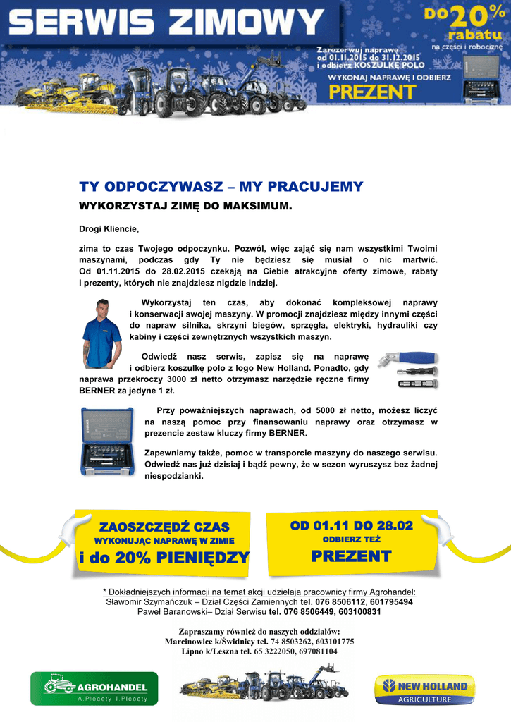 ` TY ODPOCZYWASZ – MY PRACUJEMY WYKORZYSTAJ ZIMĘ DO MAKSIMUM. Drogi Kliencie, zima to czas Twojego odpoczynku. Pozwól, więc zająć się nam wszystkimi Twoimi maszynami, podczas gdy Ty nie będziesz się musiał o nic martwić. Od 01.11.2015 do 28.02.2015 czekają na Ciebie atrakcyjne oferty zimowe, rabaty i prezenty, których nie znajdziesz nigdzie indziej. Wykorzystaj ten czas, aby dokonać kompleksowej naprawy i konserwacji swojej maszyny. W promocji znajdziesz między innymi części do napraw silnika, skrzyni biegów, sprzęgła, elektryki, hydrauliki czy kabiny i części zewnętrznych wszystkich maszyn. Odwiedź nasz serwis, zapisz się na naprawę i odbierz koszulkę polo z logo New Holland. Ponadto, gdy naprawa przekroczy 3000 zł netto otrzymasz narzędzie ręczne firmy BERNER za jedyne 1 zł. Przy poważniejszych naprawach, od 5000 zł netto, możesz liczyć na naszą pomoc przy finansowaniu naprawy oraz otrzymasz w prezencie zestaw kluczy firmy BERNER. Zapewniamy także, pomoc w transporcie maszyny do naszego serwisu. Odwiedź nas już dzisiaj i bądź pewny, że w sezon wyruszysz bez żadnej niespodzianki. ZAOSZCZĘDŹ CZAS WYKONUJĄC NAPRAWĘ W ZIMIE i do 20% PIENIĘDZY OD 01.11 DO 28.02 ODBIERZ TEŻ PREZENT * Dokładniejszych informacji na temat akcji udzielają pracownicy firmy Agrohandel: Sławomir Szymańczuk – Dział Części Zamiennych tel. 076 8506112, 601795494 Paweł Baranowski– Dział Serwisu tel. 076 8506449, 603100831 Zapraszamy również do naszych oddziałów: Marcinowice k/Świdnicy tel. 74 8503262, 603101775 Lipno k/Leszna tel. 65 3222050, 697081104