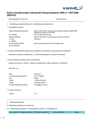 Karta charakterystyki odpowiedni Rozporządzenie (WE) nr 1907/2006 (REACH) Data aktualizacji: 24-oct-2012 Numer wersji: 3 ________________________________________________________________________________________________ 1. Identyfikacja substancji/mieszaniny i identyfikacja przedsiębiorstwa 1.1 Identyfikator produktu Nazwa handlowa/Oznaczenie Nr. produktu Nazwa substancji nr. CAS nr. INDEXu Numer rejestru REACH. inne oznaczenia potas 10.000 mg/l w rozcieńczonym kwasie azotowym ARISTAR® pojedynczy wzorzec do ICP-MS 45712 (VWR International) potas 10.000 mg/l w rozcieńczonym kwasie azotowym 7440-09-7 Not yet communicated down the supply chain. 1.2 Istotne zidentyfikowane zastosowania substancji lub mieszaniny oraz zastosowania odradzane Relewantne określone zastosowania do celów laboratoryjnych i produkcji chemicznej. 1.3 Dane dotyczące dostawcy karty charakterystyki dostawca (producent / importer / wyłączny przedstawiciel / dalszy użytkownik / handlowiec) Labart Sp. z.o.o. Ulica Kod pocztowy/miejscowość kraj Telefon Telefax E-mail (kompetentna osoba) Limbowa 5 80-175 Gdańsk Polska + 48 58 32 38 200 +48 58 32 38 205 [email protected] 1.4 Telefon alarmowy Telefon 112 ________________________________________________________________________________________________ 2. Identyfikacja zagrożeń 2.1 Klasyfikacja substancji lub mieszaniny 2.1.1 Zaszeregowanie zgodnie z rozporzadzeniem (WE) Nr. 1272/2008 [CLP] klasy zagrożeń i kategorie zagrożeń Wskazówki zagrożeń 1 - 12 proces klasyfikacji Uwaga Działanie drażniące na oczy, Kategoria 2 Drażniące na skórę, Kategoria 2 H319 H315 2.1.2 Zaszeregowanie odnośnie wytycznej 67/548/EWG ew. 1999/45/WE Symbole niebezpieczeństwa: Symbole niebezpieczeństwa R Xi R36/38 2.2 Elementy oznakowania 2.2.1 Oznakowanie zgodnie z rozporządzeniem (WE) nr. 1272/2008 [CLP] Słowo hasłowe Uwaga Wskazówki zagrożeń H319 H315 Działa drażniąco na oczy. Działa drażniąco na skórę. Wskazówki bezpieczeństwa P280 P302+P352 P305+P351+P338 Stosować rękawice ochronne/odzież ochronną/ochronę oczu/ochronę twarzy. W PRZYPADKU KONTAKTU ZE SKÓRĄ: Umyć dużą ilością wody z mydłem. W PRZYPADKU DOSTANIA SIĘ DO OCZU: Ostrożnie płukać wodą przez kilka minut. Wyjąć soczewki kontaktowe, jeżeli są i można je łatwo usunąć. Nadal płukać. 2.2.2 Oznakowanie (67/548/EWG albo 1999/45/WE) Symbole niebezpieczeństwa: Xi Symbole niebezpieczeństwa R R36/38 Symbole niebezpieczeństwa S S26 Działa drażniąco na oczy i skórę Zanieczyszczone oczy przemyć natychmiast dużą ilością wody i zasięgnąć porady lekarza 2.3 Inne zagrożenia żadne/żaden ________________________________________________________________________________________________ 3. 2 - 12 Skład/ informacja o składnikach Składniki niebezpieczne: Zaszeregowanie zgodnie z rozporzadzeniem (WE) Nr. 1272/2008 [CLP] Nazwa substancji nr. CAS Kwas azotowy(V) 100% (SVHC = Nie) 7697-37-2 WE (Wspólnota Stężenie Europejska)-nr. 231-714-2 1,00 - 5,00% azotan (V) potasu (SVHC = Nie) 7757-79-1 231-818-8 1,00 - 10,00% klasy zagrożeń i kategorie zagrożeń H272 - Substancja ciekła utleniająca, Kategoria 3, H314 - Działanie żrące, Kategoria 1A H272 - Substancja stała utleniająca, Kategoria 3 Składniki niebezpieczne: Klasyfikacja zgodnie z 67/548/EWG Nazwa substancji nr. CAS Kwas azotowy(V) 7697-37-2 100% azotan (V) potasu 7757-79-1 Wzór cząsteczkowy Ciężar cząsteczkowy (g/mol) nr. CAS WE (Wspólnota Europejska)-nr. nr. INDEXu WE (Wspólnota Europejska)-nr. Stężenie 231-714-2 1,00 - 5,00% Symbole Symbole niebezpieczeństwa: niebezpieczeństwa R O, C 8-35 231-818-8 1,00 - 10,00% O 8-9 K 7440-09-7 231-119-8 ________________________________________________________________________________________________ 4. Pierwsza pomoc 4.1 Ogólne wskazówki We wszystkich przypadkach budządzych wątpliwości lub jeśli istnieją objawy, zasięgnąć porady lekarza. W przypadku utraty świadomości ułożyć poszkodowanego w stabilnej pozycji bocznej i zasięgnąć porady lekarza. Osobie nieprzytomnej lub w przypadku skurczy nie należy nigdy podawać czegokolwiek doustnie. Wymienić zabrudzoną, nasączoną odzież. Nie należy pozostawiać poszkodowanych bez nadzoru. 4.2 Po wdechu Osoby poszkodowane wynieść na świeże powietrze, trzymać w ciepłym, spokojnym miejscu. W razie trudności w oddychaniu lub zatrzymania oddechu zastosować sztuczne oddychanie. Przy podrażnieniu dróg oddechowych należy wezwać lekarza. 4.3 W przypadku kontaktu ze skórą Zanieczyszczoną skórę natychmiast przemyć dużą ilością woda i mydło. Natychmiast zdjąć zabrudzoną, nasączoną produktem odzież. W przypadku reakcji skórnych zasięgnąć porady lekarza. 4.4 Jeśli nastąpił kontakt z oczami W przypadku przedostania się do oczu natychmiast przemywać przez 10 do 15 minut przy otwartej powiece bieżącą wodą i zasięgnąć porady lekarza. Chronić nieuszkodzone oko. Wyjąć soczewki kontaktowe, jeżeli są i można je łatwo usunąć. Nadal płukać. 3 - 12 4.5 W wyniku zakrztuszenia Po połknięciu wypłukać buzię dużą ilością wody (tylko kiedy osoba jest przytomna) i natychmiast wezwać pomoc medyczną. Nie należy wywoływać wymiotów. NIe podawać nic do jedzenia i picia. 4.6 Samoochrona udzielających pierwszej pomocy Pierwsza pomoc: stosować samoochronę! 4.7 Informacje dla lekarza: Symptomy Niebezpieczeństwa Leczenie Brak danych Brak danych Brak danych ________________________________________________________________________________________________ 5. Postępowanie w przypadku pożaru 5.1 Odpowiednie rozpuszczalniki Produkt nie jest palny. Środki gaśnicze należy dostosować do otoczenia. 5.2 Nie zalecane, ze względów bezpieczeństwa, środki gaśnicze: bez ograniczeń 5.3 Szczególne zagrożenia związane z substancją lub mieszaniną Podczas pożaru mogą powstawać: Tlenki azotu (NOx) Tlenki siarki 5.4 Informacje dla straży pożarnej NIE gasić pożaru, jeż