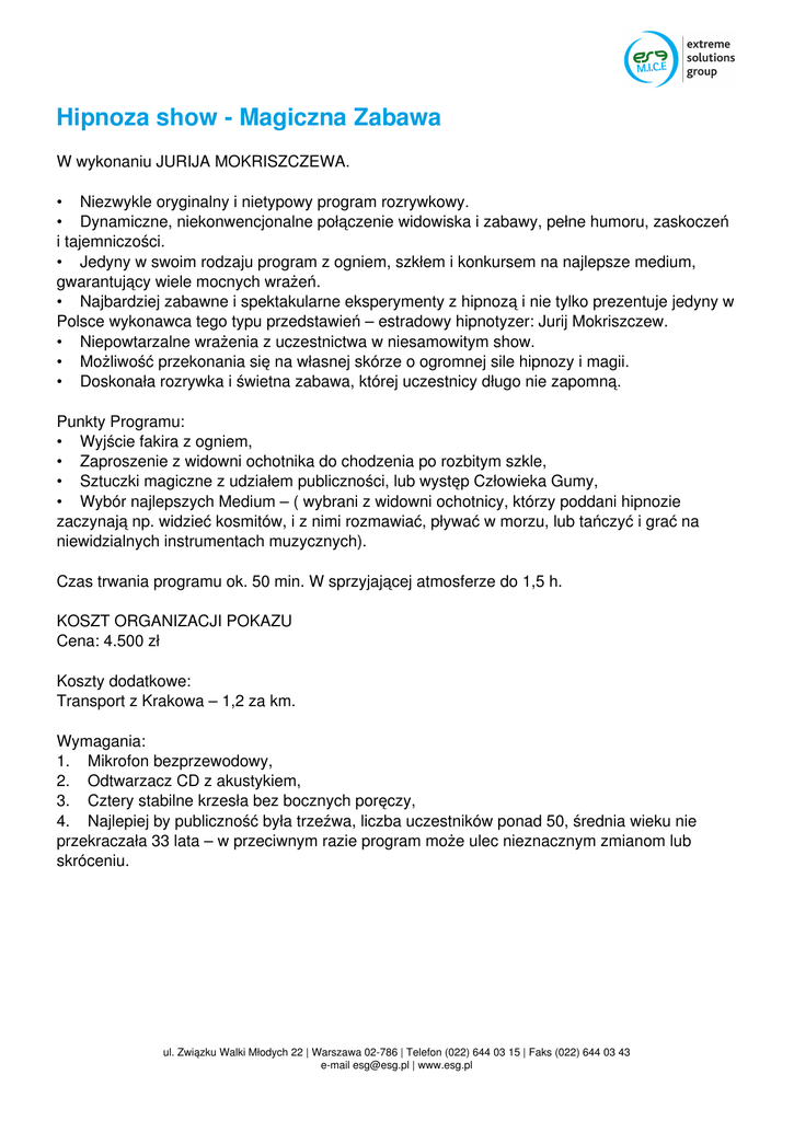 Hipnoza show - Magiczna Zabawa W wykonaniu JURIJA MOKRISZCZEWA. • Niezwykle oryginalny i nietypowy program rozrywkowy. • Dynamiczne, niekonwencjonalne połączenie widowiska i zabawy, pełne humoru, zaskoczeń i tajemniczości. • Jedyny w swoim rodzaju program z ogniem, szkłem i konkursem na najlepsze medium, gwarantujący wiele mocnych wrażeń. • Najbardziej zabawne i spektakularne eksperymenty z hipnozą i nie tylko prezentuje jedyny w Polsce wykonawca tego typu przedstawień – estradowy hipnotyzer: Jurij Mokriszczew. • Niepowtarzalne wrażenia z uczestnictwa w niesamowitym show. • Możliwość przekonania się na własnej skórze o ogromnej sile hipnozy i magii. • Doskonała rozrywka i świetna zabawa, której uczestnicy długo nie zapomną. Punkty Programu: • Wyjście fakira z ogniem, • Zaproszenie z widowni ochotnika do chodzenia po rozbitym szkle, • Sztuczki magiczne z udziałem publiczności, lub występ Człowieka Gumy, • Wybór najlepszych Medium – ( wybrani z widowni ochotnicy, którzy poddani hipnozie zaczynają np. widzieć kosmitów, i z nimi rozmawiać, pływać w morzu, lub tańczyć i grać na niewidzialnych instrumentach muzycznych). Czas trwania programu ok. 50 min. W sprzyjającej atmosferze do 1,5 h. KOSZT ORGANIZACJI POKAZU Cena: 4.500 zł Koszty dodatkowe: Transport z Krakowa – 1,2 za km. Wymagania: 1. Mikrofon bezprzewodowy, 2. Odtwarzacz CD z akustykiem, 3. Cztery stabilne krzesła bez bocznych poręczy, 4. Najlepiej by publiczność była trzeźwa, liczba uczestników ponad 50, średnia wieku nie przekraczała 33 lata – w przeciwnym razie program może ulec nieznacznym zmianom lub skróceniu. ul. Związku Walki Młodych 22 | Warszawa 02-786 | Telefon (022) 644 03 15 | Faks (022) 644 03 43 e-mail [email protected] | www.esg.pl ul. Związku Walki Młodych 22 | Warszawa 02-786 | Telefon (022) 644 03 15 | Faks (022) 644 03 43 e-mail [email protected] | www.esg.pl Powered by TCPDF (www.tcpdf.org)