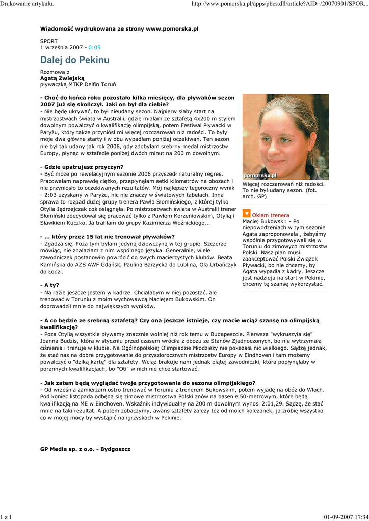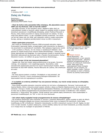 Drukowanie artykułu. 1z1 http://www.pomorska.pl/apps/pbcs.dll/article?AID=/20070901/SPOR... Wiadomość wydrukowana ze strony www.pomorska.pl SPORT 1 września 2007 - 0:05 Dalej do Pekinu Rozmowa z Agatą Zwiejską pływaczką MTKP Delfin Toruń. - Choć do końca roku pozostało kilka miesięcy, dla pływaków sezon 2007 juŜ się skończył. Jaki on był dla ciebie? - Nie będę ukrywać, to był nieudany sezon. Najpierw słaby start na mistrzostwach świata w Australii, gdzie miałam ze sztafetą 4x200 m stylem dowolnym powalczyć o kwalifikację olimpijską, potem Festiwal Pływacki w ParyŜu, który takŜe przyniósł mi więcej rozczarowań niŜ radości. To były moje dwa główne starty i w obu wypadłam poniŜej oczekiwań. Ten sezon nie był tak udany jak rok 2006, gdy zdobyłam srebrny medal mistrzostw Europy, płynąc w sztafecie poniŜej dwóch minut na 200 m dowolnym. - Gdzie upatrujesz przyczyn? - Być moŜe po rewelacyjnym sezonie 2006 przyszedł naturalny regres. Pracowałam naprawdę cięŜko, przepłynęłam setki kilometrów na obozach i nie przyniosło to oczekiwanych rezultatów. Mój najlepszy tegoroczny wynik - 2:03 uzyskany w ParyŜu, nic nie znaczy w światowych tabelach. Inna sprawa to rozpad duŜej grupy trenera Pawła Słomińskiego, z której tylko Otylia Jędrzejczak coś osiągnęła. Po mistrzostwach świata w Australii trener Słomiński zdecydował się pracować tylko z Pawłem Korzeniowskim, Otylią i Sławkiem Kuczko. Ja trafiłam do grupy Kazimierza Woźnickiego... - ... który przez 15 lat nie trenował pływaków? - Zgadza się. Poza tym byłam jedyną dziewczyną w tej grupie. Szczerze mówiąc, nie znalazłam z nim wspólnego języka. Generalnie, wiele zawodniczek postanowiło powrócić do swych macierzystych klubów. Beata Kamińska do AZS AWF Gdańsk, Paulina Barzycka do Lublina, Ola Urbańczyk do Łodzi. - A ty? - Na razie jeszcze jestem w kadrze. Chciałabym w niej pozostać, ale trenować w Toruniu z moim wychowawcą Maciejem Bukowskim. On doprowadził mnie do największych wyników. Więcej rozczarowań niŜ radości. To nie był udany sezon. (fot. arch. GP) Okiem trenera Maciej Bukowski: - Po niepowodzeniach w tym sezonie Agata zaproponowała , Ŝebyśmy wspólnie przygotowywali się w Toruniu do zimowych mistrzostw Polski. Nasz plan musi zaakceptować Polski Związek Pływacki, bo nie chcemy, by Agata wypadła z kadry. Jeszcze jest nadzieja na start w Pekinie, chcemy tę szansę wykorzystać. - A co będzie ze srebrną sztafetą? Czy ona jeszcze istnieje, czy macie wciąŜ szansę na olimpijską kwalifikację? - Poza Otylią wszystkie pływamy znacznie wolniej niŜ rok temu w Budapeszcie. Pierwsza "wykruszyła się" Joanna Budzis, która w styczniu przed czasem wróciła z obozu ze Stanów Zjednoczonych, bo nie wytrzymała ciśnienia i trenuje w klubie. Na Ogólnopolskiej Olimpiadzie MłodzieŜy nie pokazała nic wielkiego. Sądzę jednak, Ŝe stać nas na dobre przygotowanie do przyszłorocznych mistrzostw Europy w Eindhoven i tam moŜemy powalczyć o "dziką kartę" dla sztafety. WciąŜ brakuje nam jednak piątej zawodniczki, która popłynęłaby w porannych kwalifikacjach, bo "Oti" w nich nie chce startować. - Jak zatem będą wyglądać twoje przygotowania do sezonu olimpijskiego? - Od września zamierzam ostro trenować w Toruniu z trenerem Bukowskim, potem wyjadę na obóz do Włoch. Pod koniec listopada odbędą się zimowe mistrzostwa Polski znów na basenie 50-metrowym, które będą kwalifikacją na ME w Eindhoven. Wskaźnik indywidualny na 200 m dowolnym wynosi 2:01,29. Sądzę, Ŝe stać mnie na taki rezultat. A potem zobaczymy, awans sztafety zaleŜy teŜ od moich koleŜanek, ja zrobię wszystko co w mojej mocy by wystąpić na igrzyskach w Pekinie. GP Media sp. z o.o. - Bydgoszcz 01-09-2007 17:34