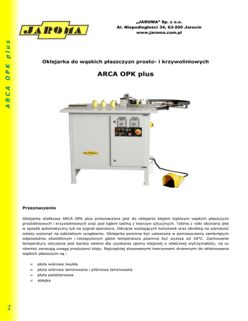 plus „JAROMA” Sp. z o.o. Al. Niepodległości 34, 63-200 Jarocin www.jaroma.com.pl OPK Oklejarka do wąskich płaszczyzn prosto- i krzywoliniowych ARCA ARCA OPK plus Przeznaczenie Oklejarka stolikowa ARCA OPK plus przeznaczona jest do oklejania klejem topliwym wąskich płaszczyzn prostoliniowych i krzywoliniowych oraz pod kątem taśmą z tworzyw sztucznych. Taśma z rolki obcinana jest w sposób automatyczny lub na sygnał operatora. Odcięcie wystających końcówek oraz obróbkę na szerokość należy wykonać na oddzielnym urządzeniu. Oklejarka powinna być ustawiona w pomieszczeniu zamkniętym odpowiednio oświetlonym i niezapylonym gdzie temperatura powinna być wyższa od 18°C. Zachowanie temperatury otoczenia jest bardzo istotne dla uzyskania spoiny klejowej o właściwej wytrzymałości, na co również zwracają uwagę producenci kleju. Najczęściej stosowanymi tworzywami drzewnymi do okleinowania wąskich płaszczyzn są : • • • • 1 płyta wiórowa zwykła płyta wiórowa laminowana i pilśniowa laminowana płyta paździerzowa sklejka ARCA OPK plus Powierzchnie wąskich płaszczyzn elementów z drewna i z tworzyw drzewnych przeznaczonych do okleinowania standotronem powinny spełniać następujące wymagania : • • płaszczyzna rzazu po obróbce skrawania powinna być gładka i prostopadła do szerokości elementów • odchyłki na grubość nie większe jak ±0,2mm, a kąta nie większe jak ±0,05mm. płaszczyzna nie powinna posiadać śladów wyrwań na krawędziach, nie powinny być na niej widoczne ślady przypaleń po obróbce narzędziami, zanieczyszczeń pyłem, tłuszczem itp. Oklejanie prostych elementów wykonuje się na listwach umocowanych na stole. Oklejanie elementów krzywoliniowych wykonuje się na podkładce umocowanej na stole lub do elementu obrabianego. Kształt podkładki uzależniony jest od kształtu oklejanego elementu. Szczegółowe dane techniczne: Parametr Jednostki Wymiar Minimalna szerokość obrabianych elementów dla posuwu ręcznego mm 50 Minimalna długość obrabianych elementów w układzie obcinania nożnego mm 120 Minimalna długość obrabianych elementów dla posuwu ręcznego w układzie obcinania automatycznego mm 200 Minimalna długość obrabianych elementów dla posuwu ręcznego w układzie obcinania nożnego mm 120 mm mm 1000 1700 Maksymalna szerokość obrabianych elementów (wynikająca z szerokości stołu roboczego) mm 400 Grubość obrabianych elementów mm 10 ÷ 60 Grubość obrzeża min. - maks. mm 0,3 - 3 PCV Minimalny promień wewnętrzny elementu krzywoliniowego (największa głębokość krzywizny) mm 50 Maksymalna długość elementu: - dla wersji podstawowej - dla wersji ze stolikami bocznymi (w przypadku obróbki elementów dłuższych niż 1000 mm (1700mm) wymagane jest stosowanie dodatkowych podpór zarówno od strony wprowadzania jak i od strony odbiorczej) Posuw (wersja standard) Prędkość posuwu wynikająca z obrotów rolki dociskowej m/min 4 Napięcie zasilania VAC 3x400 +/- 10%, 50Hz Zapotrzebowanie mocy kW 1,2 Ciśnienie robocze sprężonego powietrza MPa 0,6 Zapotrzebowanie sprężonego powietrza l/min 32 mm 1440 x 1240 x 1025 1770 x 1240 x 1025 kg ~180 ~190 Wymiary gabarytowe: - długość x szerokość x wysokość: - wersja podstawowa - wersja ze stolikami bocznymi Masa obrabiarki: - wersja podstawowa - wersja ze stolikami bocznymi 2 ręczny