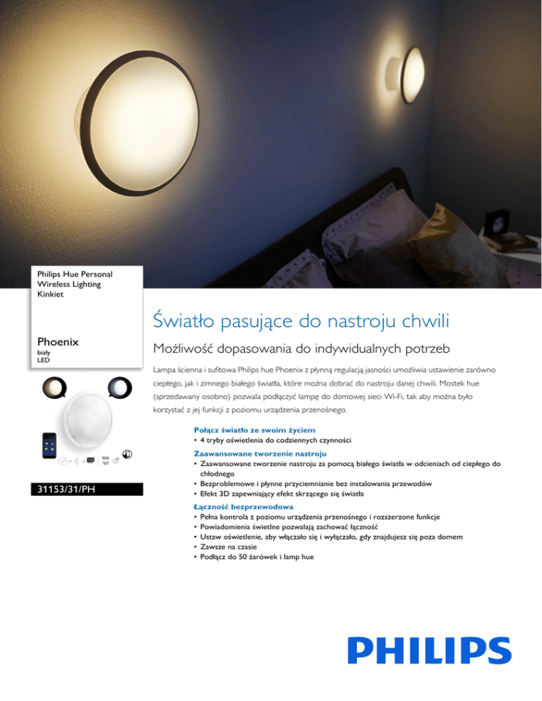 Philips Hue Personal Wireless Lighting Kinkiet Światło pasujące do nastroju chwili Phoenix biały LED Możliwość dopasowania do indywidualnych potrzeb Lampa ścienna i sufitowa Philips hue Phoenix z płynną regulacją jasności umożliwia ustawienie zarówno ciepłego, jak i zimnego białego światła, które można dobrać do nastroju danej chwili. Mostek hue (sprzedawany osobno) pozwala podłączyć lampę do domowej sieci Wi-Fi, tak aby można było korzystać z jej funkcji z poziomu urządzenia przenośnego. Połącz światło ze swoim życiem • 4 tryby oświetlenia do codziennych czynności 31153/31/PH Zaawansowane tworzenie nastroju • Zaawansowane tworzenie nastroju za pomocą białego światła w odcieniach od ciepłego do chłodnego • Bezproblemowe i płynne przyciemnianie bez instalowania przewodów • Efekt 3D zapewniający efekt skrzącego się światła Łączność bezprzewodowa • Pełna kontrola z poziomu urządzenia przenośnego i rozszerzone funkcje • Powiadomienia świetlne pozwalają zachować łączność • Ustaw oświetlenie, aby włączało się i wyłączało, gdy znajdujesz się poza domem • Zawsze na czasie • Podłącz do 50 żarówek i lamp hue 3115331PH Kinkiet Phoenix biały, LED Zalety 4 tryby oświetlenia Korzystaj z najlepszego oświetlenia niezależnie od tego, co robisz. Lampa Philips hue zapewnia najlepsze światło do codziennych czynności dzięki 4 trybom. „Energia” dodaje entuzjazmu, otaczając użytkownika chłodnym, jaskrawym światłem. „Koncentracja” wspomaga skupienie i przyspiesza pracę dzięki odpowiednio dostosowanemu, jasnemu białemu światłu. „Czytanie” zapewnia optymalne ciepłe światło, które nie męczy oczu — idealne podczas lektury. „Relaks” pomaga się odprężyć dzięki emisji ciepłego białego światła o delikatnym blasku. Płynne bezprzewodowe przyciemnianie Łatwo i płynnie dostosuj jasność oświetlenia Philips hue za pomocą urządzenia przenośnego. Nie ma potrzeby instalowania przewodów ani ściennego regulatora przyciemniania. Efekt 3D zapewniający skrzące się światło Sterowanie za pośrednictwem urządzenia przenośnego Podłącz lampę Philips hue do mostka hue i odkryj pełną gamę możliwości w zakresie oświetlenia. Steruj bezprzewodowo lampą hue za pomocą dowolnego urządzenia z systemem iOS lub Android, korzystając z aplikacji Philips hue lub opracowanej przez inną firmę aplikacji do obsługi systemu hue. Ustawiaj wyłączniki czasowe, powiadomienia, alarmy oraz rozwiązania typu geofencing w celu ochrony oprogramowania. Wreszcie zsynchronizuj je ze sprzętem audio-wideo, aby korzystać ze wszystkich możliwości systemu hue. Wyłączniki czasowe i powiadomienia świetlne Wszystkie odcienie białego światła Stwórz nastrój odpowiedni do danej chwili dzięki lampom emitującym piękne, naturalne światło LED. Skorzystaj z aplikacji w urządzeniu przenośnym, aby wybrać dowolny odcień białego światła — od chłodnego, pobudzającego światła dziennego (6500 K) aż po ciepłe, relaksujące białe światło (2200 K). Oświetlenie hue Phoenix ma trójwymiarową fakturę, która poprawia jego wygląd i zapewnia łagodne, rozproszone światło. Powierzchnia lampy jest pokryta sześciokątnym wzorem, który chwyta i odbija światło, dzięki czemu tworzy efekt skrzącego się światła. Efekt zmienia się w zależności od kąta patrzenia, dzięki czemu lampa hue Phoenix stanowi dynamiczny i atrakcyjny element dekoracji domu — nawet wtedy, gdy światło jest wyłączone. Można ustawić oświetlenie Philips hue tak, aby informowało o połączeniach przychodzących, wiadomościach, aktualizacjach w serwisach społecznościowych, pogodzie i innych komunikatach odbieranych przez urządzenie przenośne. Korzystając z platformy IFTTT, można ustawić różne zachowania elementów oświetlenia. Dyskretne powiadomienia oświetlenia hue stanowią przyjemny sposób informowania użytkowników, aby mogli być na bieżąco. 3115331PH Kinkiet Phoenix biały, LED Dane techniczne Stylistyka i wykończenie • Materiał: syntetyk, metal • Kolor: biały Wymiary i waga produktu • • • • Wysokość: 14,8 cm Długość: 30 cm Szerokość: 30 cm Waga netto: 1,500 kg • LED • Wbudowane źródło światła LED • Współczynnik IP: IP20, ochrona przed przedmiotami powyżej 12,5 mm, brak ochrony przed wodą • Klasa ochronności: I — uziemienie Serwis • Gwarancja: 2 lata Dane techniczne • Zasilanie sieciowe: Przedział 220–240 V, 50–60 Hz • Technologia źródła światła: LED, Bezpieczne, bardzo niskie napięcie • Liczba źródeł światła: 1 • Moc źródła światła w zestawie: 9 W • Maksymalna moc wymiennego źródła światła: 10 W • Barwa światła: ciepła biel • Maksymalna trwałość źródła światła: 20 000 godz. • Oprawa z możliwością przyciemniania Wymiary i waga opakowania • • • • Wysokość: 37,6 cm Długość: 33,8 cm Szerokość: 19,8 cm Waga: 2,200 kg Różne • Opracowano z myślą o: Salon i sypialnia, Gabinet • Styl: Nowoczesne • Typ: Kinkiet • Data wydania 2015-06-12 © 2015 Koninklijke Philips N.V. Wszelkie prawa zastrzeżone. Wersja: 3.0.1 Dane techniczne mogą ulec zmianie bez powiadomienia. Znaki towarowe są własnością Koninklijke Philips N.V. lub własnością odpowiednich firm. 12 NC: 9150 050 48301 EAN: 87 18696 12653 0 www.philips.com