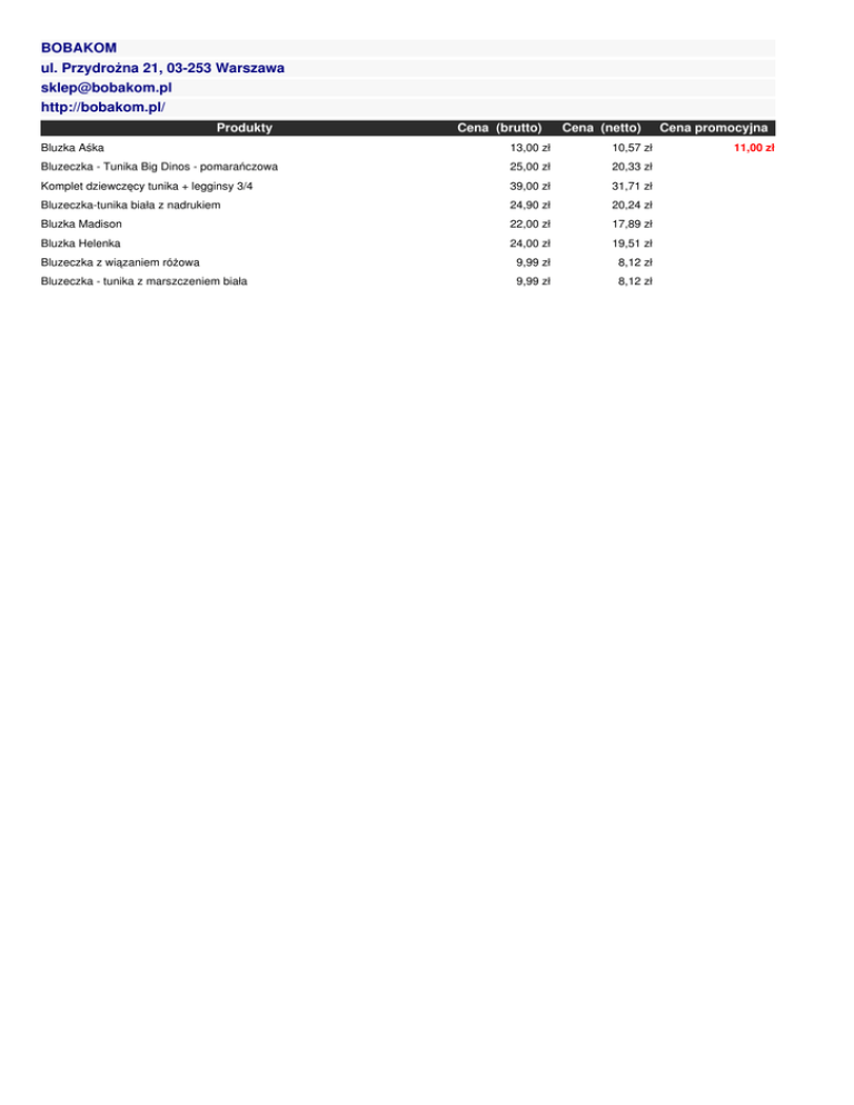 BOBAKOM ul. Przydrożna 21, 03-253 Warszawa [email protected] http://bobakom.pl/ Produkty Cena (brutto) Cena (netto) Bluzka Aśka 13,00 zł 10,57 zł Bluzeczka - Tunika Big Dinos - pomarańczowa 25,00 zł 20,33 zł Komplet dziewczęcy tunika + legginsy 3/4 39,00 zł 31,71 zł Bluzeczka-tunika biała z nadrukiem 24,90 zł 20,24 zł Bluzka Madison 22,00 zł 17,89 zł Bluzka Helenka 24,00 zł 19,51 zł Bluzeczka z wiązaniem różowa 9,99 zł 8,12 zł Bluzeczka - tunika z marszczeniem biała 9,99 zł 8,12 zł Cena promocyjna 11,00 zł