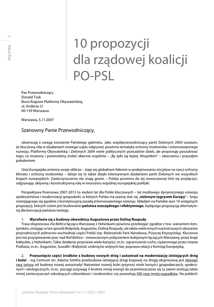 POLITYKA 10 propozycji dla rządowej koalicji PO-PSL Pan Przewodniczący Donald Tusk Biuro Krajowe Platformy Obywatelskiej, ul. Andersa 21 00-159 Warszawa Warszawa, 5.11.2007 Szanowny Panie Przewodniczący, obserwuję z uwagą tworzenie Pańskiego gabinetu. Jako współprzewodniczący partii Zielonych 2004 uważam, że kluczową rolę w działaniach nowego rządu odgrywać powinna tematyka ochrony środowiska i zrównoważonego rozwoju. Platformę Obywatelską i Zielonych 2004 wiele politycznych postulatów dzieli, ale proponuję poszukiwać tego, co możemy i powinniśmy zrobić obecnie wspólnie – „By żyło się lepiej. Wszystkim” – obecnemu i przyszłym pokoleniom. Unia Europejska zmienia swoje oblicze – staje się globalnym liderem w podejmowaniu inicjatyw na rzecz ochrony klimatu i ochrony środowiska – dzieje się to także dzięki intensywnym działaniom partii Zielonych we wszystkich krajach europejskich. Zanieczyszczenia nie znają granic – Polska powinna do tej nowoczesnej Unii się przyłączyć, odgrywając aktywną i konstruktywną rolę w tworzeniu wspólnej europejskiej polityki. Perspektywa finansowa 2007-2013 to siedem lat dla Polski kluczowych – lat możliwego dynamicznego rozwoju społeczeństwa i modernizacji gospodarki, w których Polska ma szansę stać się „zielonym tygrysem Europy” – kraju rozwijającego się zgodnie z konstytucyjną zasadą zrównoważonego rozwoju. Składam na Pańskie ręce 10 wstępnych propozycji, których celem jest budowanie państwa oszczędnego i efektywnego, będącego propozycją alternatywną dla koncepcji państwa taniego. 1. Wycofanie się z budowy obwodnicy Augustowa przez Dolinę Rospudy Trasa ekspresowa Via Baltica łącząca Warszawę z Helsinkami powinna przebiegać zgodnie z tzw. wariantem łomżyńskim, omijając w ten sposób Białystok, Augustów, Dolinę Rospudy, ale także wiele innych wartościowych obszarów przyrodniczych północno-wschodniej części Polski (np. Biebrzański Park Narodowy, Puszczę Knyszyńską). Kluczowe jest też przyspieszenie prac nad Rail Baltica – nowoczesnym połączeniem kolejowym łączącym Warszawę, przez kraje bałtyckie, z Helsinkami. Takie działanie przyniesie wiele korzyści, m.in.: ograniczenie ruchu ciężarowego przez miasta Podlasia, m.in.: Augustów, Suwałki i Białystok; uniknięcie unijnych kar; poprawa relacji z Komisją Europejską. 2. Przesunięcie części środków z budowy nowych dróg i autostrad na modernizację istniejących dróg i kolei – wg Centrum im. Adama Smitha przebudowa istniejącej drogi krajowej na drogę ekspresową jest dziesięć razy tańsza od budowy nowej autostrady! Natomiast rozwój kolei przynosi wiele korzyści gospodarczych, społecznych i ekologicznych, m.in.: pociągi zużywają 5-krotnie mniej energii do przemieszczania się (a zatem emitują także mniej zanieczyszczeń szkodzących człowiekowi i środowisku) czy powodują 500 razy mniej wypadków. Na polskich „Zielone Brygady. Pismo Ekologów” nr 11 (232) / 2007 POLITYKA fot. www.sxc.hu drogach ginie co roku około 5000 osób – szybka modernizacja kolei, możliwa dzięki środkom z Unii Europejskiej, zapobiegnie tym niepotrzebnym tragediom w przyszłości, ale też, o czym nie możemy zapominać, przyniesie ogromne oszczędności w wydatkach na ochronę zdrowia. 3. Wsparcie rozwoju kontenerowego ciężarowego transportu kolejowego, dzięki któremu część drogowego tranzytu ciężarowego przez Polskę zostanie przeniesiona na torowiska. Rozwiązanie to poprawi bezpieczeństwo na drogach, ograniczy ich niszczenie oraz zmniejszy hałas i emisje zanieczyszczeń. Zwiększenie udziału kolejowego transportu tranzytowego drastycznie zmniejszy koszty zewnętrzne (m.in. wypadki, zanieczyszczenie środowiska) transportu w Polsce. Koszty te, szacowane przez grupę konsultingową INFRAS w raporcie dla Organizacji Współpracy Gospodarczej i Rozwoju OECD, wynoszą ponad 50 miliardów złotych rocznie, co stanowi około 6% PKB. To oznaczałoby, że koszty zewnętrzne transportu w Polsce całkowicie niwelują wzrost gospodarczy! 4. Wycofanie z rynku żarówek konwencjonalnych (Edisona), które marnują 95% energii elektrycznej oraz wprowadzenie instrumentów ekonomicznych obniżających koszty nowoczesnego oświetlenia energooszczędnego, m.in.: zerowej stawki podatku VAT na żarówki diodowe i energooszczędne świetlówki kompaktowe; zamówień rządowych na sukcesywną wymianę oświetlenia na energooszczędne we wszystkich budynkach publicznych. Te działania wpłyną na dodatkowe obniżenie cen oświetlenia energooszczędnego, zwiększając na nie popyt. W ten sposób możliwe jest zmniejszenie zużycia energii w Polsce o co najmniej 1000-2000 MW, czyli wielkość równą mocy jednego do trzech bloków elektrowni. Zaoszczędzona energia to pełniejsze kieszenie Polek i Polaków. 5. Przyjęcie Krajowego Programu Energooszczędności zgodnego z propozycjami z Zielonej Księgi Efektywności Energetycznej UE, powtórzonych w Dyrektywie 2006/32/WE o Efektywności Energetycznej, obejmującego m.in.: • System Białych Certyfikatów (na poziomie 3% całkowitego kosztu energii); • System Dobrowolnych Zobowiązań (na poziomie 0,5% całkowitego kosztu energii); • Krajowy Fundusz Efektywności Energetycznej obejmujący m.in. termomodernizację budynków oraz poprawę „Zielone Brygady. Pismo Ekologów” nr 11 (232) / 2007 POLITYKA efektywności energetycznej gospodarki komunalnej i administracji publicznej (na poziomie 2% całkowitego kosztu energii); • Ulgi podatkowe dla urządzeń, produktów i usług energooszczędnych. 6. Wycofanie się z projektów budowy elektrowni jądrowej w Ignalinie na Litwie oraz budowy elektrowni jądrowej w Polsce – moc 1000-megawatowego bloku jądrowego można uzyskać 100 razy taniej poprzez oszczędzanie energii zużywanej np. do oświetlenia: wymiana 20 – 40 milionów żarówek na energooszczędne przyniesie jednorazową oszcz