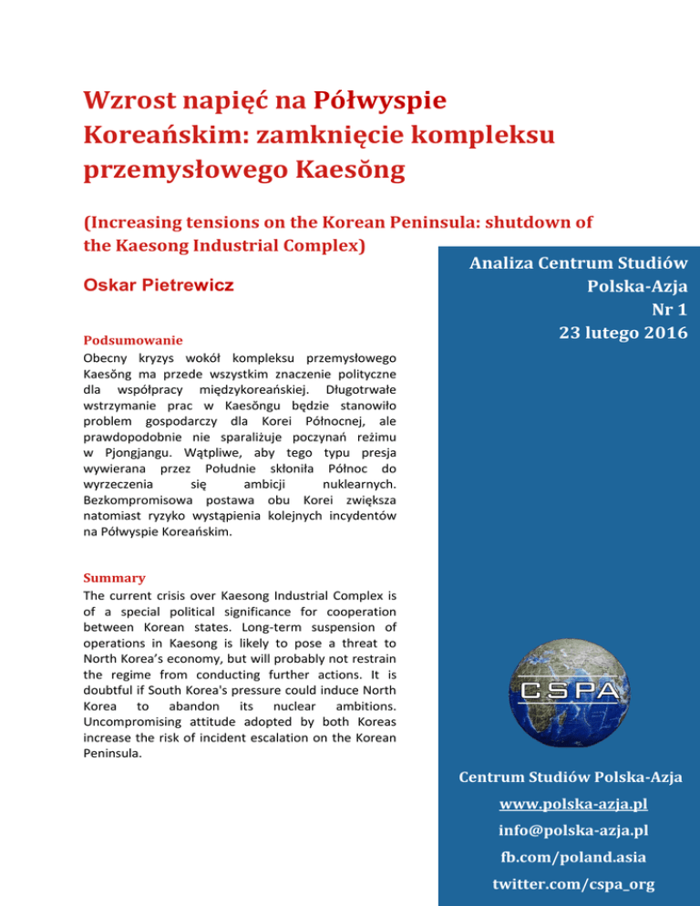 Wzrost napięć na Półwyspie Koreańskim: zamknięcie kompleksu przemysłowego Kaesŏng (Increasing tensions on the Korean Peninsula: shutdown of the Kaesong Industrial Complex) Analiza Centrum Studiów Oskar Pietrewicz Polska-Azja Nr 1 23 lutego 2016 Podsumowanie Obecny kryzys wokół kompleksu przemysłowego Kaesŏng ma przede wszystkim znaczenie polityczne dla współpracy międzykoreaoskiej. Długotrwałe wstrzymanie prac w Kaesŏngu będzie stanowiło problem gospodarczy dla Korei Północnej, ale prawdopodobnie nie sparaliżuje poczynao reżimu w Pjongjangu. Wątpliwe, aby tego typu presja wywierana przez Południe skłoniła Północ do wyrzeczenia się ambicji nuklearnych. Bezkompromisowa postawa obu Korei zwiększa natomiast ryzyko wystąpienia kolejnych incydentów na Półwyspie Koreaoskim. Summary The current crisis over Kaesong Industrial Complex is of a special political significance for cooperation between Korean states. Long-term suspension of operations in Kaesong is likely to pose a threat to North Korea’s economy, but will probably not restrain the regime from conducting further actions. It is doubtful if South Korea's pressure could induce North Korea to abandon its nuclear ambitions. Uncompromising attitude adopted by both Koreas increase the risk of incident escalation on the Korean Peninsula. Centrum Studiów Polska-Azja www.polska-azja.pl [email protected] fb.com/poland.asia twitter.com/cspa_org Wzrost napięd na Półwyspie Koreaoskim... Oskar Pietrewicz 10 lutego 2016 r. władze Korei Południowej ogłosiły decyzję o „kompletnym zamknięciu” obszaru przemysłowego Kaesŏng. W odpowiedzi na to Korea Północna usunęła ze strefy pozostałych obywateli południowokoreaoskich, zamroziła wszystkie aktywa, przywróciła kontrolę wojskową nad Kaesŏngiem oraz zerwała tzw. gorące linie komunikacji między paostwami koreaoskimi. Zamknięcie kompleksu przemysłowego ma przede wszystkim znaczenie polityczne dla współpracy międzykoreaoskiej. Długotrwałe wstrzymanie prac w Kaesŏngu będzie stanowiło problem gospodarczy dla Korei Północnej, ale prawdopodobnie nie sparaliżuje poczynao reżimu w Pjongjangu. Wątpliwe, aby tego typu presja wywierana przez Południe skłoniła Północ do wyrzeczenia się ambicji nuklearnych. Bezkompromisowa postawa obu Korei zwiększa natomiast ryzyko wystąpienia kolejnych incydentów na Półwyspie Koreaoskim. Zmiana polityki Park Geun-hye wobec Korei Północnej Decyzja o zamknięciu kompleksu przemysłowego Kaesŏng stanowiła odpowiedź Republiki Korei na ostatnie działania Koreaoskiej Republiki Ludowo-Demokratycznej: czwartą próbą nuklearną z 6 stycznia i test rakietowy z 7 lutego. Ze względu na impas decyzyjny na forum Rady Bezpieczeostwa ONZ oraz wyraźną niechęd Chin i Rosji do nałożenia poważniejszych sankcji na KRL-D władze Republiki Korei podjęły jednostronną decyzję. Może ona świadczyd o woli kształtowania sytuacji na Półwyspie Koreaoskim, a nie ograniczaniu się wyłącznie do biernego obserwowania poczynao innych stron. Zamknięcie Kaesŏngu to kolejny krok w ramach bardziej zdecydowanej postawy Republiki Korei wobec KRL-D. Po teście nuklearnym natychmiastowo wznowiono kampanię głośnikową na granicy, zaproponowano rozpoczęcie rozmów pięciostronnych (z pominięciem KRL-D) na temat północnokoreaoskiego programu nuklearnego oraz ogłoszono potrzebę rozpoczęcia negocjacji z USA na temat rozlokowania elementów rakietowego systemu antybalistycznego THAAD na terytorium Korei Południowej. Zamknięcie Kaesŏngu jest wyraźnym odwrotem od polityki, jaką administracja Park Geunhye promowała od początku swoich rządów (tzw. Trustpolitik). W trakcie kryzysu w 2013 r., kiedy Korea Północna wycofała swoich pracowników z kompleksu przemysłowego, władze w Seulu podjęły aktywne działania na rzecz wznowienia współpracy, do czego ostatecznie doszło po kilku miesiącach. Wówczas obie strony zobowiązały się do utrzymywania współpracy w Kaesŏngu niezależnie od bieżącej sytuacji politycznej na linii Pjongjang-Seul. Z tego punktu widzenia obecne posunięcia Południa należy traktowad jako wyraźną zmianę, gdyż po raz pierwszy Korea Południowa zdecydowała się na wstrzymanie prac we wspólnym kompleksie przemysłowym. Zwrot ten wynika z niepowodzeo dotychczasowej polityki i zaniepokojenia działaniami KRL-D. Zdecydowane posunięcia i stanowcza retoryka Park Geun-hye mogą tymczasowo zwiększyd poparcie południowokoreaoskiego społeczeostwa Centrum Studiów Polska-Azja ul. Nowy Świat 27 lok. 1, 00-029 Warszawa 2 Wzrost napięd na Półwyspie Koreaoskim... Oskar Pietrewicz dla środowiska politycznego prezydent1. Należy brad to pod uwagę w kontekście kwietniowych wyborów parlamentarnych oraz przyszłorocznej kampanii prezydenckiej. Znaczenie zamknięcia Kaesŏngu dla Korei Północnej i współpracy międzykoreaoskiej Południowokoreaoska decyzja w sprawie Kaesŏngu jest niekorzystną informacją z punktu widzenia KRL-D, która dzięki współpracy w strefie mogła liczyd przede wszystkim na regularny dopływ twardej waluty. Zgodnie z szacunkami południowokoreaoskiego Ministerstwa ds. Zjednoczenia, od 2004 r. Południe przekazało Północy 560 mln dol., w tym 120 mln dol. w samym 2015 r., na wypłaty dla północnokoreaoskich pracowników 2. Należy mied jednak świadomośd, że reżim w Pjongjangu wypłacał pensje swoim pracownikom nie w dolarach, lecz częściowo w bonach towarowych oraz północnokoreaoskich wonach i to po bardzo niekorzystnym kursie paostwowym (110 wonów za 1 dolara, a na czarnym rynku 8200 wonów za 1 dolara). To pozwoliło na zatrzymanie przez władze twardej waluty i wykorzystanie jej do innych celów. Mimo zarzutów Południa, które oskarża Północ o wykorzystywanie tych pieniędzy na finansowanie programów nuklearnego i rakietowego, nie przedstawiono wiarygodnych dowodów, które ukazywałyby skalę tego procederu3. Zgodnie z 