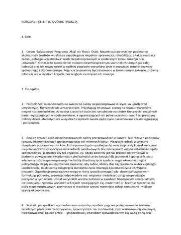 ROZDZIAŁ I. CELE, TŁO OGÓLNE I POJĘCIA 1. Cele. 1. Celem Światowego Programu Akcji na Rzecz Osób Niepełnosprawnych jest popieranie skutecznych środków w zakresie zapobiegania niepełno- sprawności, rehabilitacji, a także realizacji zadań „pełnego uczestnictwa” osób niepełnosprawnych w społecznym życiu i rozwoju oraz „równości”. Oznacza to zapewnienie osobom niepełnosprawnym szans takich samych jak całej ludności oraz ich równy udział w ogólnej poprawie warunków życia stanowiącej rezultat rozwoju społecznego i ekonomicznego. Poję- cia te powinny być stosowane w takim samym zakresie, z równą pilnością we wszystkich krajach, bez względu na stopień ich rozwoju. 2. Tło ogólne. 2. Przeszło 500 milionów ludzi na świecie to osoby niepełnosprawne w wyni- ku upośledzeń umysłowych, fizycznych lub sensorycznych. Przysługują im prawa i szansę na równi z wszystkimi innymi istotami ludzkimi. Aż nazbyt często ich życie jest utrudnione na skutek fizycznych i socjalnych barier występujących w społeczeństwie, a ograniczających ich pełne uczestnic- two. Z tej przyczyny miliony dzieci i dorosłych we wszystkich częściach świata pędzi życie nacechowane często segregacją i poniżeniem. 3. Analizę sytuacji osób niepełnosprawnych należy przeprowadzać w kontek- ście różnych poziomów rozwoju ekonomicznego i społecznego oraz od- miennych kultur. Wszędzie jednak ostateczny obowiązek poprawy warun- ków, które prowadzą do upośledzenia, oraz zajęcia się konsekwencjami niepełnosprawności spoczywa na władzach państwowych. Nie zmniejsza to odpowiedzialności ogółu społeczeństwa, jednostek czy też organiza- cji. Rządy powinny jednak przejąć kierownictwo w budzeniu powszechnej świadomości całej ludności co do korzyści dla jednostek i społeczeństwa z włączenia osób niepełnosprawnych w każdą dziedzinę życia społecz- nego, ekonomicznego i politycznego. Rządy muszą również zapewnić, aby ludzie, którzy stali się zależni na skutek ciężkiego upośledzenia, mieli szansę osiągnięcia standardu życia równego poziomowi życia ich współobywateli. Organizacje pozarządowe mogą w różny sposób pomagać wła- dzom państwowym – formułując potrzeby, sugerując odpowiednie roz- wiązania i świadcząc usługi uzupełniające poczynania tych władz. Udział wszystkich warstw ludności w zasobach finansowych i materialnych, nie pomijając regionów wiejskich w krajach rozwijających się, może mieć ol- brzymie znaczenie dla osób niepełnosprawnych, przynosząc w rezultacie szerzej rozwinięte usługi komunalne i większe szansę ekonomiczne. 4. W wielu przypadkach upośledzeniom można by zapobiec poprzez podej- mowanie środków zaradczych przeciwko niedożywieniu, zanieczyszcze- niu środowiska, złym warunkom higienicznym, nieodpowiedniej opiece przed – i poporodowej, chorobom spowodowanym złą wodą pitną oraz wszelkiego rodzaju wypadkom. Obejmując cały świat szerokim progra- mem szczepień ochronnych (immunizacji) społeczność międzynarodowa mogłaby dokonać przełomu w walce z takimi chorobami, jak polio (cho- roba Heinego-Medina), tężec, koklusz, błonica, oraz ograniczyć zasięg gruźlicy. 5. W wielu krajach wstępne warunki dla osiągnięcia celów niniejszego progra- mu obejmują rozwój społeczny i ekonomiczny, szerszy zakres usług o cha- rakterze humanitarnym świadczonych całej ludności, redystrybucję zaso- bów i dochodu oraz poprawę standardu życia ludności. Należy dokonać wszelkich starań, aby zapobiec wojnom prowadzącym do zniszczeń, ka- tastrof i nędzy, do głodu, cierpień i chorób, do masowego kalectwa ludzi, a zatem trzeba na wszystkich szczeblach sięgnąć po środki umacniające pokój i bezpieczeństwo międzynarodowe, załatwiać wszelkie spory międzynarodowe na drodze pokojowej i eliminować wszelkie formy rasizmu i dyskryminacji rasowej w tych krajach, w których dotąd jeszcze istnieją. Pożądane byłoby zalecić wszystkim krajom członkowskim Organizacji Na- rodów Zjednoczonych, aby zmaksymalizowały wykorzystywanie swoich zasobów na cele pokojowe, łącznie z zapobieganiem kalectwu i zaspoka- janiem potrzeb osób niepełnosprawnych. Wszelkie formy pomocy tech- nicznej, które ułatwiają krajom rozwijającym się przybliżenie do realizacji tych celów, mogą wesprzeć wprowadzanie w czyn naszego Programu. Realizacja tych zadań będzie jednak wymagać dłuższego okresu starań, pod- czas którego liczba osób niepełnosprawnych może ulec zwiększeniu. Bez skutecznej akcji zapobiegawczej konsekwencje niepełnosprawności będą dodawały przeszkód na drodze do rozwoju. Dlatego jest sprawą ważną, aby do swoich planów rozwoju ogólnego wszystkie narody włączyły bez- pośrednie środki: zapobiegania inwalidztwu, rehabilitacji osób niepełno- sprawnych i wyrównywania ich szans. 3. Definicje. 6. Światowa Organizacja Zdrowia, w kontekście doświadczeń ochrony zdro- wia dokonała następujących rozróżnień między pojęciami: ograniczenie, niepełnosprawność i upośledzenie: Ograniczenie (impairment): Wszelka utrata lub odstępstwo od normalności struktury lub funkcji psychologicznej, fizjologicznej lub anatomicznej. Niepełnosprawność (disability): Wszelkie ograniczenie lub brak – wynikający z ograniczenia – zdolności wykonywania jakiejś czynności w sposób lub w zakresie uważanym za normalny dla istoty ludzkiej. Upośledzenie (handicap): Niekorzystna dla danej jednostki sytuacja wynikająca z ograniczenia lub niepełnosprawności, która ogranicza lub przeszkadza w pełnieniu roli uznanej dla tej jednostki za normalną, w zależności od jej wieku, płci, czynników społecznych i kulturalnych”1. 7. Upośledzenie jest zatem funkcją stosunku pomiędzy osobami niepełno- sprawnymi a ich otoczeniem. Występuje ono wówczas, kiedy osoby te napotykają na kulturalne, fizyczne albo społeczne bariery, które ham