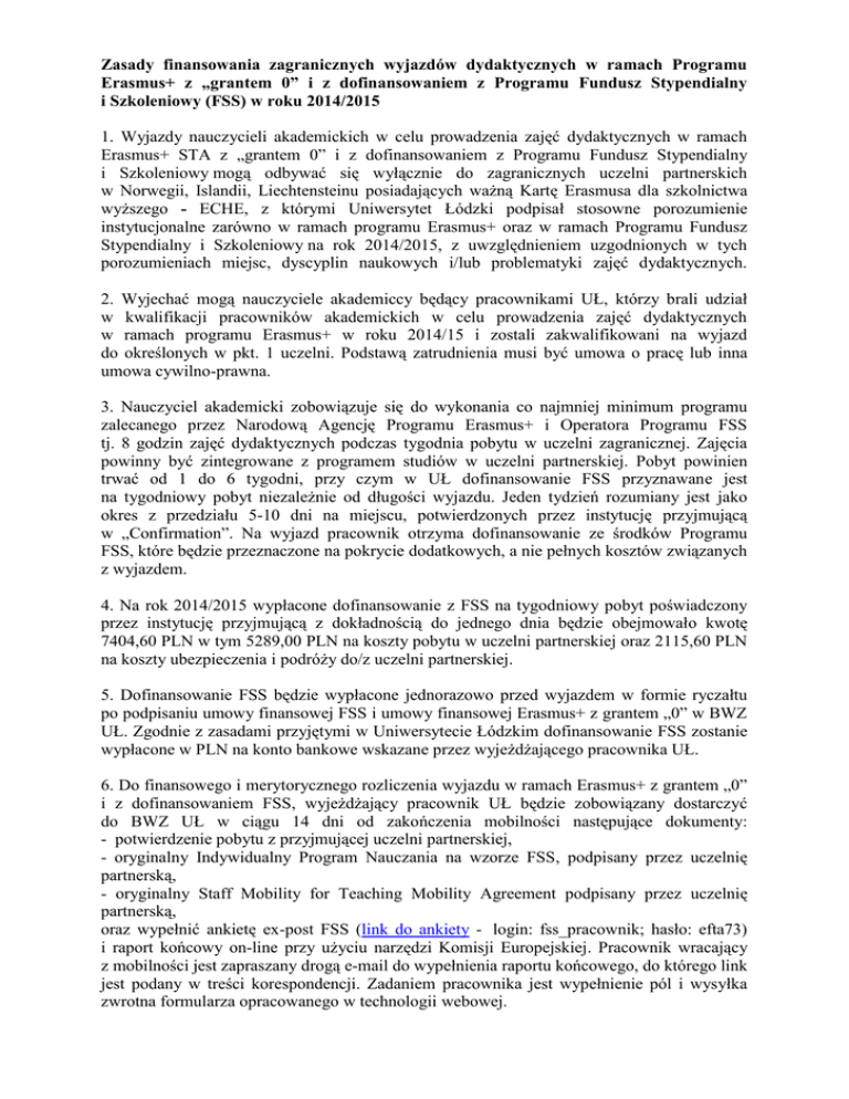 Zasady finansowania zagranicznych wyjazdów dydaktycznych w ramach Programu Erasmus+ z „grantem 0” i z dofinansowaniem z Programu Fundusz Stypendialny i Szkoleniowy (FSS) w roku 2014/2015 1. Wyjazdy nauczycieli akademickich w celu prowadzenia zajęć dydaktycznych w ramach Erasmus+ STA z „grantem 0” i z dofinansowaniem z Programu Fundusz Stypendialny i Szkoleniowy mogą odbywać się wyłącznie do zagranicznych uczelni partnerskich w Norwegii, Islandii, Liechtensteinu posiadających ważną Kartę Erasmusa dla szkolnictwa wyższego - ECHE, z którymi Uniwersytet Łódzki podpisał stosowne porozumienie instytucjonalne zarówno w ramach programu Erasmus+ oraz w ramach Programu Fundusz Stypendialny i Szkoleniowy na rok 2014/2015, z uwzględnieniem uzgodnionych w tych porozumieniach miejsc, dyscyplin naukowych i/lub problematyki zajęć dydaktycznych. 2. Wyjechać mogą nauczyciele akademiccy będący pracownikami UŁ, którzy brali udział w kwalifikacji pracowników akademickich w celu prowadzenia zajęć dydaktycznych w ramach programu Erasmus+ w roku 2014/15 i zostali zakwalifikowani na wyjazd do określonych w pkt. 1 uczelni. Podstawą zatrudnienia musi być umowa o pracę lub inna umowa cywilno-prawna. 3. Nauczyciel akademicki zobowiązuje się do wykonania co najmniej minimum programu zalecanego przez Narodową Agencję Programu Erasmus+ i Operatora Programu FSS tj. 8 godzin zajęć dydaktycznych podczas tygodnia pobytu w uczelni zagranicznej. Zajęcia powinny być zintegrowane z programem studiów w uczelni partnerskiej. Pobyt powinien trwać od 1 do 6 tygodni, przy czym w UŁ dofinansowanie FSS przyznawane jest na tygodniowy pobyt niezależnie od długości wyjazdu. Jeden tydzień rozumiany jest jako okres z przedziału 5-10 dni na miejscu, potwierdzonych przez instytucję przyjmującą w „Confirmation”. Na wyjazd pracownik otrzyma dofinansowanie ze środków Programu FSS, które będzie przeznaczone na pokrycie dodatkowych, a nie pełnych kosztów związanych z wyjazdem. 4. Na rok 2014/2015 wypłacone dofinansowanie z FSS na tygodniowy pobyt poświadczony przez instytucję przyjmującą z dokładnością do jednego dnia będzie obejmowało kwotę 7404,60 PLN w tym 5289,00 PLN na koszty pobytu w uczelni partnerskiej oraz 2115,60 PLN na koszty ubezpieczenia i podróży do/z uczelni partnerskiej. 5. Dofinansowanie FSS będzie wypłacone jednorazowo przed wyjazdem w formie ryczałtu po podpisaniu umowy finansowej FSS i umowy finansowej Erasmus+ z grantem „0” w BWZ UŁ. Zgodnie z zasadami przyjętymi w Uniwersytecie Łódzkim dofinansowanie FSS zostanie wypłacone w PLN na konto bankowe wskazane przez wyjeżdżającego pracownika UŁ. 6. Do finansowego i merytorycznego rozliczenia wyjazdu w ramach Erasmus+ z grantem „0” i z dofinansowaniem FSS, wyjeżdżający pracownik UŁ będzie zobowiązany dostarczyć do BWZ UŁ w ciągu 14 dni od zakończenia mobilności następujące dokumenty: - potwierdzenie pobytu z przyjmującej uczelni partnerskiej, - oryginalny Indywidualny Program Nauczania na wzorze FSS, podpisany przez uczelnię partnerską, - oryginalny Staff Mobility for Teaching Mobility Agreement podpisany przez uczelnię partnerską, oraz wypełnić ankietę ex-post FSS (link do ankiety - login: fss_pracownik; hasło: efta73) i raport końcowy on-line przy użyciu narzędzi Komisji Europejskiej. Pracownik wracający z mobilności jest zapraszany drogą e-mail do wypełnienia raportu końcowego, do którego link jest podany w treści korespondencji. Zadaniem pracownika jest wypełnienie pól i wysyłka zwrotna formularza opracowanego w technologii webowej. 7. Zakwalifikowanych nauczycieli akademickich na wyjazdy zagraniczne w celu prowadzenie zajęć dydaktycznych zobowiązuje się do niezwłocznego powiadomienia BWZ oraz koordynatora wydziałowego ds. programu Erasmus+ o decyzji rezygnacji z zaplanowanego wyjazdu w roku 2014/15. 8. Realizacja wyjazdów dydaktycznych w ramach Programu Erasmus+ z „grantem 0” i z dofinansowaniem z Programu Fundusz Stypendialny i Szkoleniowy (FSS) do uczelni określonych w pkt. 1 możliwa jest w okresie od 1 grudnia 2014r. do września 2015r., w czasie, kiedy w uczelniach zagranicznych prowadzone są zajęcia dydaktyczne. 9. W przypadku posiadania przez UŁ wolnych środków FSS na realizację wyjazdów w celu prowadzenie zajęć dydaktycznych, będą one mogły być wykorzystane na dodatkowe mobilności tylko do uczelni określonych w pkt. 1 lub dopłatę do czasu ponad tygodniowy pobyt, określony w pkt.3. 10. Powyższe zasady zatwierdził Prof. dr hab. Zofia Wysokińska. BWZ/01.10.2014 Prorektor ds. Współpracy z Zagranicą UŁ,