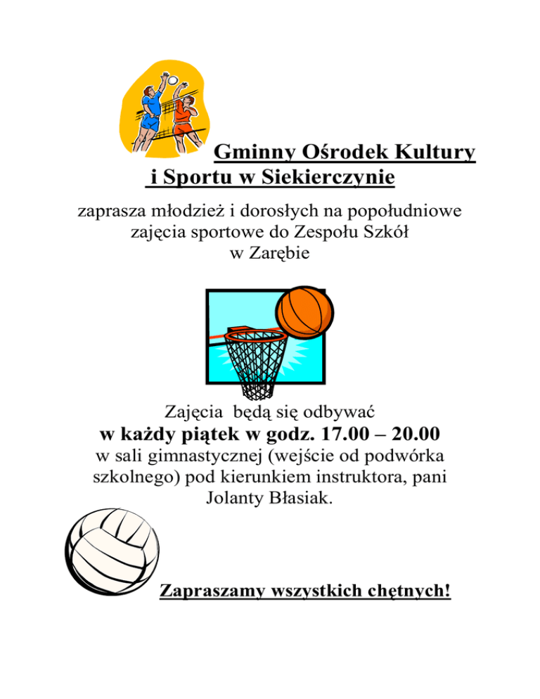 Gminny Ośrodek Kultury i Sportu w Siekierczynie zaprasza młodzież i dorosłych na popołudniowe zajęcia sportowe do Zespołu Szkół w Zarębie Zajęcia będą się odbywać w każdy piątek w godz. 17.00 – 20.00 w sali gimnastycznej (wejście od podwórka szkolnego) pod kierunkiem instruktora, pani Jolanty Błasiak. Zapraszamy wszystkich chętnych! Gminny Ośrodek Kultury i Sportu w Siekierczynie zaprasza młodzież i dorosłych na popołudniowe zajęcia sportowe do Zespołu Szkół w Siekierczynie Zajęcia będą się odbywać w każdy piątek w godz. 16.00 – 19.00 w sali gimnastycznej kierunkiem instruktora, pani Anny Mydłowskiej Zapraszamy wszystkich chętnych!