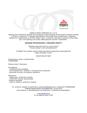 AGENCJA PRACY BEETSMA SP. Z O.O. Agencja pracy Beetsma zajmuje się rekrutacją i outsourcingiem pracowników różnego szczebla w Polsce i za granicą. Z naszego pośrednictwa korzystają firmy produkcyjne, usługowe, logistyczne rozlokowane na terenie całego kraju i za granicą. Oferujemy zarówno pracę stałą, jak i tymczasową oraz pracę wakacyjną dla uczniów i studentów. SZUKASZ ORYGINALNEJ I CIEKAWEJ PRACY? Stawiasz pierwsze kroki na rynku pracy? Chcesz zdobyć cenne doświadczenie? Chciałbyś być częścią znanej międzynarodowej organizacji pozarządowej? Lubisz pomagać innym? ZGŁOŚ SIĘ DO NAS! Poszukujemy osoby na stanowisko: FUNDRAISER Miejsce pracy: Warszawa Wymagania: - zainteresowanie ekologią - komunikatywność i łatwość w nawiązywaniu kontaktów - gotowość do pracy na świeżym powietrzu Oferujemy: - stałą pracę i atrakcyjne zarobki - możliwość rozwoju zawodowego -ciekawe szkolenia - pracę w młodym, ambitnym zespole CV prosimy wysyłać na adres [email protected] z dopiskiem FUNDRAISER TERMIN NADSYŁANIA DOKUMENTÓW: 30.06.2014 Informujemy, iż skontaktujemy się wyłącznie z wybranymi kandydatami. www.beetsma.pl Nr rej agencji pracy 5169