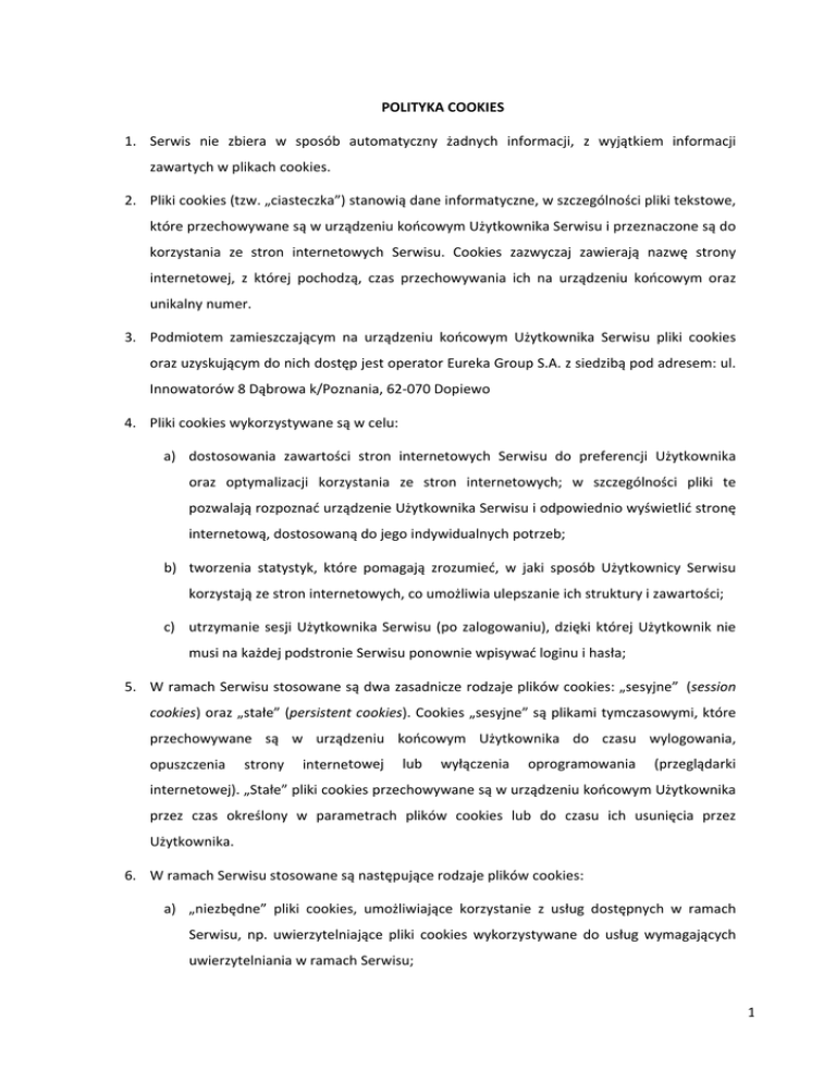 POLITYKA COOKIES 1. Serwis nie zbiera w sposób automatyczny żadnych informacji, z wyjątkiem informacji zawartych w plikach cookies. 2. Pliki cookies (tzw. „ciasteczka”) stanowią dane informatyczne, w szczególności pliki tekstowe, które przechowywane są w urządzeniu końcowym Użytkownika Serwisu i przeznaczone są do korzystania ze stron internetowych Serwisu. Cookies zazwyczaj zawierają nazwę strony internetowej, z której pochodzą, czas przechowywania ich na urządzeniu końcowym oraz unikalny numer. 3. Podmiotem zamieszczającym na urządzeniu końcowym Użytkownika Serwisu pliki cookies oraz uzyskującym do nich dostęp jest operator Eureka Group S.A. z siedzibą pod adresem: ul. Innowatorów 8 Dąbrowa k/Poznania, 62‐070 Dopiewo 4. Pliki cookies wykorzystywane są w celu: a) dostosowania zawartości stron internetowych Serwisu do preferencji Użytkownika oraz optymalizacji korzystania ze stron internetowych; w szczególności pliki te pozwalają rozpoznać urządzenie Użytkownika Serwisu i odpowiednio wyświetlić stronę internetową, dostosowaną do jego indywidualnych potrzeb; b) tworzenia statystyk, które pomagają zrozumieć, w jaki sposób Użytkownicy Serwisu korzystają ze stron internetowych, co umożliwia ulepszanie ich struktury i zawartości; c) utrzymanie sesji Użytkownika Serwisu (po zalogowaniu), dzięki której Użytkownik nie musi na każdej podstronie Serwisu ponownie wpisywać loginu i hasła; 5. W ramach Serwisu stosowane są dwa zasadnicze rodzaje plików cookies: „sesyjne” (session cookies) oraz „stałe” (persistent cookies). Cookies „sesyjne” są plikami tymczasowymi, które przechowywane są w urządzeniu końcowym Użytkownika do czasu wylogowania, opuszczenia strony internetowej lub wyłączenia oprogramowania (przeglądarki internetowej). „Stałe” pliki cookies przechowywane są w urządzeniu końcowym Użytkownika przez czas określony w parametrach plików cookies lub do czasu ich usunięcia przez Użytkownika. 6. W ramach Serwisu stosowane są następujące rodzaje plików cookies: a) „niezbędne” pliki cookies, umożliwiające korzystanie z usług dostępnych w ramach Serwisu, np. uwierzytelniające pliki cookies wykorzystywane do usług wymagających uwierzytelniania w ramach Serwisu; 1 b) pliki cookies służące do zapewnienia bezpieczeństwa, np. wykorzystywane do wykrywania nadużyć w zakresie uwierzytelniania w ramach Serwisu; c) „wydajnościowe” pliki cookies, umożliwiające zbieranie informacji o sposobie korzystania ze stron internetowych Serwisu; d) „funkcjonalne” pliki cookies, umożliwiające „zapamiętanie” wybranych przez Użytkownika ustawień i personalizację interfejsu Użytkownika, np. w zakresie wybranego języka lub regionu, z którego pochodzi Użytkownik, rozmiaru czcionki, wyglądu strony internetowej itp.; e) „reklamowe” pliki cookies, umożliwiające dostarczanie Użytkownikom treści reklamowych bardziej dostosowanych do ich zainteresowań. 7. W wielu przypadkach oprogramowanie służące do przeglądania stron internetowych (przeglądarka internetowa) domyślnie dopuszcza przechowywanie plików cookies w urządzeniu końcowym Użytkownika. Użytkownicy Serwisu mogą dokonać w każdym czasie zmiany ustawień dotyczących plików cookies. Ustawienia te mogą zostać zmienione w szczególności w taki sposób, aby blokować automatyczną obsługę plików cookies w ustawieniach przeglądarki internetowej bądź informować o ich każdorazowym zamieszczeniu w urządzeniu Użytkownika Serwisu. Szczegółowe informacje o możliwości i sposobach obsługi plików cookies dostępne są w ustawieniach oprogramowania (przeglądarki internetowej). 8. Operator Serwisu informuje, że ograniczenia stosowania plików cookies mogą wpłynąć na niektóre funkcjonalności dostępne na stronach internetowych Serwisu. 9. Pliki cookies zamieszczane w urządzeniu końcowym Użytkownika Serwisu i wykorzystywane mogą być również przez współpracujących z operatorem Serwisu reklamodawców oraz partnerów. 10. Więcej informacji na temat plików cookies dostępnych jest pod adresem www.eurekagroup.pl lub w sekcji „Pomoc” w menu przeglądarki internetowej. 2