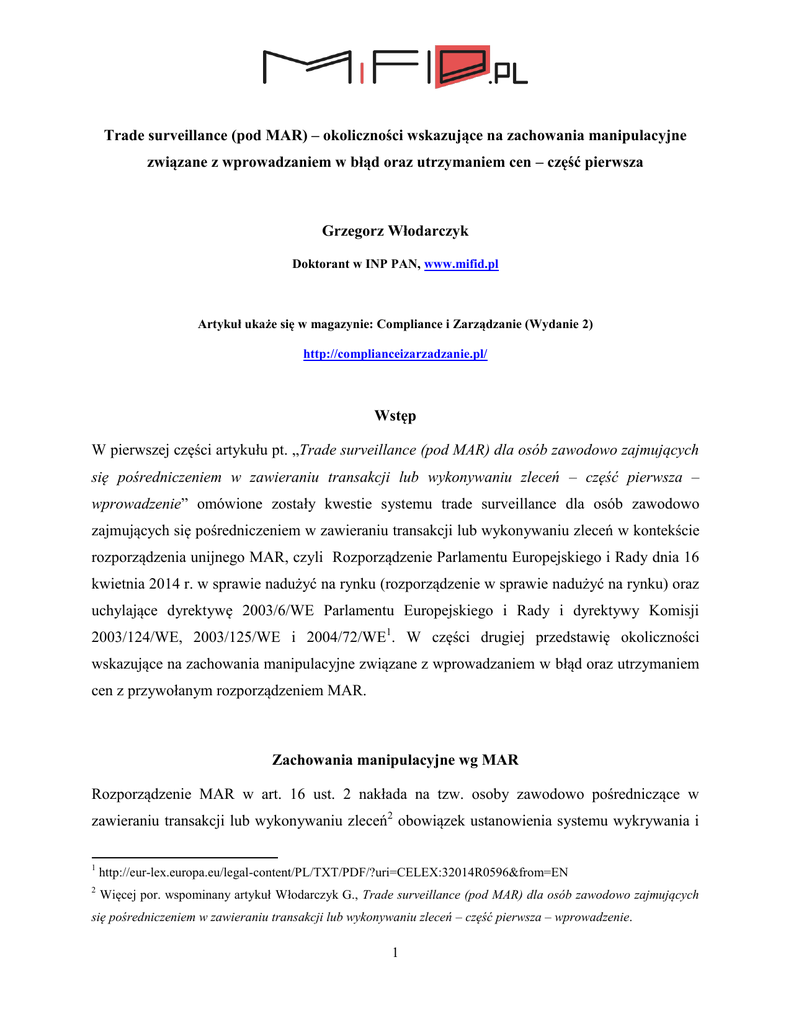 Trade surveillance (pod MAR) – okoliczności wskazujące na zachowania manipulacyjne związane z wprowadzaniem w błąd oraz utrzymaniem cen – część pierwsza Grzegorz Włodarczyk Doktorant w INP PAN, www.mifid.pl Artykuł ukaże się w magazynie: Compliance i Zarządzanie (Wydanie 2) http://complianceizarzadzanie.pl/ Wstęp W pierwszej części artykułu pt. „Trade surveillance (pod MAR) dla osób zawodowo zajmujących się pośredniczeniem w zawieraniu transakcji lub wykonywaniu zleceń – część pierwsza – wprowadzenie” omówione zostały kwestie systemu trade surveillance dla osób zawodowo zajmujących się pośredniczeniem w zawieraniu transakcji lub wykonywaniu zleceń w kontekście rozporządzenia unijnego MAR, czyli Rozporządzenie Parlamentu Europejskiego i Rady dnia 16 kwietnia 2014 r. w sprawie nadużyć na rynku (rozporządzenie w sprawie nadużyć na rynku) oraz uchylające dyrektywę 2003/6/WE Parlamentu Europejskiego i Rady i dyrektywy Komisji 2003/124/WE, 2003/125/WE i 2004/72/WE1. W części drugiej przedstawię okoliczności wskazujące na zachowania manipulacyjne związane z wprowadzaniem w błąd oraz utrzymaniem cen z przywołanym rozporządzeniem MAR. Zachowania manipulacyjne wg MAR Rozporządzenie MAR w art. 16 ust. 2 nakłada na tzw. osoby zawodowo pośredniczące w zawieraniu transakcji lub wykonywaniu zleceń2 obowiązek ustanowienia systemu wykrywania i 1 http://eur-lex.europa.eu/legal-content/PL/TXT/PDF/?uri=CELEX:32014R0596&from=EN 2 Więcej por. wspominany artykuł Włodarczyk G., Trade surveillance (pod MAR) dla osób zawodowo zajmujących się pośredniczeniem w zawieraniu transakcji lub wykonywaniu zleceń – część pierwsza – wprowadzenie. 1 powiadamiania o podejrzanych zleceniach i transakcjach. Jednocześnie art. 16 ust. 5 zawiera odwołanie do wydawanego przez Komisję Europejska rozporządzenia w którym określone zostaną właściwe rozwiązania, systemy i procedur dla przedmiotowych osób, tak aby przestrzegały one wymogów ustanowionych w Rozporządzeniu MAR. Rozporządzenie wykonawczym jest w tym przypadku Rozporządzenie Delegowane Komisji (UE) 2016/522 z dnia 17 grudnia 2015 r. uzupełniające rozporządzenie Parlamentu Europejskiego i Rady (UE) nr 596/2014 w kwestiach dotyczących wyłączenia niektórych organów publicznych i banków centralnych państw trzecich, okoliczności wskazujących na manipulację na rynku, progów powodujących powstanie obowiązku podania informacji do wiadomości publicznej, właściwych organów do celów powiadomień o opóźnieniach, zgody na obrót w okresach zamkniętych oraz rodzajów transakcji wykonywanych przez osoby pełniące obowiązki zarządcze podlegających obowiązkowi powiadomienia3 (dalej: Rozporządzenie Delegowane). Dodatkowo Rozporządzenie Delegowane bazuje na Załączniku I do Rozporządzenia MAR, który wskazuje na okoliczności wskazujące na zachowania manipulacyjne związane z wprowadzaniem w błąd oraz utrzymaniem cen oraz na okoliczności wskazujące na zachowania manipulacyjne związane ze stosowaniem fikcyjnych narzędzi lub innych form wprowadzania w błąd lub podstępu. Okoliczności wskazujące na zachowania manipulacyjne związane z wprowadzaniem w błąd oraz utrzymaniem cen Do najważniejszych okoliczności wskazujące na zachowania manipulacyjne związane z wprowadzaniem w błąd oraz utrzymaniem cen należą: 1. Colluding in the after-market of an Initial Public Offer – czyli tzw. zmowa na rynku wtórnym pierwszej oferty publicznej, które polega na kupnie (również przez strony będące w zmowie) instrumentu finansowego po alokacji na rynku pierwotnym w celu ustalenia cen na sztucznym poziomie i wywołania zainteresowania innych inwestorów. Zgodnie z wytycznymi CESR – Market Abuse Directive: Level 3 – First set of CESR guidance and information on the common operation of the Directive (dalej jako: 3 http://eur-lex.europa.eu/legal-content/PL/TXT/PDF/?uri=CELEX:32016R0522&from=PL 2 Wytyczne CESR 1) to zachowanie manipulacyjne jest powiązane z tzw. pierwszą ofertą publiczną4, czyli z tzw. IPO (Initial Public Ofrering), przede wszystkim akcji5. To zachowanie manipulacyjne powinny monitorować przede wszystkim domy maklerskie, w szczególności te, które organizują IPO dla emitentów. 2. Creation of a floor, or a ceiling in the price pattern – czyli tzw. tworzenie dolnego lub górnego pułapu wzorca ceny, czyli zachowanie manipulacyjne polegające na transakcji lub zleceniu zawarcia transakcji przeprowadzone w sposób stwarzający przeszkody dla instrumentu finansowego powodujące spadek cen poniżej pewnego poziomu lub wzrost tych cen powyżej pewnego poziomu głównie w celu uniknięcia negatywnych konsekwencji wynikających ze zmian ceny instrumentu finansowego. To zachowanie manipulacyjne często przeprowadzane jest przez spółki, np. w celu uniknięcia negatywnych konsekwencji, jak np. spadek ratingu spółki. 3. Ping orders – czyli tzw. zlecenia służące sondowaniu. Polega na wprowadzaniu małych zleceń zawarcia transakcji w celu ustalenia poziomu ukrytych zleceń, a w szczególności w celu dokonania oceny zleceń ukrytej płynności. To zachowanie manipulacyjne, jak sama nazwa wskazuje jest tzw. order-based scenario, czyli zachowaniem manipulacyjnym mającym zastosowanie do zleceń zawarcia transakcji, nie zaś do transakcji zawartych. Powinno być monitorowane przez domy maklerskie (co do zleceń na rynkach regulowanych np. rynek Giełdy Papierów Wartościowych w Warszawie S.A.), ale także pomocniczo i fakultatywnie przez banki (np. na rynkach typu Treasury Bondspot Poland). 4. Phishing – czyli wykonywanie zleceń zawarcia transakcji lub serii zleceń zawarcia transakcji w celu ujawnienia zleceń innych uczestników, a następnie wprowadzanie zlecenia zawarcia transakcji w celu wykorzystania przewagi z uzyskanych informacji. To zachowanie manipulacyjne, podobnie jak powyższe, jak sama nazwa wskazuje jest tzw. order-bas