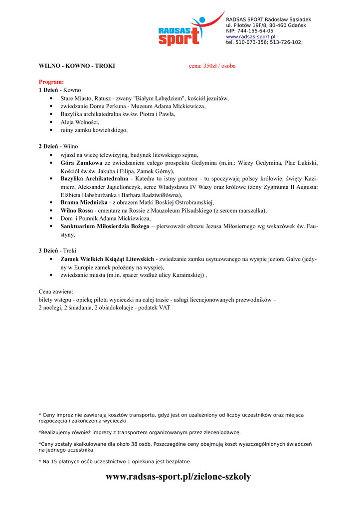 RADSAS SPORT Radosław Sąsiadek ul. Pilotów 19F/8, 80-460 Gdańsk NIP: 744-155-64-05 www.radsas-sport.pl tel. 510-073-356; 513-726-102; WILNO - KOWNO - TROKI cena: 350zł / osoba Program: 1 Dzień - Kowno Stare Miasto, Ratusz - zwany "Białym Łabędziem", kościół jezuitów, zwiedzanie Domu Perkuna - Muzeum Adama Mickiewicza, Bazylika archikatedralna św.św. Piotra i Pawła, Aleja Wolności, ruiny zamku kowieńskiego, 2 Dzień - Wilno wjazd na wieżę telewizyjną, budynek litewskiego sejmu, Góra Zamkowa ze zwiedzaniem całego prospektu Gedymina (m.in.: Wieży Gedymina, Plac Łukiski, Kościół św.św. Jakuba i Filipa, Zamek Górny), Bazylika Archikatedralna - Katedra to istny panteon - tu spoczywają polscy królowie: święty Kazimierz, Aleksander Jagiellończyk, serce Władysława IV Wazy oraz królowe (żony Zygmunta II Augusta: Elżbieta Habsburżanka i Barbara Radziwiłłówna), Brama Miednicka - z obrazem Matki Boskiej Ostrobramskiej, Wilno Rossa - cmentarz na Rossie z Mauzoleum Piłsudskiego (z sercem marszałka), Dom i Pomnik Adama Mickiewicza, Sanktuarium Miłosierdzia Bożego – pierwowzór obrazu Jezusa Miłosiernego wg wskazówek św. Faustyny, 3 Dzień - Troki Zamek Wielkich Książąt Litewskich - zwiedzanie zamku usytuowanego na wyspie jeziora Galve (jedyny w Europie zamek położony na wyspie), zwiedzanie miasta (m.in. spacer wzdłuż ulicy Karaimskiej) , Cena zawiera: bilety wstępu - opiekę pilota wycieczki na całej trasie - usługi licencjonowanych przewodników – 2 noclegi, 2 śniadania, 2 obiadokolacje - podatek VAT * Ceny imprez nie zawierają kosztów transportu, gdyż jest on uzależniony od liczby uczestników oraz miejsca rozpoczęcia i zakończenia wycieczki. *Realizujemy również imprezy z transportem organizowanym przez zleceniodawcę. *Ceny zostały skalkulowane dla około 38 osób. Poszczególne ceny obejmują koszt wyszczególnionych świadczeń na jednego uczestnika. * Na 15 płatnych osób uczestnictwo 1 opiekuna jest bezpłatne. www.radsas-sport.pl/zielone-szkoly