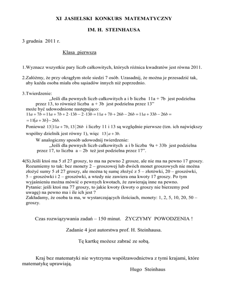 XI JASIELSKI KONKURS MATEMATYCZNY IM. H. STEINHAUSA 3 grudnia 2011 r. Klasa pierwsza 1.Wyznacz wszystkie pary liczb całkowitych, których różnica kwadratów jest równa 2011. 2.Załóżmy, że przy okrągłym stole siedzi 7 osób. Uzasadnij, że można je przesadzić tak, aby każda osoba miała obu sąsiadów innych niż poprzednio. 3.Twierdzenie: „Jeśli dla pewnych liczb całkowitych a i b liczba 11a + 7b jest podzielna przez 13, to również liczba a + 3b jest podzielna przez 13” może być udowodnione następująco: 11a 7b 11a 7b 2 13b 2 13b 11a 7b 26b 26b 11a 33b 26b 11a 3b 26b. Ponieważ 13 11a 7b, 13 26b i liczby 11 i 13 są względnie pierwsze (tzn. ich największy wspólny dzielnik jest równy 1), więc 13 a 3b. W analogiczny sposób udowodnij twierdzenie: „Jeśli dla pewnych liczb całkowitych a i b liczba 9a + 33b jest podzielna przez 17, to liczba a – 2b też jest podzielna przez 17”. 4(S).Jeśli ktoś ma 5 zł 27 groszy, to ma na pewno 2 grosze, ale nie ma na pewno 17 groszy. Rozumiemy to tak: bez monety 2 – groszowej lub dwóch monet groszowych nie można złożyć sumy 5 zł 27 groszy, ale można tę sumę złożyć z 5 – złotówki, 20 – groszówki, 5 – groszówki i 2 – groszówki, a wtedy nie zawiera ona kwoty 17 groszy. Po tym wyjaśnieniu można mówić o pewnych kwotach, że zawierają inne na pewno. Pytanie: jeśli ktoś ma 77 groszy, to jakie kwoty (kwoty o groszy nie bierzemy pod uwagę) na pewno ma i ile ich jest ? Zakładamy, że osoba ta ma, w wystarczających ilościach, monety: 1, 2, 5, 10, 20, 50 – groszy. Czas rozwiązywania zadań – 150 minut. ŻYCZYMY POWODZENIA ! Zadanie 4 jest autorstwa prof. H. Steinhausa. Tę kartkę możesz zabrać ze sobą. Kraj bez matematyki nie wytrzyma współzawodnictwa z tymi krajami, które matematykę uprawiają. Hugo Steinhaus XI JASIELSKI KONKURS MATEMATYCZNY IM. H. STEINHAUSA 3 grudnia 2011 r. Klasa druga 1.Zbadaj, czy istnieją liczby całkowite, których różnica sześcianów jest równa 2011. x 2 y 2 z 2 xy yz zx 2.Rozwiąż układ równań 10 x 20 y 30 z 1000. 3.W trójkącie ABC dane są długości trzech wysokości: h1 = 60, h2 = 65, h3 = 156. Oblicz długości boków tego trójkąta. 4(S).Jeśli ktoś ma 5 zł 27 groszy, to ma na pewno 2 grosze, ale nie ma na pewno 17 groszy. Rozumiemy to tak: bez monety 2 – groszowej lub dwóch monet groszowych nie można złożyć sumy 5 zł 27 groszy, ale można tę sumę złożyć z 5 – złotówki, 20 – groszówki, 5 – groszówki i 2 – groszówki, a wtedy nie zawiera ona kwoty 17 groszy. Po tym wyjaśnieniu można mówić o pewnych kwotach, że zawierają inne na pewno. Pytanie: jeśli ktoś ma 188 groszy, to jakie kwoty (kwoty 0 groszy nie bierzemy pod uwagę) na pewno ma i ile ich jest ? Zakładamy, że osoba ta ma, w wystarczających ilościach, monety: 1, 2, 5, 10, 20, 50 – groszy oraz 1 złoty. Czas rozwiązywania zadań – 150 minut. ŻYCZYMY POWODZENIA ! Zadanie 4 jest autorstwa prof. H. Steinhausa. Tę kartkę możesz zabrać ze sobą. Kraj bez matematyki nie wytrzyma współzawodnictwa z tymi krajami, które matematykę uprawiają. Hugo Steinhaus XI JASIELSKI KONKURS MATEMATYCZNY IM. H. STEINHAUSA 3 grudnia 2011 r. Klasa trzecia 1.Zbadaj, czy istnieją liczby całkowite, których różnica piątych potęg jest równa 2011. 2.Udowodnij, że równanie xy + yz + zx = 1 ma nieskończenie wiele rozwiązań w liczbach całkowitych. 3.W trójkącie prostokątnym ABC punkt C jest wierzchołkiem kąta prostego. Punkt ten połączono ze środkiem kwadratu zbudowanego na przeciwprostokątnej na zewnątrz trójkąta. Oblicz długość otrzymanego w ten sposób odcinka, jeśli suma długości przyprostokątnych trójkąta jest równa 2001. 4(S).Jeśli ktoś ma 5 zł 27 groszy, to ma na pewno 2 grosze, ale nie ma na pewno 17 groszy. Rozumiemy to tak: bez monety 2 – groszowej lub dwóch monet groszowych nie można złożyć sumy 5 zł 27 groszy, ale można tę sumę złożyć z 5 – złotówki, 20 – groszówki, 5 – groszówki i 2 – groszówki, a wtedy nie zawiera ona kwoty 17 groszy. Po tym wyjaśnieniu można mówić o pewnych kwotach, że zawierają inne na pewno. Pytanie: jeśli ktoś ma 199 groszy, to jakie kwoty (kwoty 0 groszy nie bierzemy pod uwagę) na pewno ma i ile ich jest ? Zakładamy, że osoba ta ma, w wystarczających ilościach, monety: 1, 2, 5, 10, 20, 50 – groszy oraz 1 złoty. Czas rozwiązywania zadań – 150 minut. ŻYCZYMY POWODZENIA ! Zadanie 4 jest autorstwa prof. H. Steinhausa. Tę kartkę możesz zabrać ze sobą. Kraj bez matematyki nie wytrzyma współzawodnictwa z tymi krajami, które matematykę uprawiają. Hugo Steinhaus