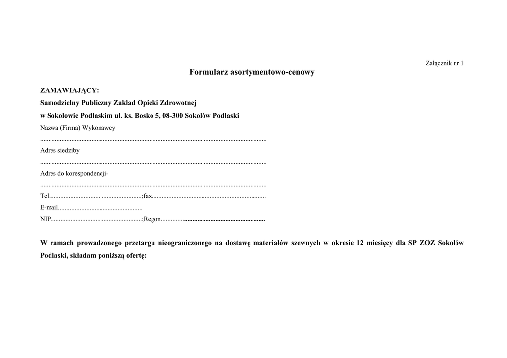 Załącznik nr 1 Formularz asortymentowo-cenowy ZAMAWIAJĄCY: Samodzielny Publiczny Zakład Opieki Zdrowotnej w Sokołowie Podlaskim ul. ks. Bosko 5, 08-300 Sokołów Podlaski Nazwa (Firma) Wykonawcy ......................................................................................................................................... Adres siedziby ......................................................................................................................................... Adres do korespondencji......................................................................................................................................... Tel........................................................;fax..................................................................... E-mail................................................... NIP.......................................................;Regon............................................................... W ramach prowadzonego przetargu nieograniczonego na dostawę materiałów szewnych w okresie 12 miesięcy dla SP ZOZ Sokołów Podlaski, składam poniższą ofertę: Zadanie nr 1 - szwy 1 Szew pleciony ,syntetyczny,powlekany,wchłanialny,mieszanina kwasu poliglikolowego i polimlekowego,czas podtrzymywania 21-35 dni,czas wchłaniania 50-80 dni,z igła o zwiększonej stabilności w imadle lub bez igły Lp Grubość Długość nitki nitki Opis igły j.m. 1 2 90 cm 50 mm.1/2 koła,okrągła saszetka 24 2 2 75 cm 45 mm1/2 koła,okrągła saszetka 24 3 1 75 cm 40 mm,1/2 koła,okrągła saszetka 900 4 1 75 cm 76 mm,1/2 koła,okrągła masywna saszetka 480 5 1 90 cm 40 mm,1/2 koła,okrągła saszetka 900 6 0 75 cm 36 mm,1/2 koła,okrągła saszetka 360 7 2/0 75 cm 30 mm,1/2 saszetka 720 koła ,okrągła 8 3/0 75 cm 30 mm,1/2 saszetka 720 koła ,okrągła 9 4/0 75 cm 20 mm,1/2 saszetka 180 koła ,okrągła 10 5/0 75 cm 20 mm,1/2 saszetka 180 koła ,okrągła RAZEM Przewidywan Cena Cena Wartość a ilość jednostko jednostko netto saszetek wa netto wa brutto VAT % Wartość brutto Nr Producent katalogowy / nazwa handlowa Próbki 5 szt 5 szt 5 szt Słownie wartość netto oferty:.............................................................................................................. Słownie wartość brutto oferty:............................................................................................................. Zadanie nr 2 - szwy 2 Szew pleciony,syntetyczny,powlekany,wchłanialny mieszanina kwasu poliglikolowego i polimlekowego czas podtrzymywania 21-35 dni Lp Grubość Długość nitki nitki Opis igły j.m. Przewidywa na ilość saszetek Cena Cena Wartość jednostko jednostko netto wa netto wa brutto 1 1 6x45 cm podwiązka saszetka 60 2 1 150 cm podwiązka saszetka 60 3 0 6x45 cm podwiązka saszetka 120 4 0 150 cm podwiązka saszetka 240 5 2/0 12x45 cm podwiązka saszetka 240 6 2/0 150 cm podwiązka saszetka 360 5szt 7 3/0 150 cm podwiązka saszetka 240 5szt 8 3/0 12x25 cm podwiązka saszetka 240 9 4/0 150 cm podwiązka saszetka 60 RAZEM Słownie wartość netto oferty:.............................................................................................................. Słownie wartość brutto oferty:............................................................................................................. VAT % Wartość brutto Nr Producent katalogowy / nazwa handlowa Próbki 5szt Zadanie nr 3 - szwy 3 Szew pleciony,syntetyczny,powlekany,wchłanialny mieszanina kwasu poliglikolowego czas podtrzymywania 21-35 dni;czas wchłaniania 56-90 dni z igłą o zwiększonej stabilności w imadle lub bez igły Lp Grubość Długość nitki nitki Opis igły j.m. Przewidywa na ilość saszetek 1 1 150 cm 65mm, 1/2 saszetka 240 koła, okrągła 2 1 90 cm 40mm, 1/2 saszetka 240 koła, okrągła 3 1 75 cm 30mm, 1/2 saszetka 60 koła, okrągła 4 0 75 cm 37mm 1/2 saszetka 120 koła, okrągła 5 2/0 75 cm 30mm, 1/2 saszetka 240 koła, okrągła 6 3/0 75 cm 30mm, 1/2 saszetka 240 koła, okrągła Cena Cena Wartość jednostko jednostko netto wa netto wa brutto RAZEM Słownie wartość netto oferty:.............................................................................................................. Słownie wartość brutto oferty:............................................................................................................. VAT % Wartość brutto Nr Producent katalogowy / nazwa handlowa Próbki 5szt 5szt Zadanie nr 4 - szwy 4 Szew pleciony, syntetyczny, powlekany, wchłanialny, mieszanina kwasu poliglikolowego czas podtrzymywania: 21 – 35 dni, czas wchłaniania: 56 – 90 dni z igłą o zwiększonej stabilności w imadle lub bez igły. Lp Grubość Długość nitki nitki Opis igły j.m. 1 1 30mm okrągła, igła w kształcie litery “J” (fish hook needle) saszetka 240 75 cm Przewidywa na ilość saszetek Cena Cena Wartość jednostko jednostko netto wa netto wa brutto VAT % Wartość brutto Nr Producent katalogowy / nazwa handlowa Próbki 5szt RAZEM Słownie wartość netto oferty:.............................................................................................................. Słownie wartość brutto oferty:............................................................................................................. Zadanie nr 5- szwy 5 Szew syntetyczny, monofilament, polipropylenowy o stałej średnicy z kontrolowanym rozciąganiem i plastycznym odkształcaniem węzła z igłą o zwiększonej stabilności w imadle Lp Grubość Długość nitki nitki Opis igły j.m. Przewidywa na ilość saszetek Cena Cena Wartość jednostko jednostko netto wa netto wa brutto VAT % Wartość brutto Nr Producent katalogowy / nazwa Próbki handlowa 1 2/0 75 cm okrągła30mm 1/2 koła, saszetka 96 2 3/0 90 cm saszetka 60 2x26 mm okrągła z grotem o 3 krawędziach ostrych,1/2 koła, igła do szycia naczyń zmienionych miażdżycowo 3 4/0 90 cm saszetka 60 2x20 mm okrągła z grotem o 3 krawędziach ostrych,1/2
