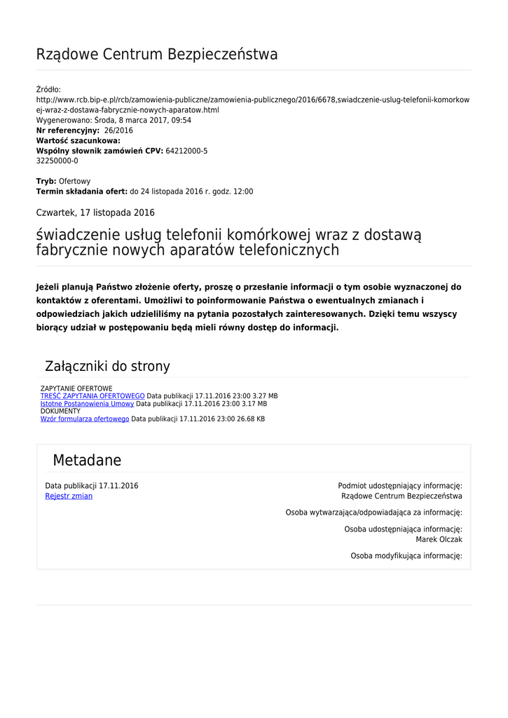 Rządowe Centrum Bezpieczeństwa Źródło: http://www.rcb.bip-e.pl/rcb/zamowienia-publiczne/zamowienia-publicznego/2016/6678,swiadczenie-uslug-telefonii-komorkow ej-wraz-z-dostawa-fabrycznie-nowych-aparatow.html Wygenerowano: Środa, 8 marca 2017, 09:54 Nr referencyjny: 26/2016 Wartość szacunkowa: Wspólny słownik zamówień CPV: 64212000-5 32250000-0 Tryb: Ofertowy Termin składania ofert: do 24 listopada 2016 r. godz. 12:00 Czwartek, 17 listopada 2016 świadczenie usług telefonii komórkowej wraz z dostawą fabrycznie nowych aparatów telefonicznych Jeżeli planują Państwo złożenie oferty, proszę o przesłanie informacji o tym osobie wyznaczonej do kontaktów z oferentami. Umożliwi to poinformowanie Państwa o ewentualnych zmianach i odpowiedziach jakich udzieliliśmy na pytania pozostałych zainteresowanych. Dzięki temu wszyscy biorący udział w postępowaniu będą mieli równy dostęp do informacji. Załączniki do strony ZAPYTANIE OFERTOWE TREŚĆ ZAPYTANIA OFERTOWEGO Data publikacji 17.11.2016 23:00 3.27 MB Istotne Postanowienia Umowy Data publikacji 17.11.2016 23:00 3.17 MB DOKUMENTY Wzór formularza ofertowego Data publikacji 17.11.2016 23:00 26.68 KB Metadane Data publikacji 17.11.2016 Rejestr zmian Podmiot udostępniający informację: Rządowe Centrum Bezpieczeństwa Osoba wytwarzająca/odpowiadająca za informację: Osoba udostępniająca informację: Marek Olczak Osoba modyfikująca informację: